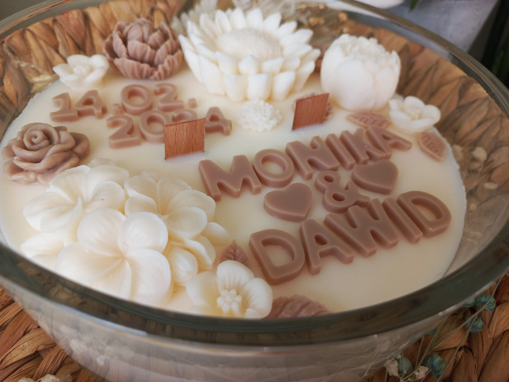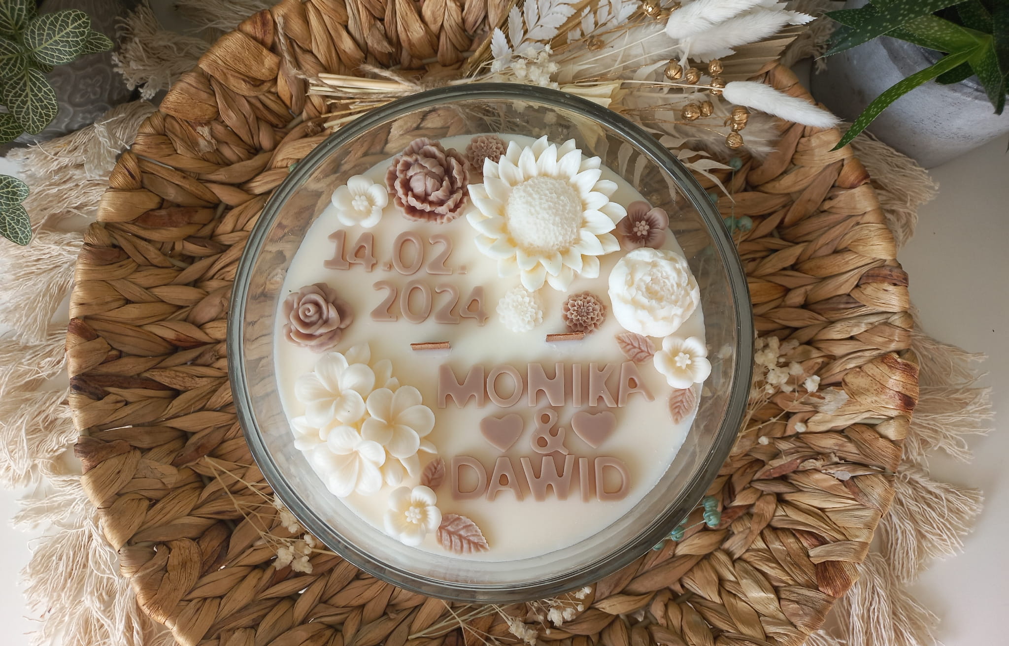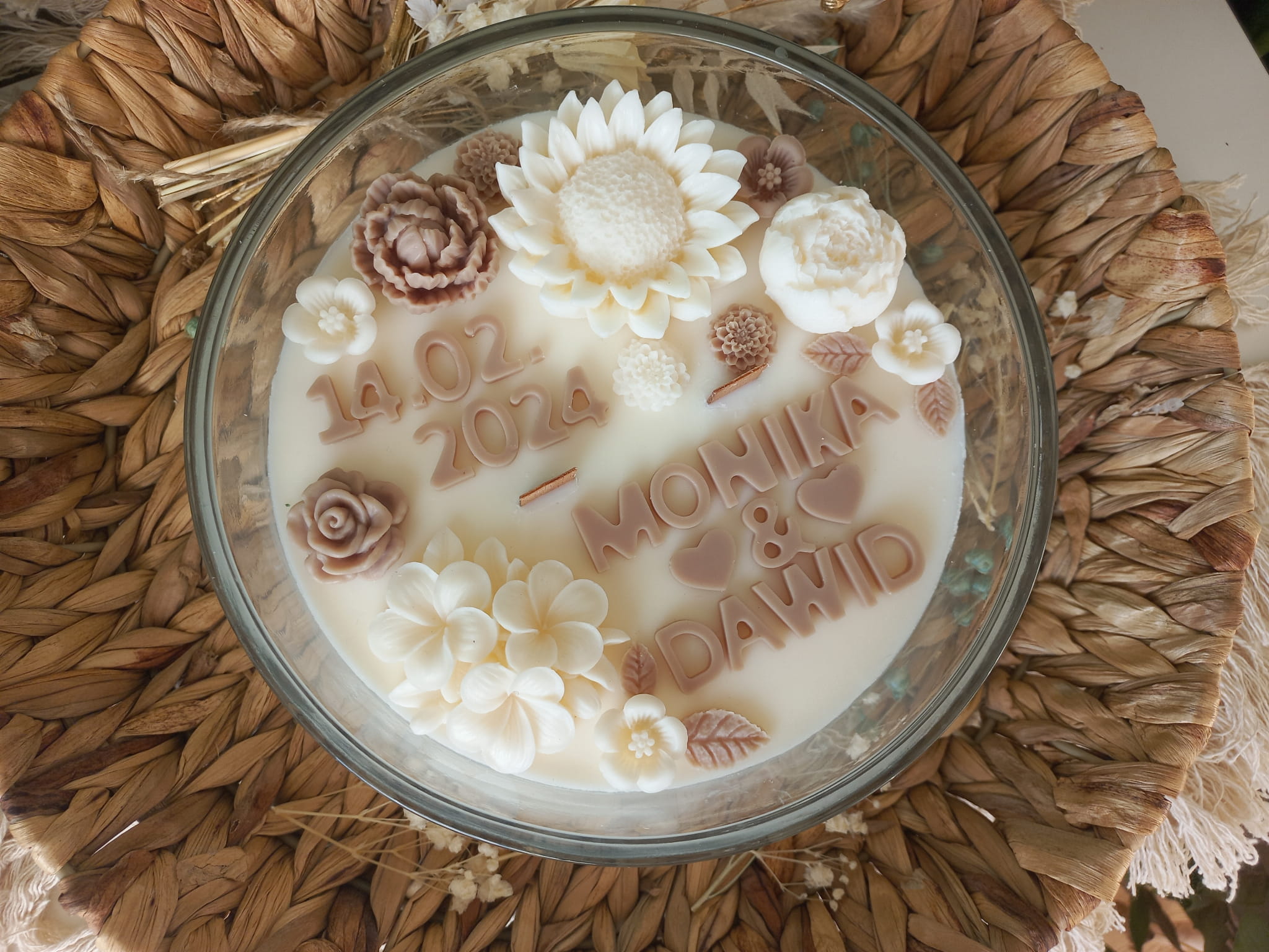 Świeca sojowa ozdobiona kwiatami oraz napisem będzie cudowną dekoracją a także wyjątkowym prezentem z okazji np. ślubu czy rocznicy.