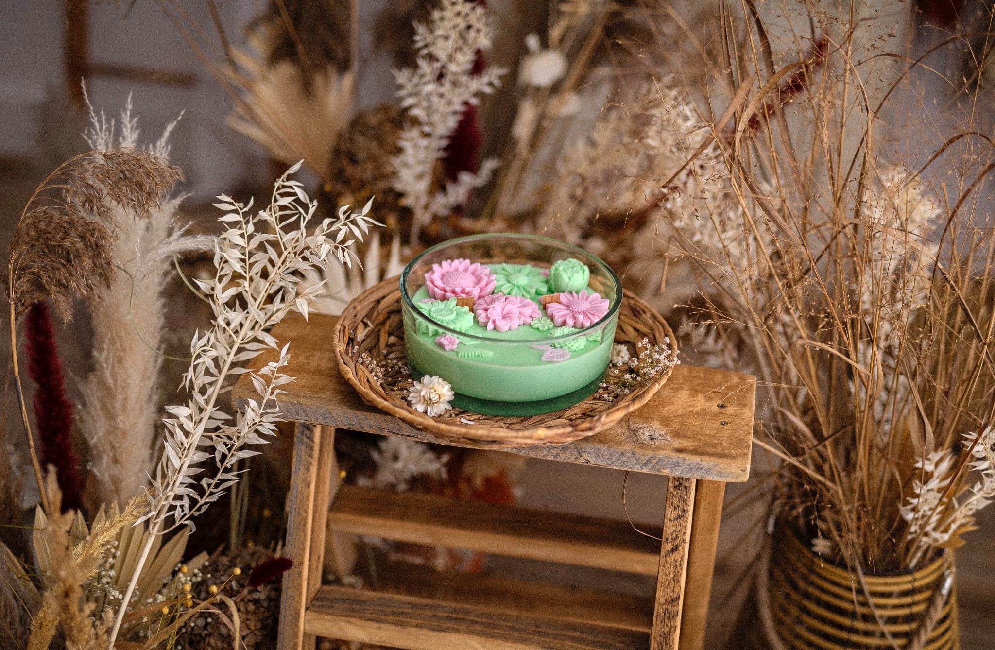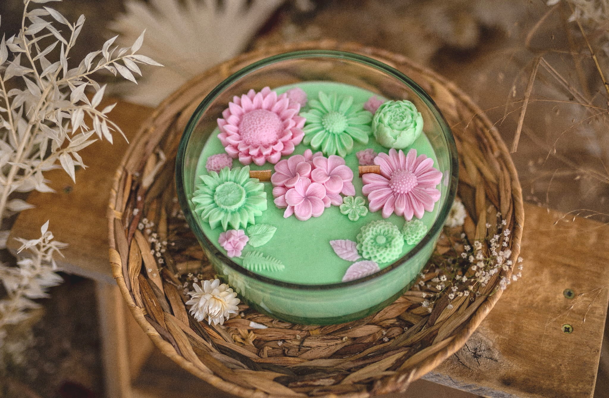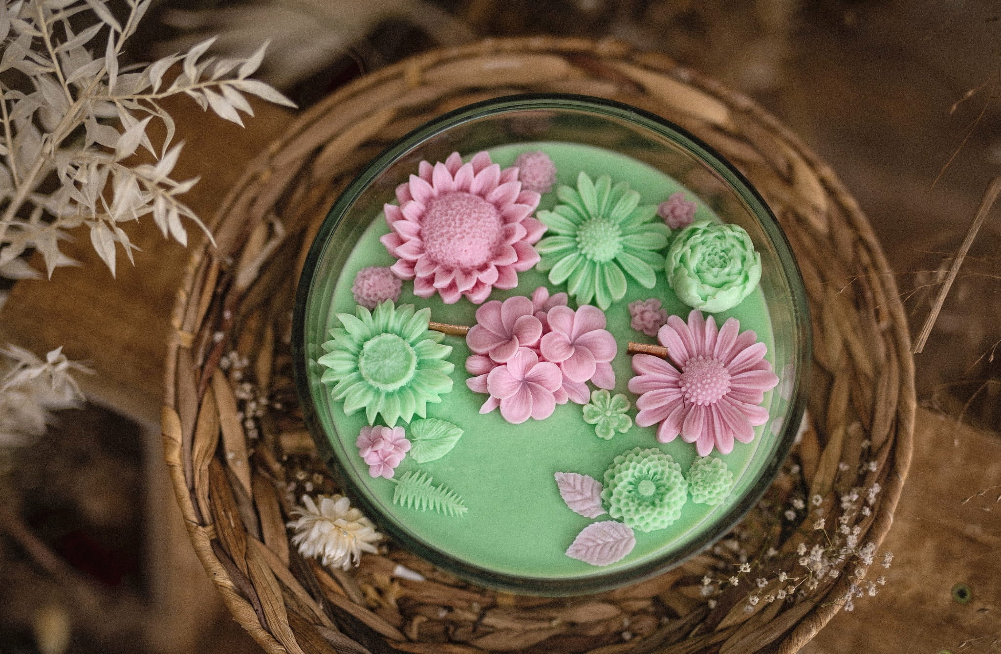 Świeca sojowa ozdobiona kwiatami będzie cudowną dekoracją każdego wnętrza. Idealnie sprawdzi się na prezent dla ukochanej osoby.