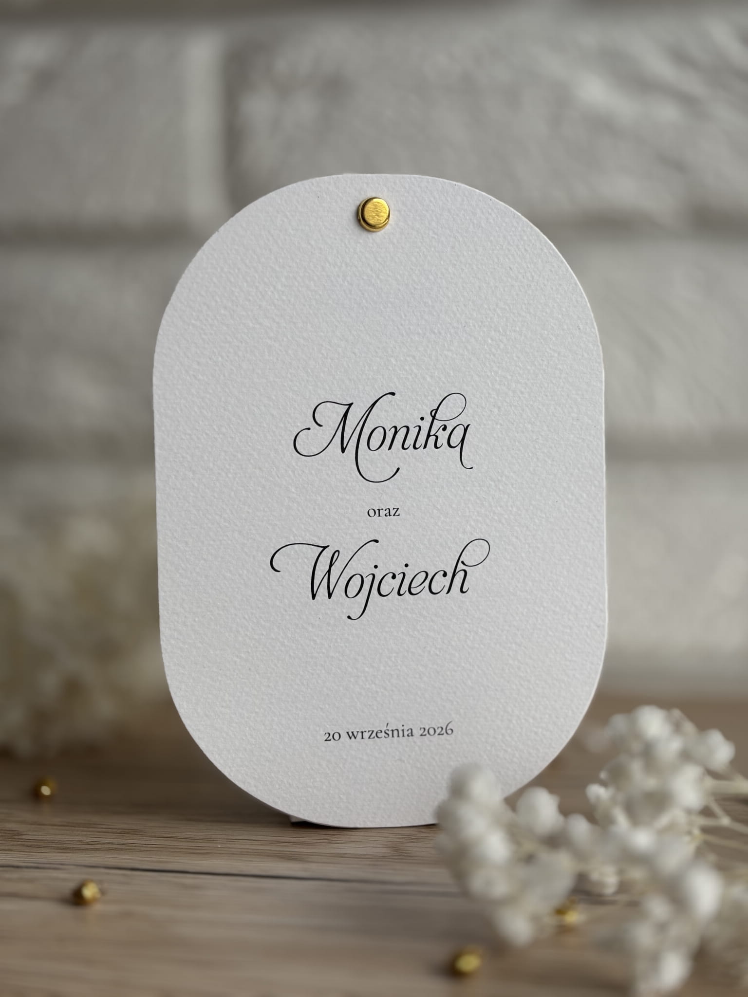 Minimalistyczne zaproszenia ślubne o owalnym kształcie to propozycja dla par, które cenią ponadczasową elegancję i subtelną estetykę. Wykonane z wysokiej jakości, grubego papieru o delikatnej fakturze, zachwycają prostotą i starannością wykonania. Klasyczna biel w połączeniu z ozdobną kaligrafią nadaje całości niezwykle romantyczny i luksusowy charakter.