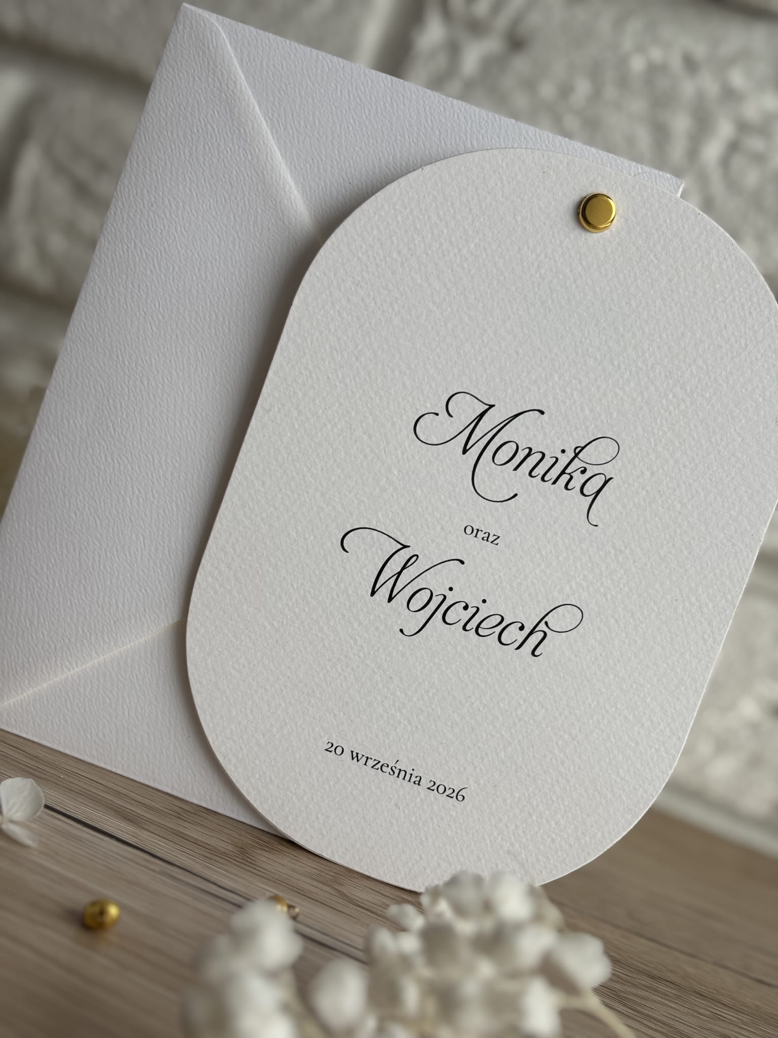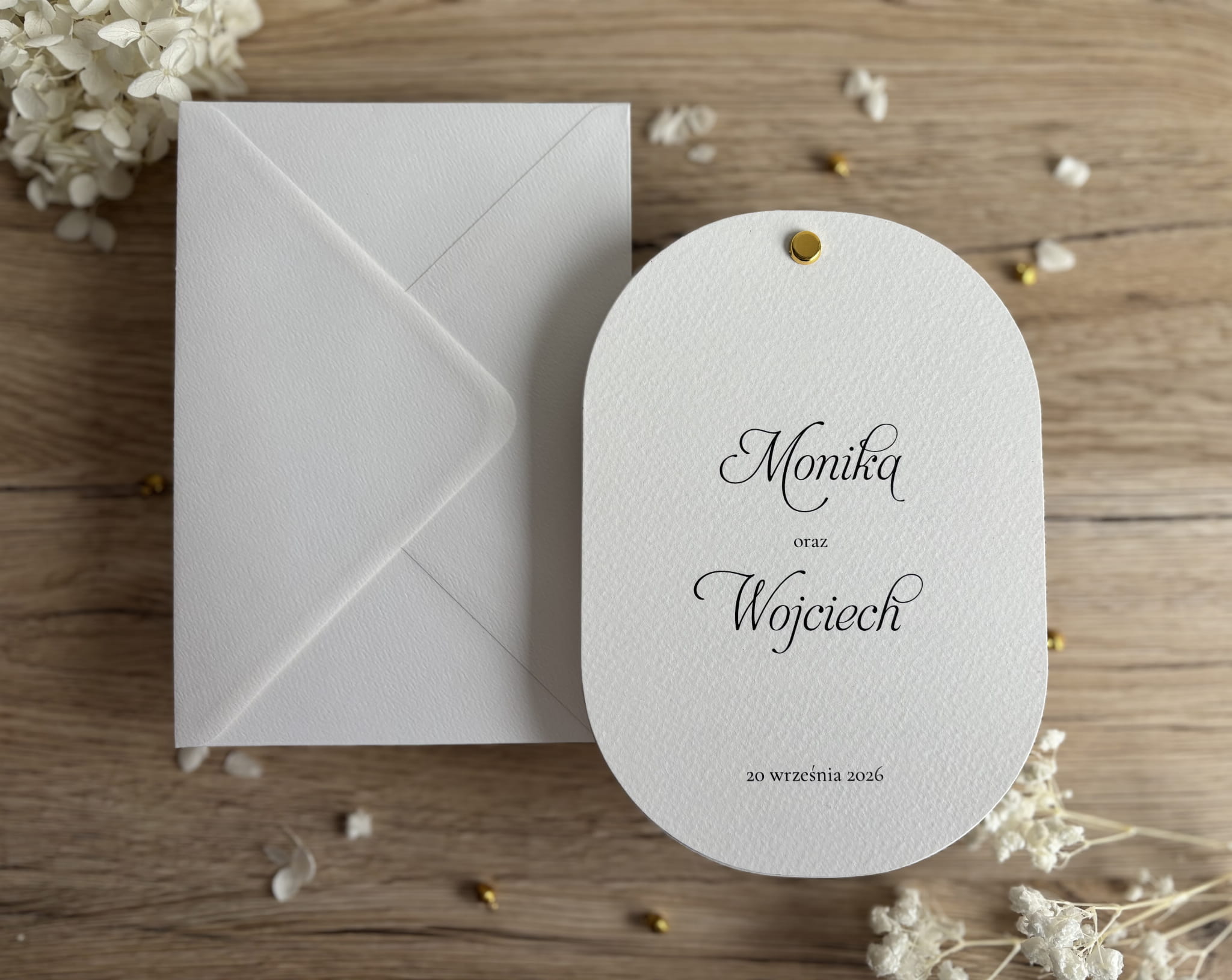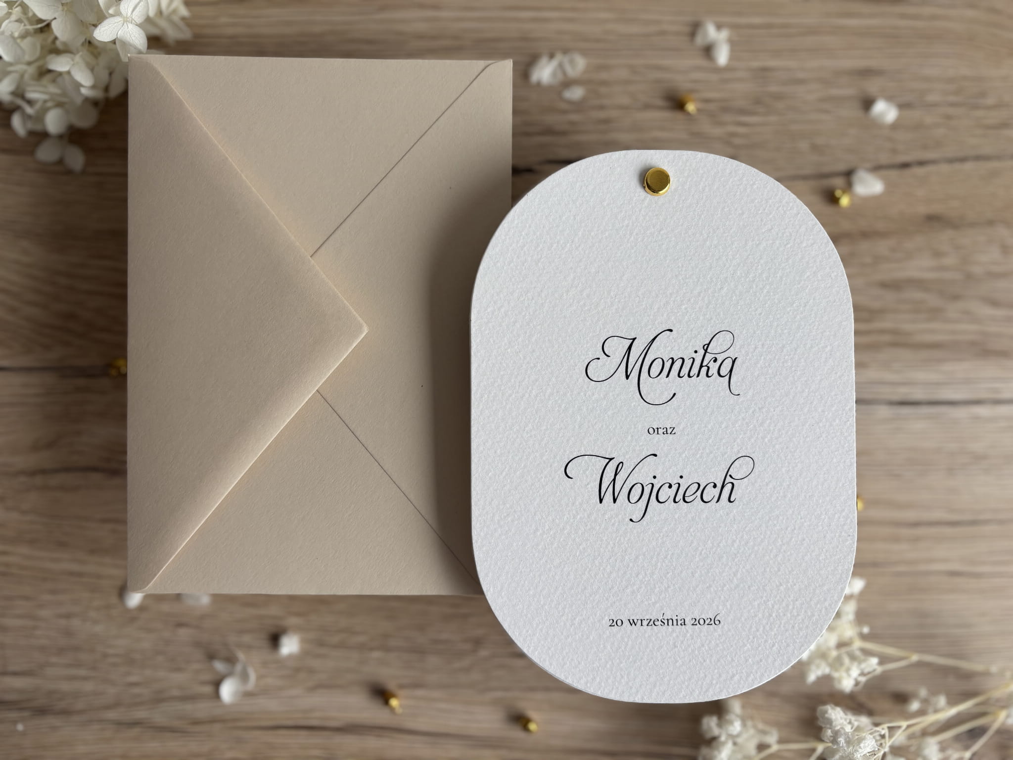 Zaproszenie połączone jest złotym nitem, który stanowi elegancki detal i pięknie dopełnia minimalistyczny design. Całość uzupełnia dopasowana koperta w jasnym odcieniu, idealnie komponująca się z naturalnym, stonowanym stylem ceremonii. To idealny wybór na ślub w stylu klasycznym, nowoczesnym, rustykalnym lub boho.