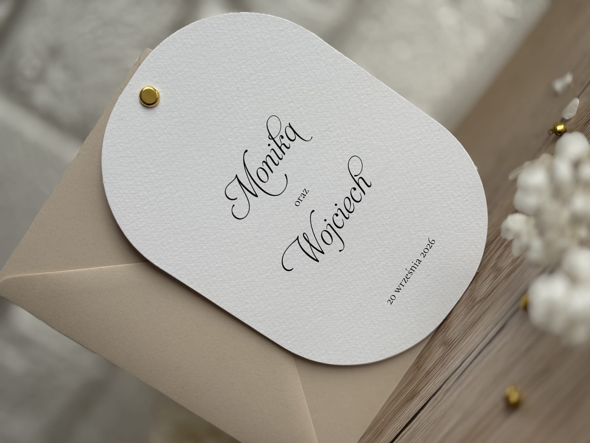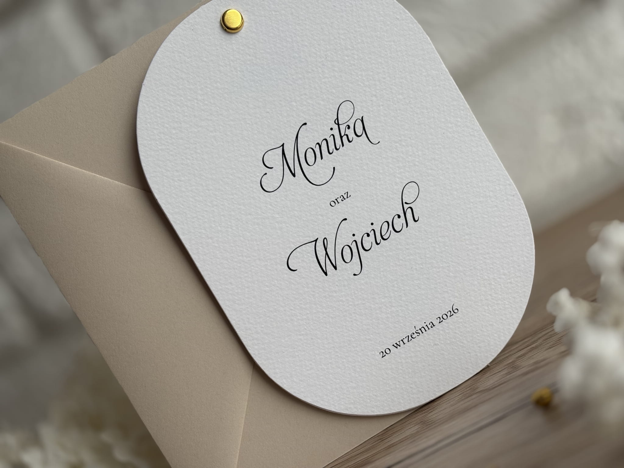 Eleganckie zaproszenia ślubne minimalistyczne – owalne, z kaligrafią