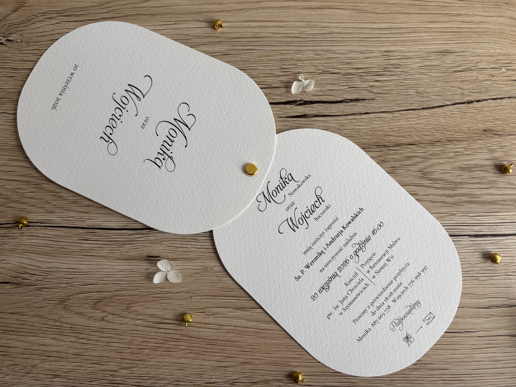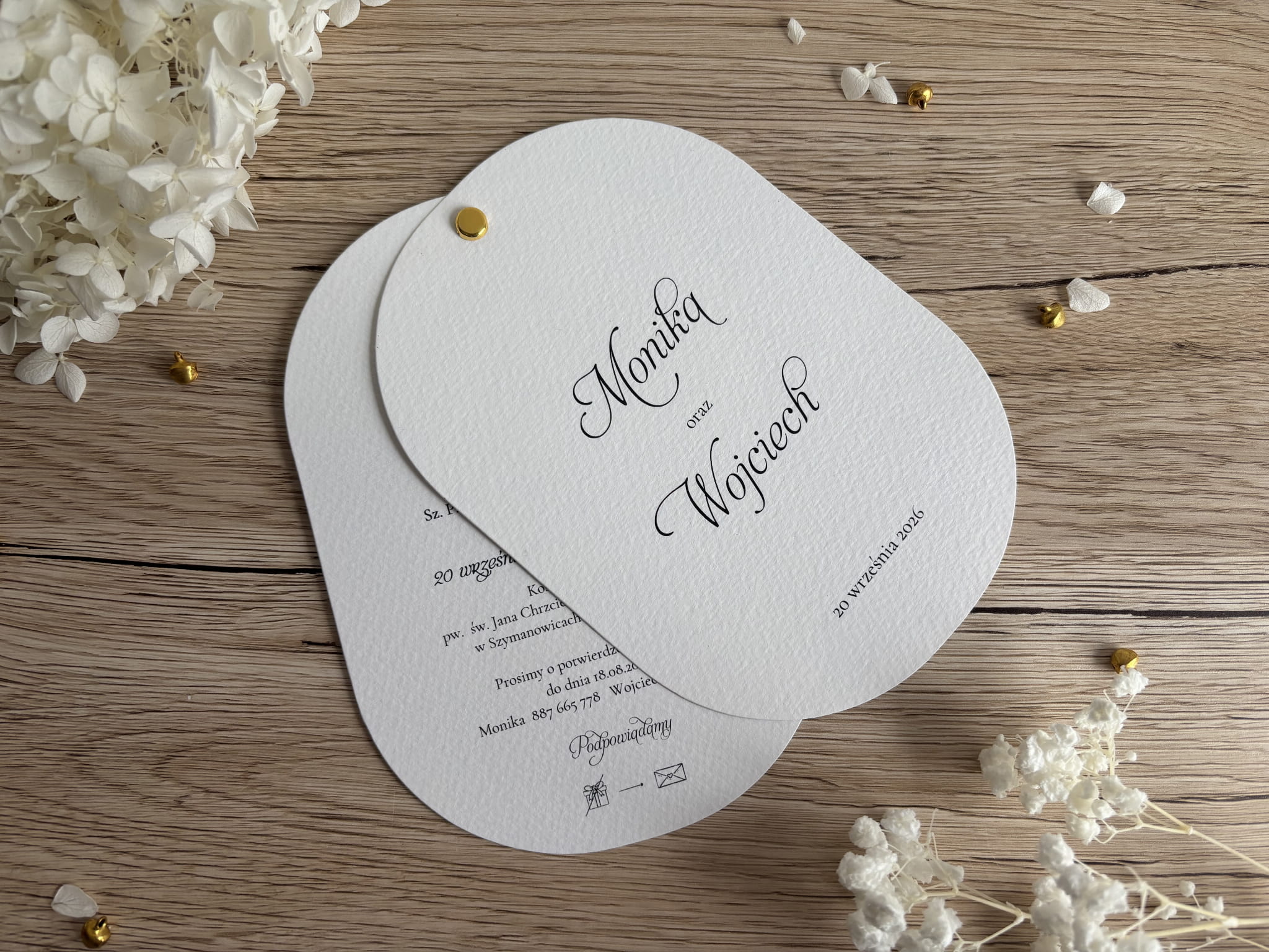 Zaproszenia są w pełni personalizowane – imiona Pary Młodej, data uroczystości oraz treść zaproszenia drukowane są z najwyższą dbałością o detale. Doskonale sprawdzą się jako pierwsza zapowiedź wyjątkowego dnia i pozostaną piękną pamiątką dla gości.