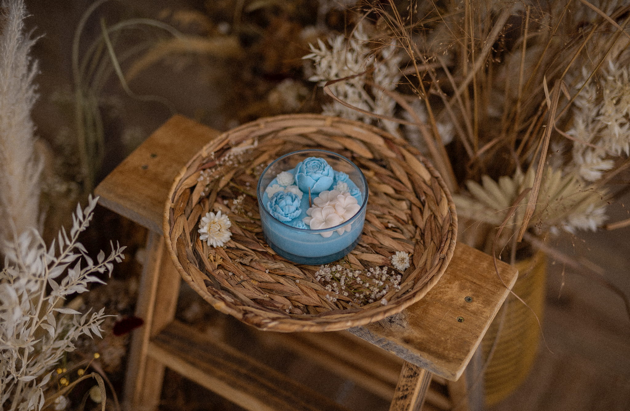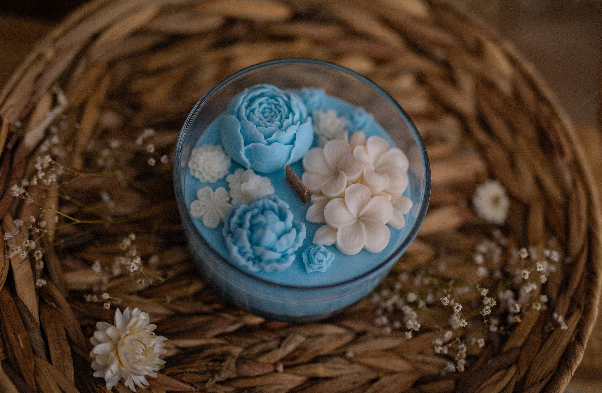 Mała świeca sojowa z kwiatami kremowo-niebieskimi -150g
