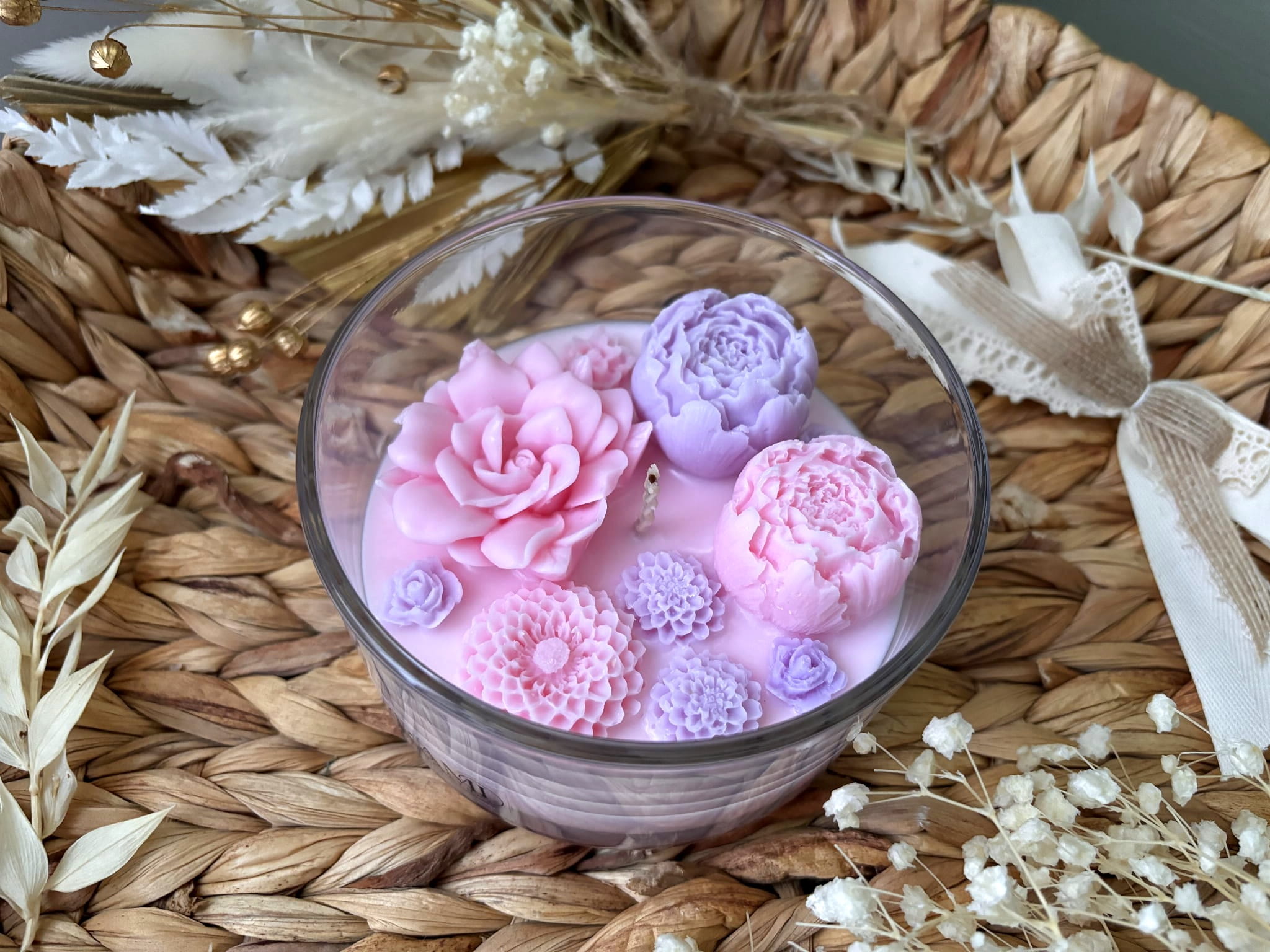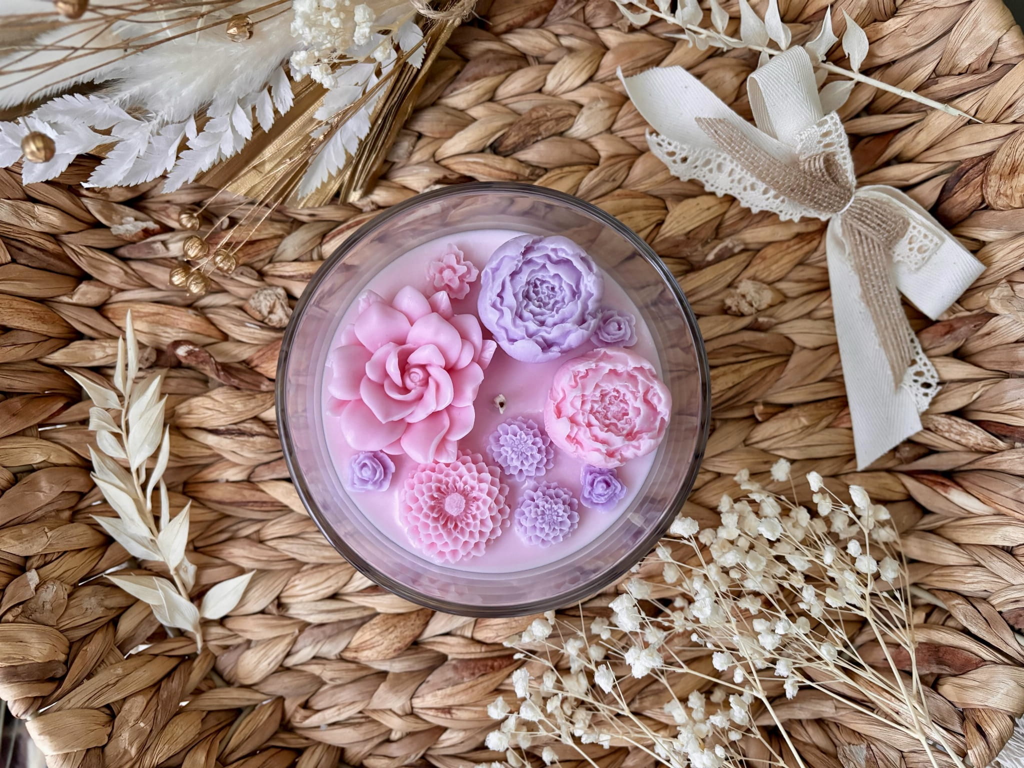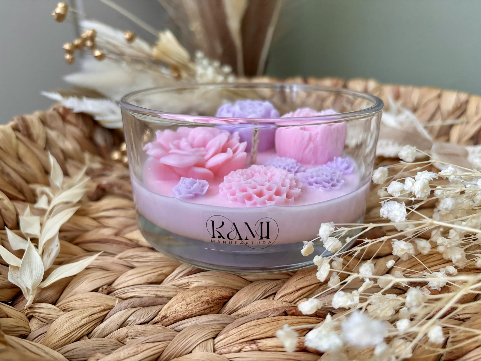 Świeca sojowa ozdobiona kwiatami będzie cudowną dekoracją każdego wnętrza. Idealnie sprawdzi się na prezent dla ukochanej osoby.
