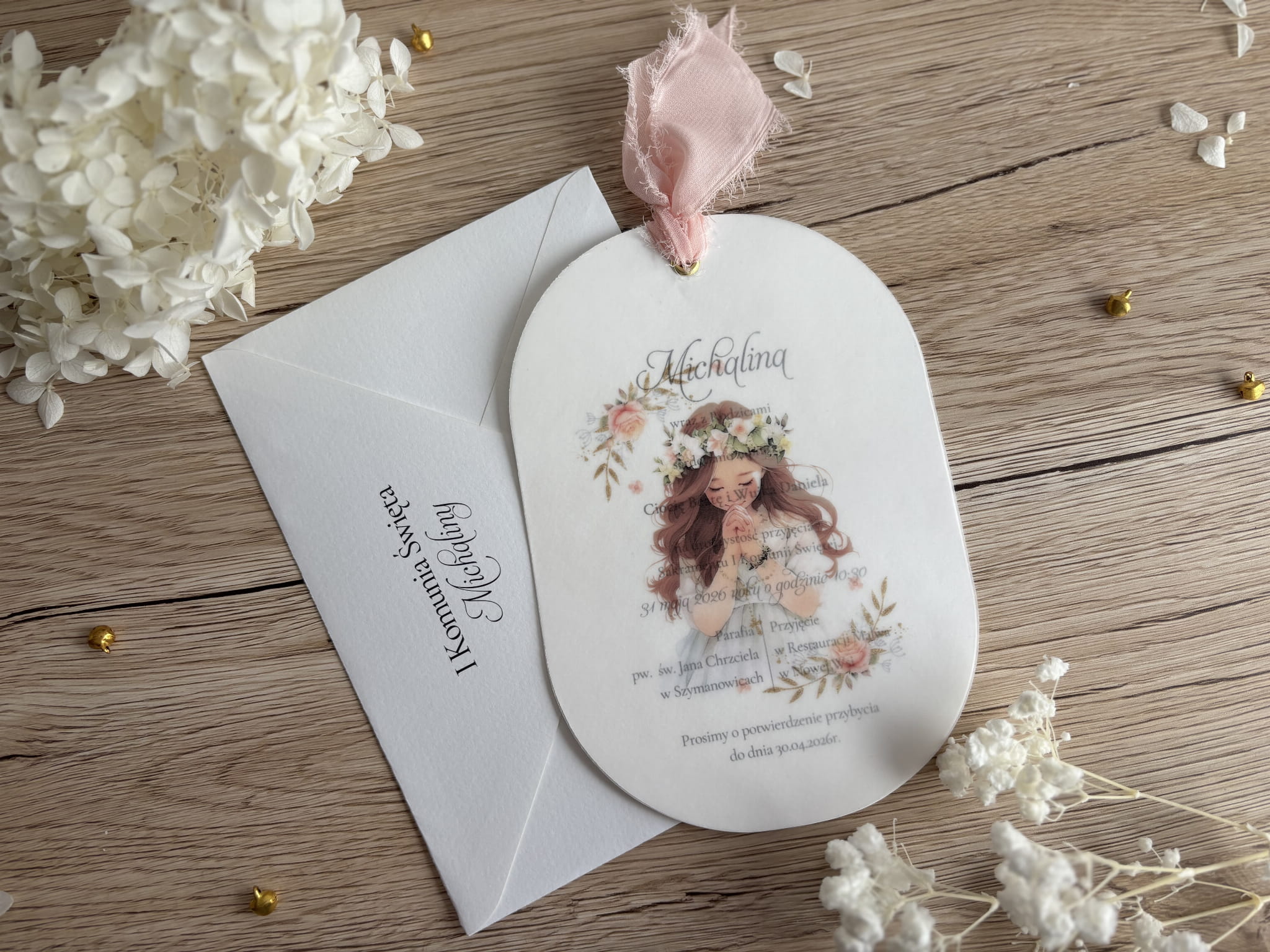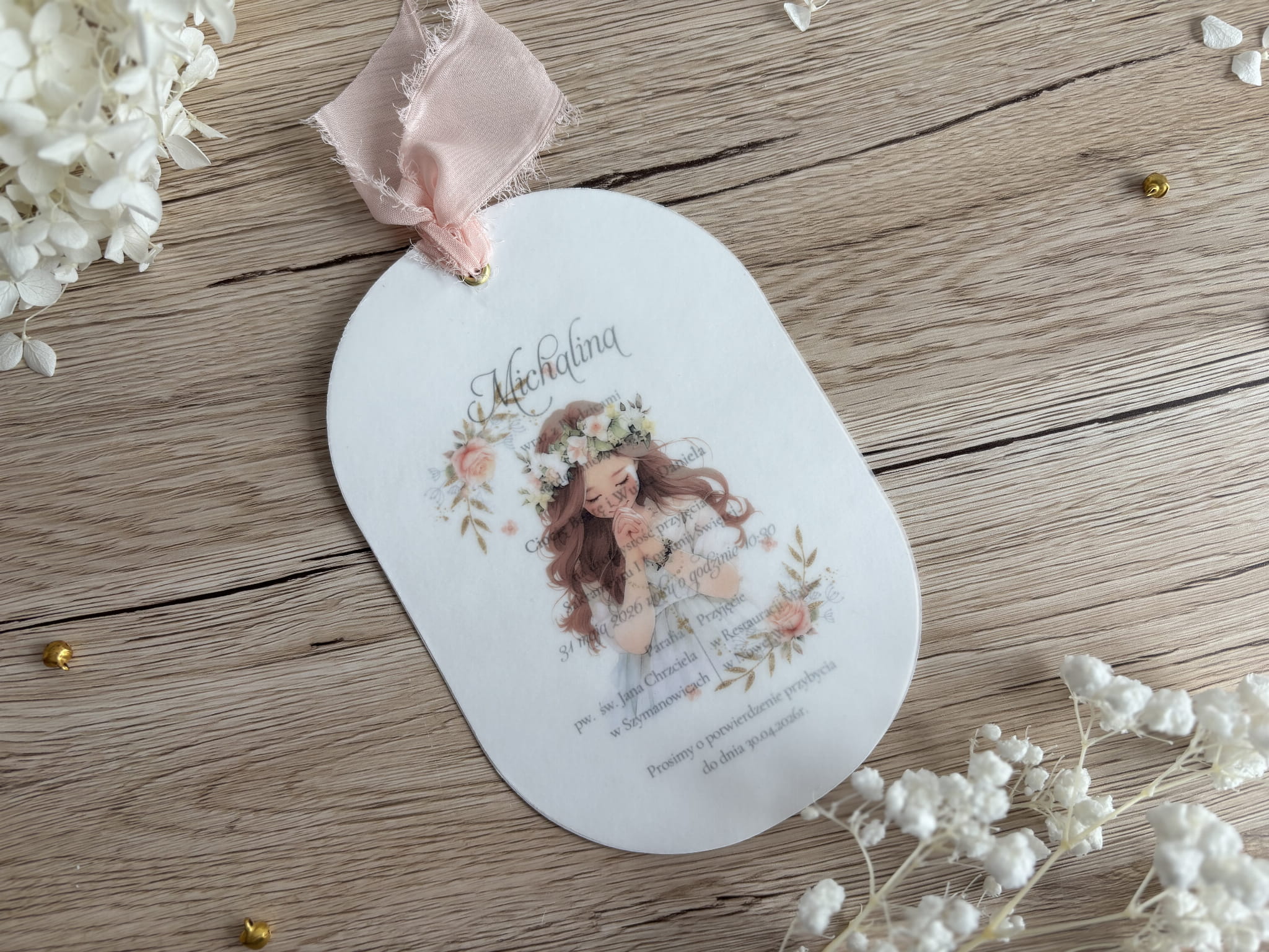 Owalne zaproszenie na Pierwszą Komunię Świętą dla dziewczynki – subtelna ilustracja i różowa wstążka