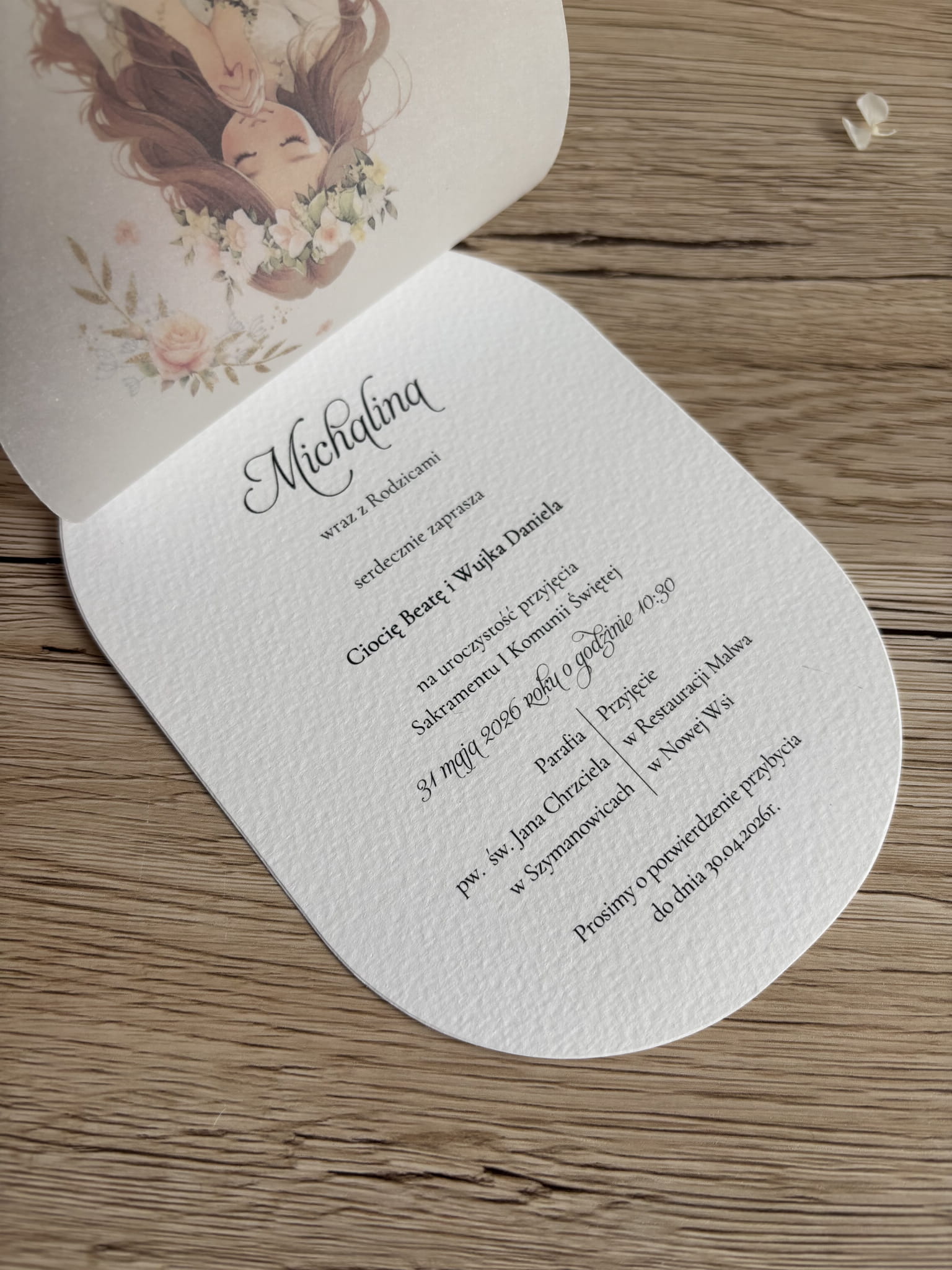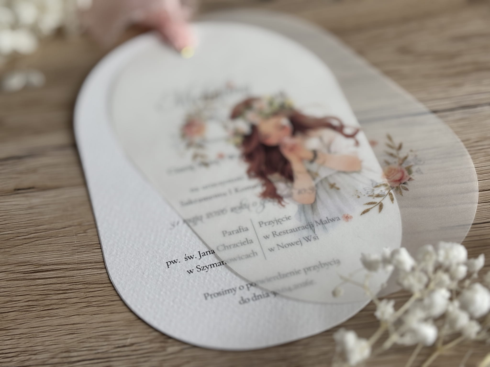 Wyjątkowe zaproszenie na Pierwszą Komunię Świętą dla dziewczynki, które zachwyca delikatnością, romantycznym stylem i artystycznym wykończeniem. Okrągła forma zaproszenia nadaje mu niepowtarzalnego charakteru i sprawia, że już od pierwszego spojrzenia wyróżnia się na tle klasycznych projektów.