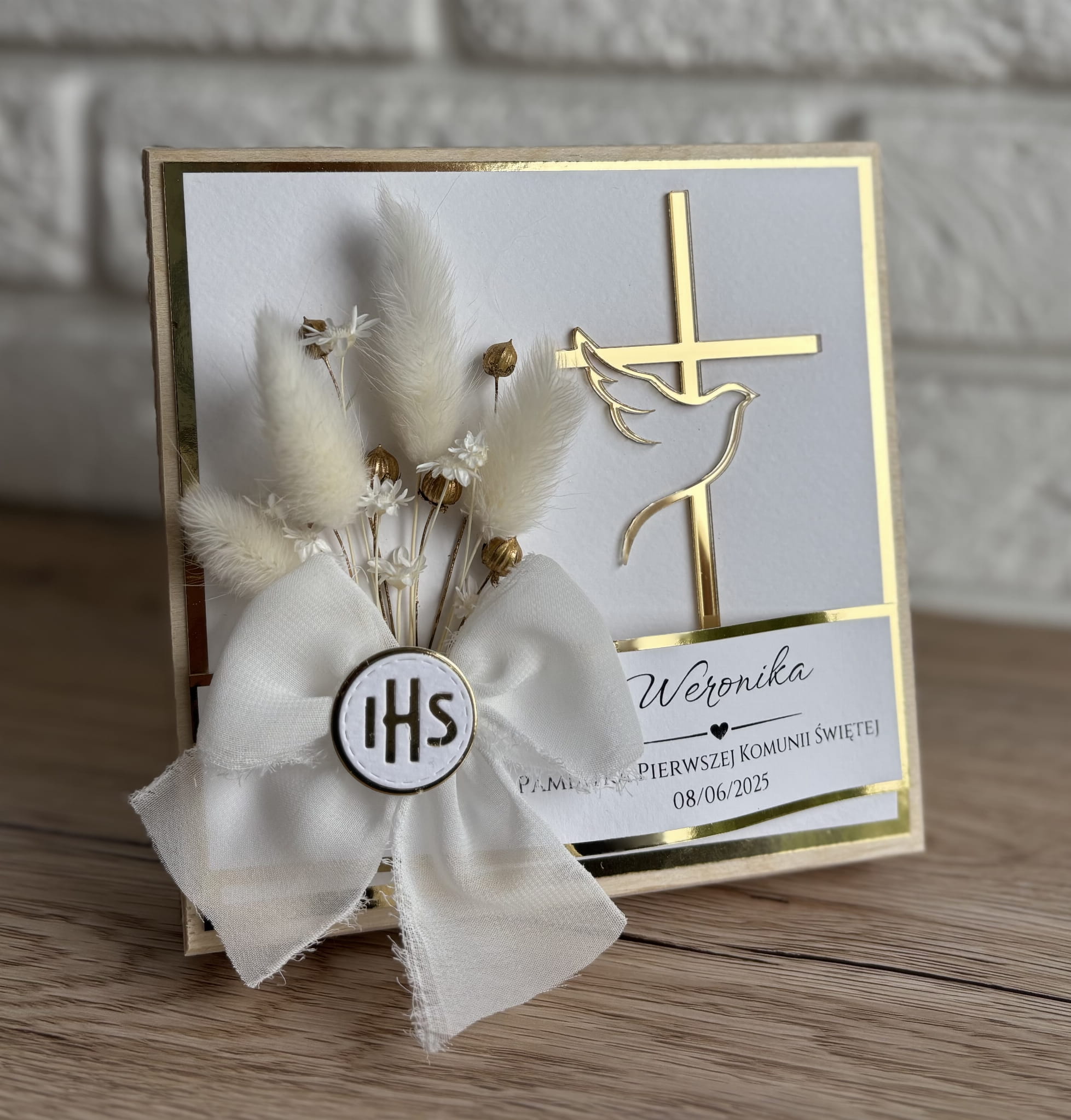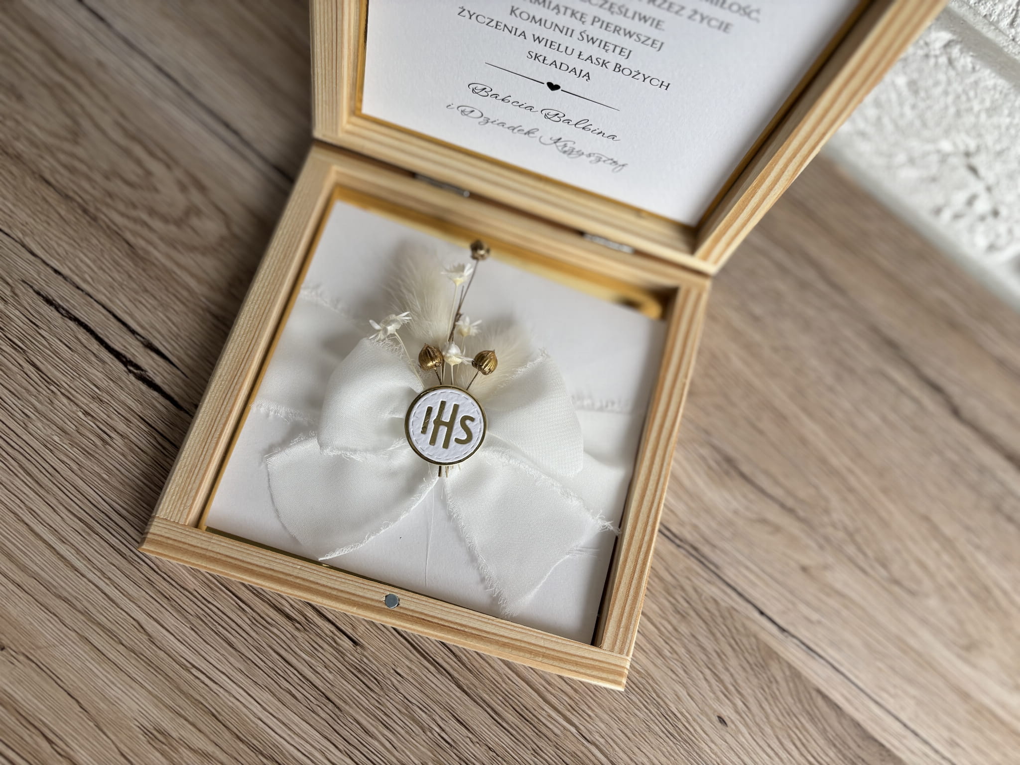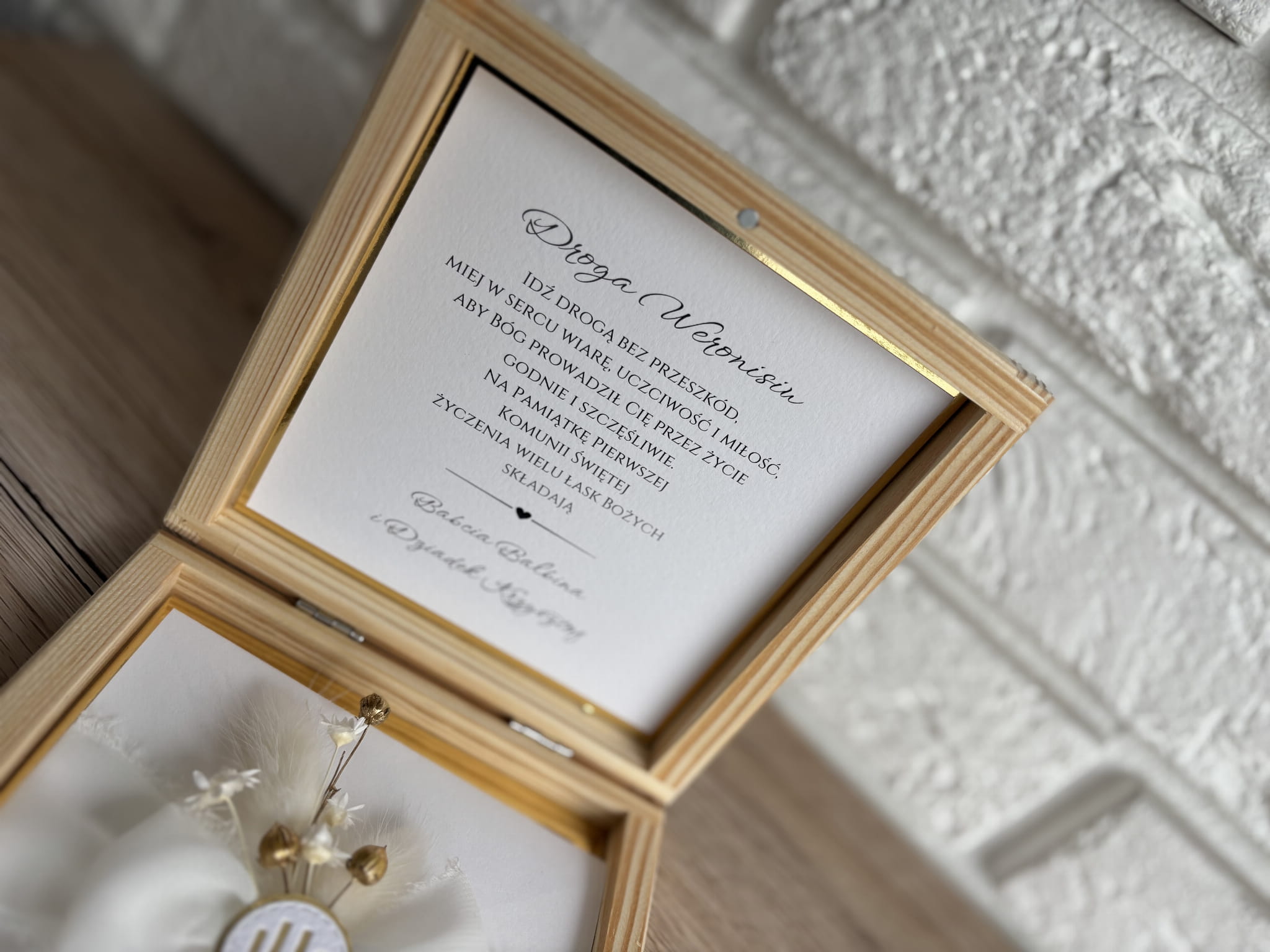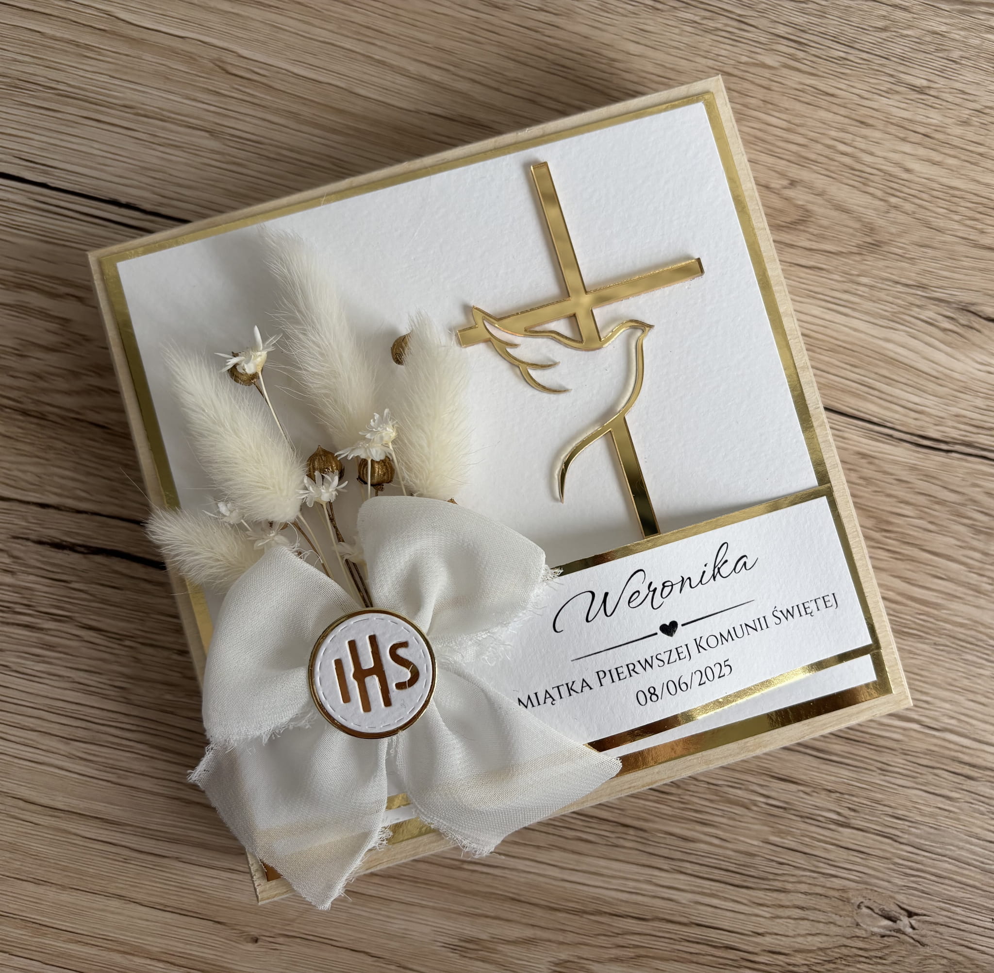 Wykonane z naturalnego drewna, pudełko zostało starannie ozdobione papierowymi kompozycjami w odcieniach kremowego i złota. Dekoracje tworzą delikatne kwiaty, kokardka oraz komunijne symbol gołębia. Całość utrzymana jest w eleganckim, subtelnym stylu, idealnym na tę okazję.