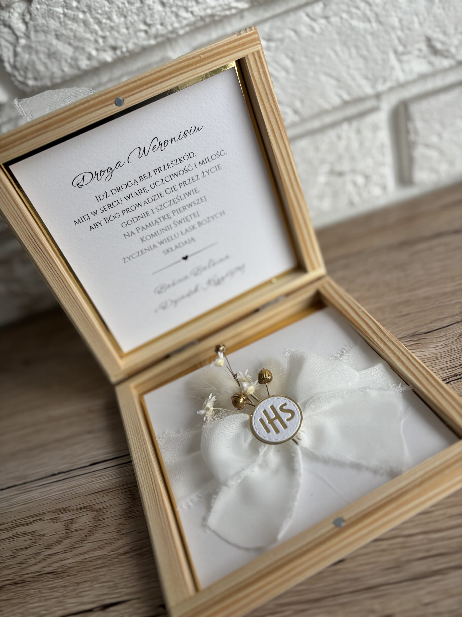 Wyjątkowe drewniane pudełko pamiątkowe Pierwszej Komunii Świętej lub chrztu świętego, ręcznie zdobione techniką scrapbookingu, to niepowtarzalna pamiątka tego ważnego dnia.