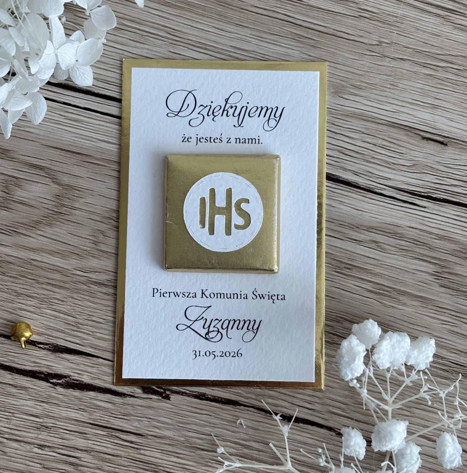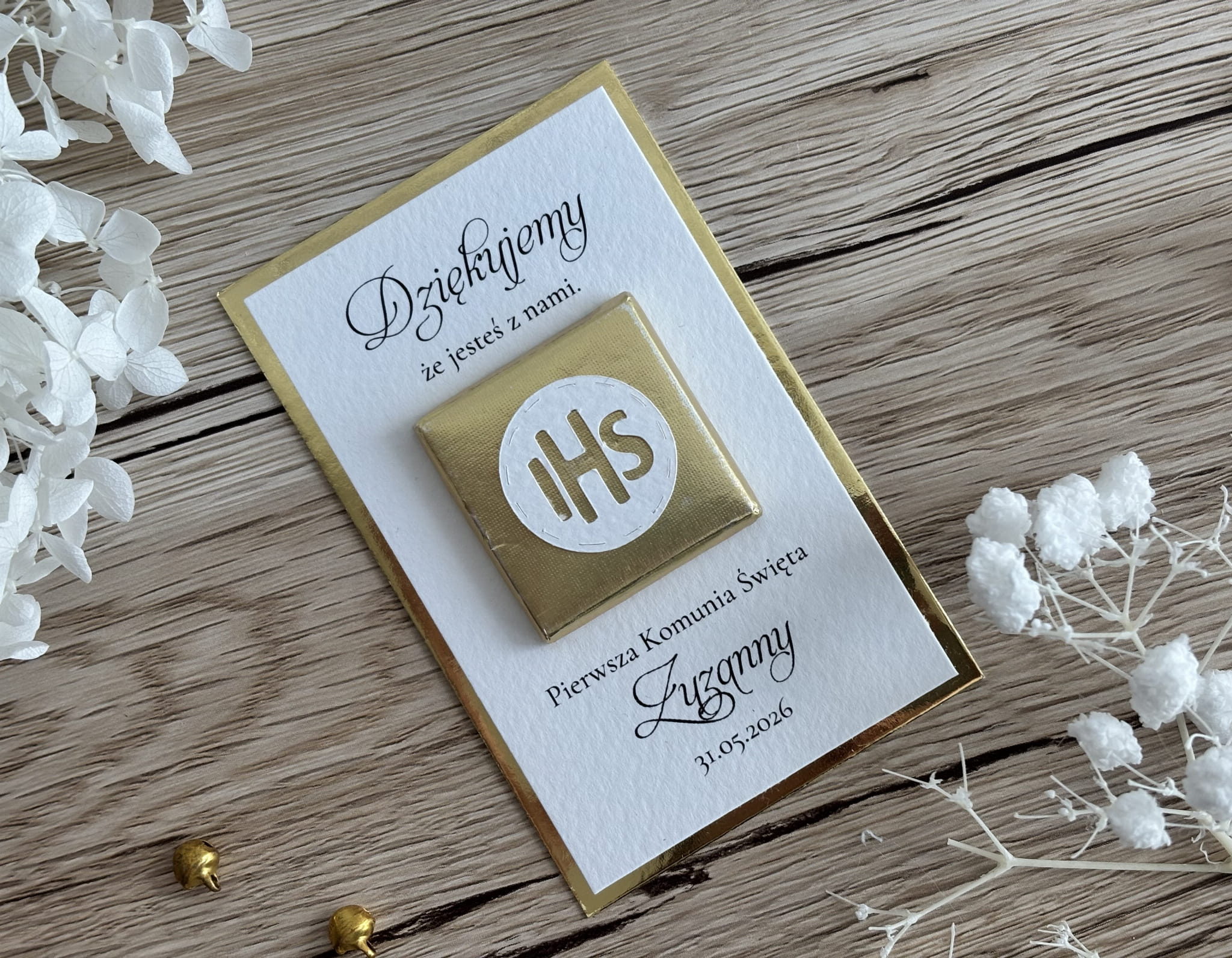 Podziękowania dla gości Komunia Święta z czekoladką IHS – elegancki upominek personalizowany