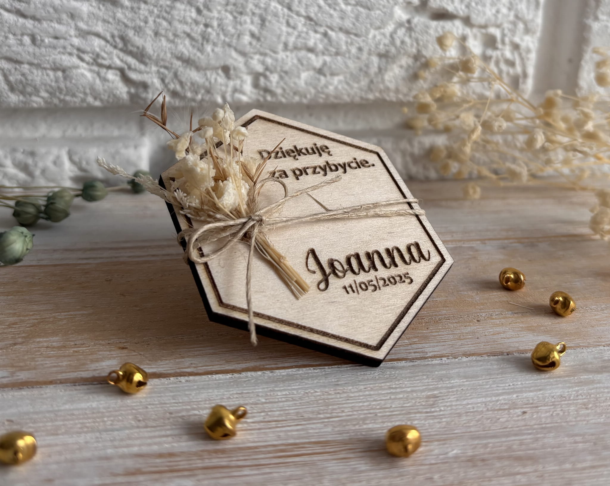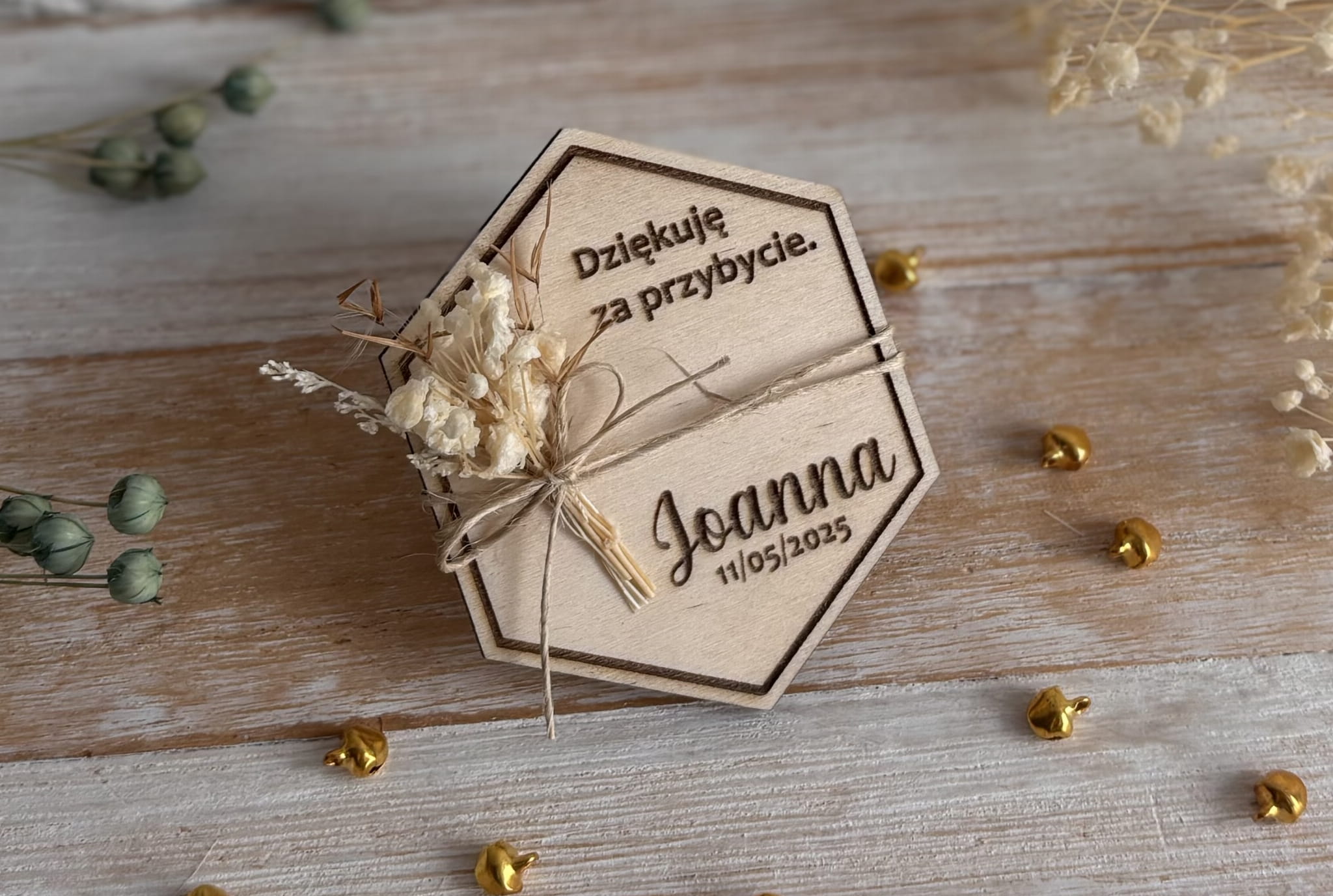 Magnes ze sklejki z indywidualnym napisem to idealna forma podziękowania dla gości. Mały gadżet o niezwykłej wartości sentymentalnej sprawi, że każdy z zaproszonych gości poczuje się doceniony a wyjątkowa uroczystość Pierwszej Komunii Świętej, Chrztu, Ślubu, Roczku zostanie odpowiednio zaakcentowana.