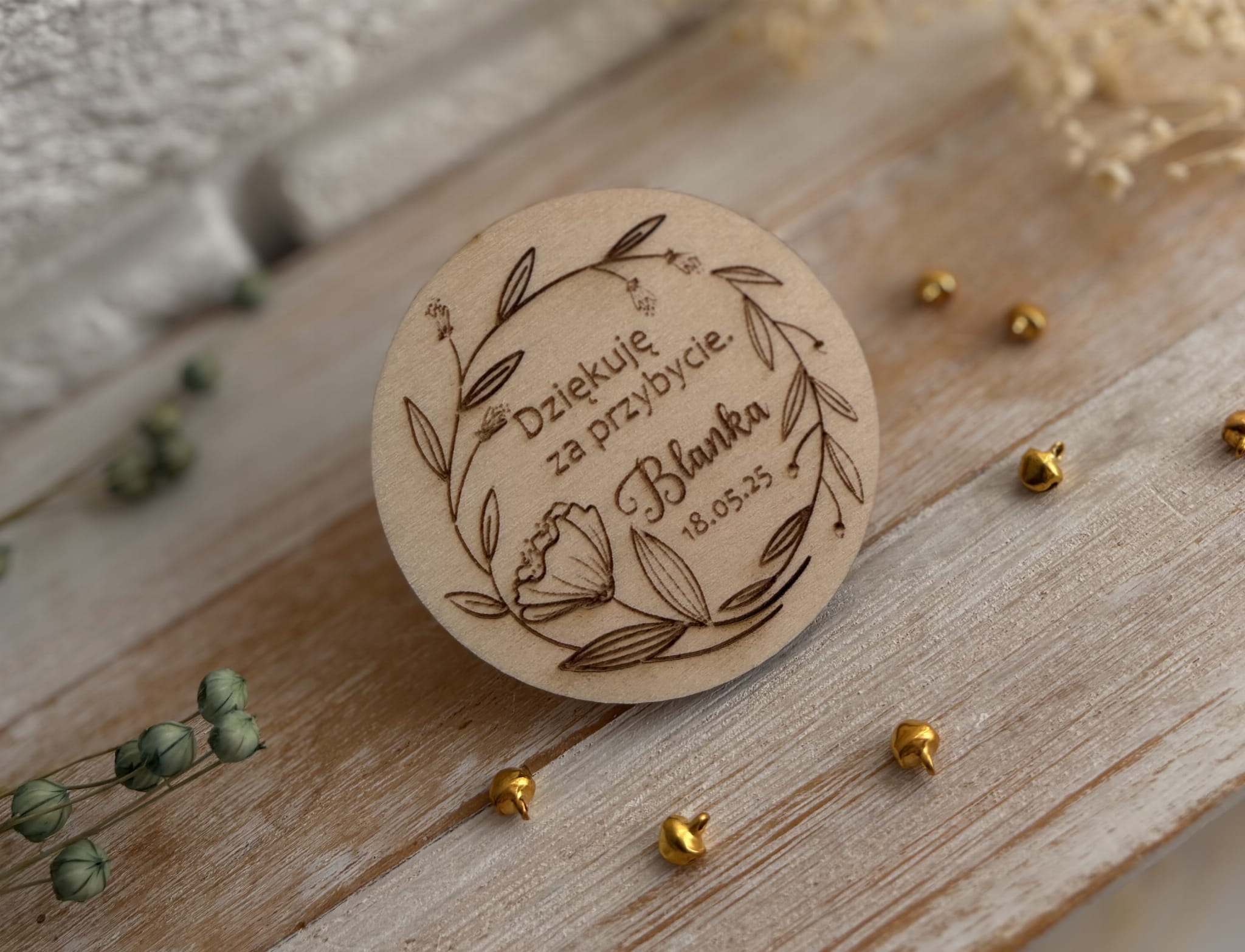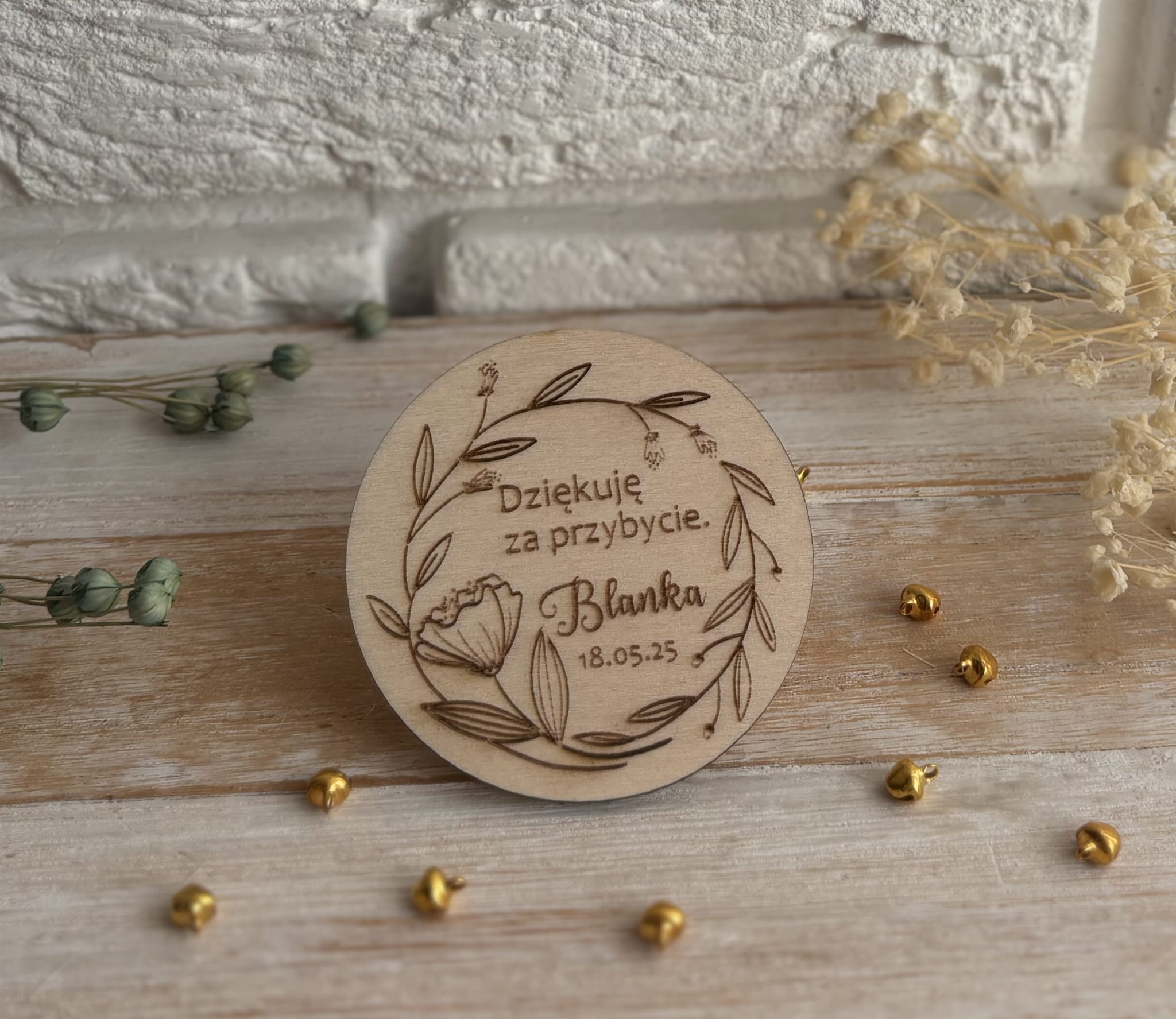 Magnes ze sklejki z indywidualnym napisem to idealna forma podziękowania dla gości. Mały gadżet o niezwykłej wartości sentymentalnej sprawi, że każdy z zaproszonych gości poczuje się doceniony a wyjątkowa uroczystość Pierwszej Komunii Świętej, Chrztu, Ślubu, Roczku zostanie odpowiednio zaakcentowana.