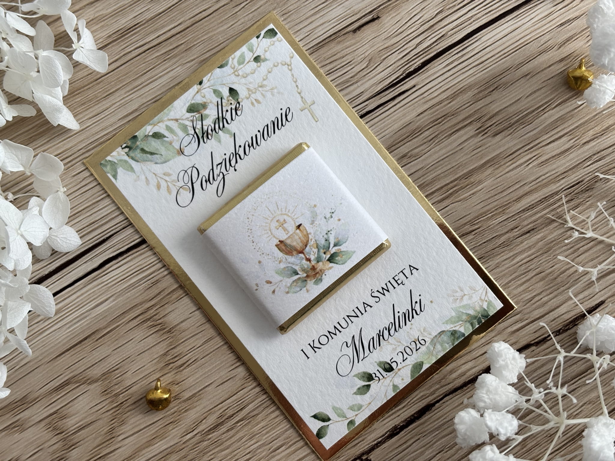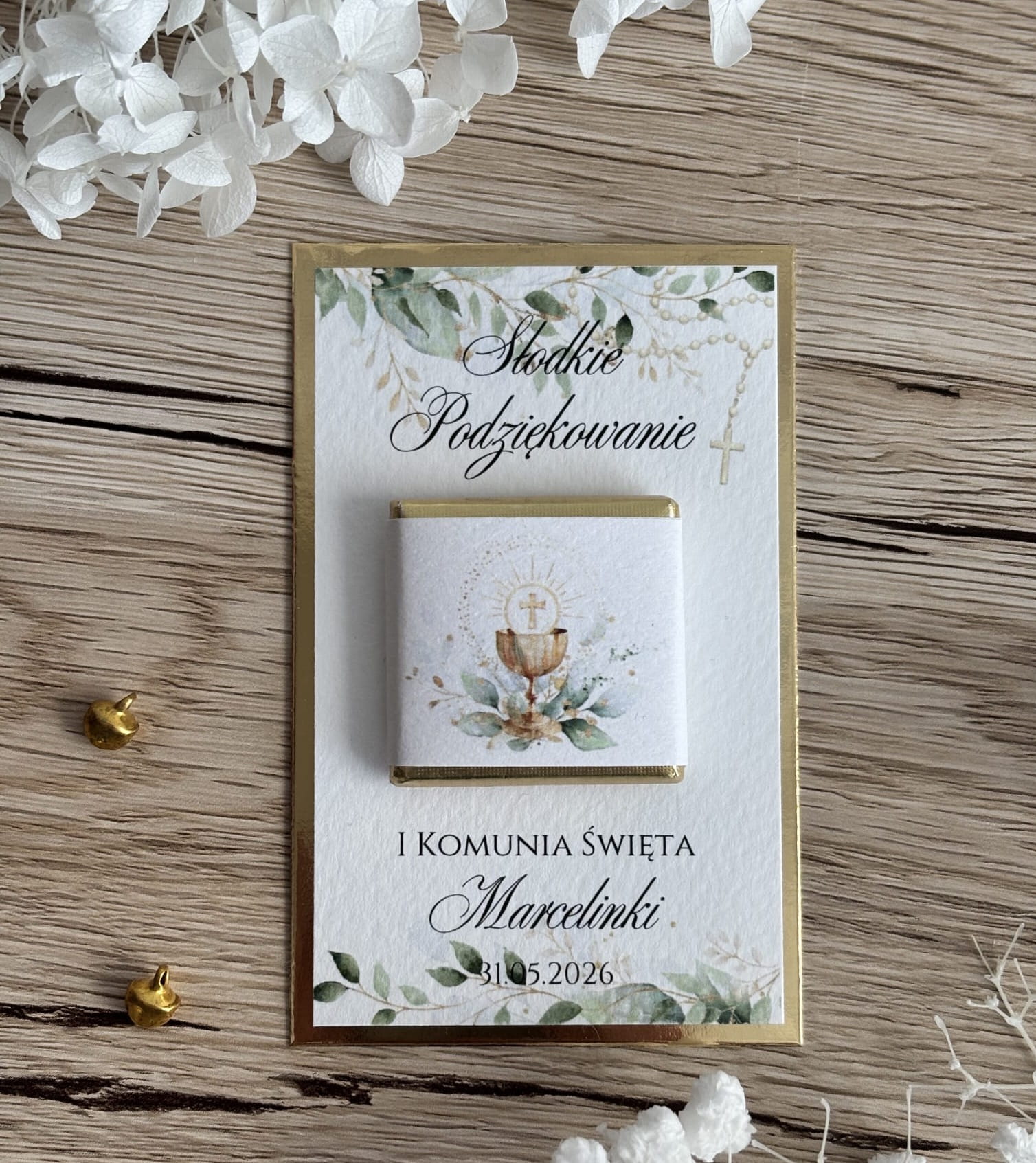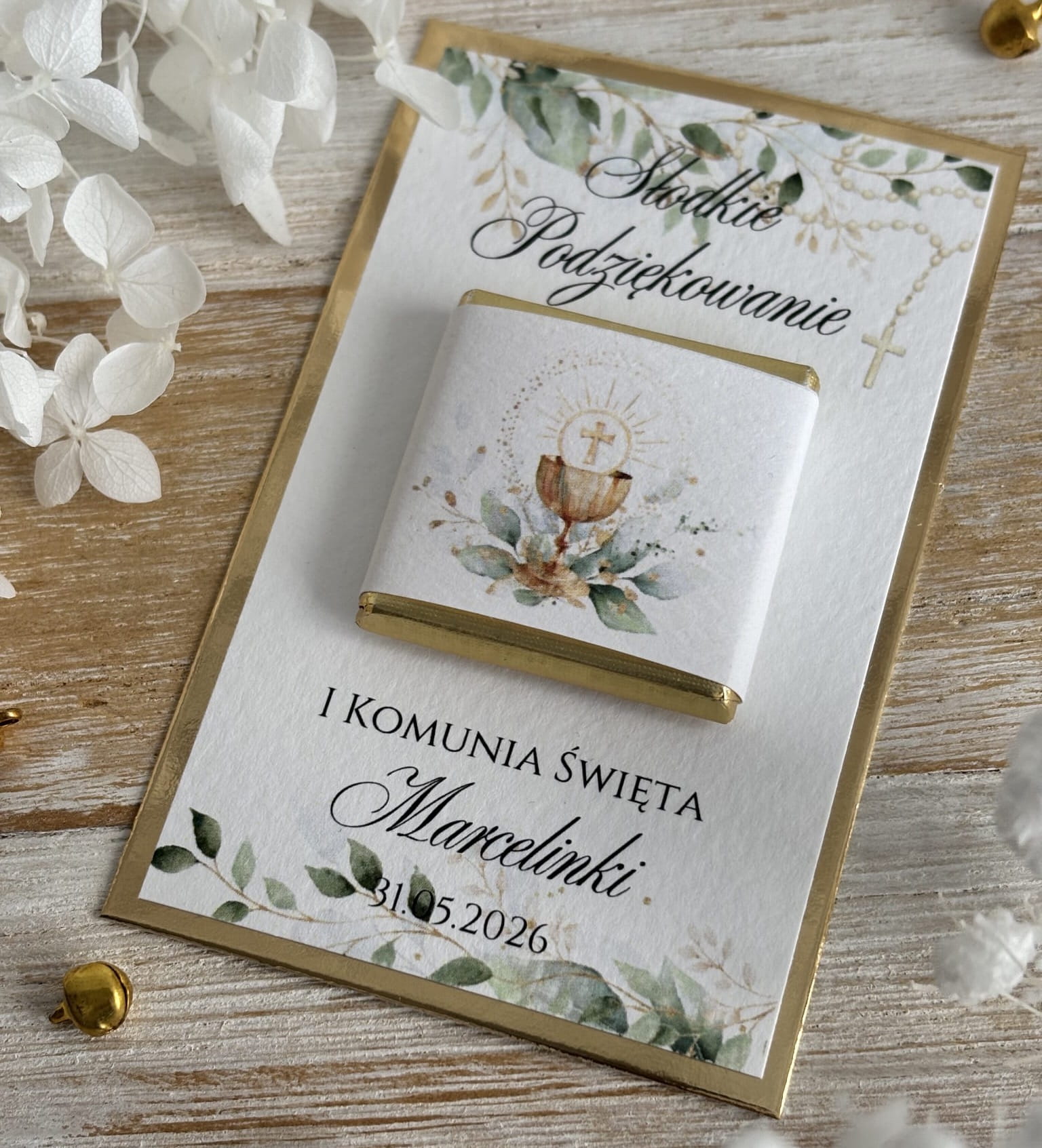 Wyjątkowe podziękowania dla gości z czekoladką to piękny i symboliczny sposób, aby wyrazić wdzięczność za obecność w tak ważnym dniu, jak Pierwsza Komunia Święta. Starannie wykonana kartka w delikatnym, naturalnym stylu zachwyca subtelną grafiką w odcieniach zieleni i złota, nawiązującą do religijnego charakteru uroczystości.