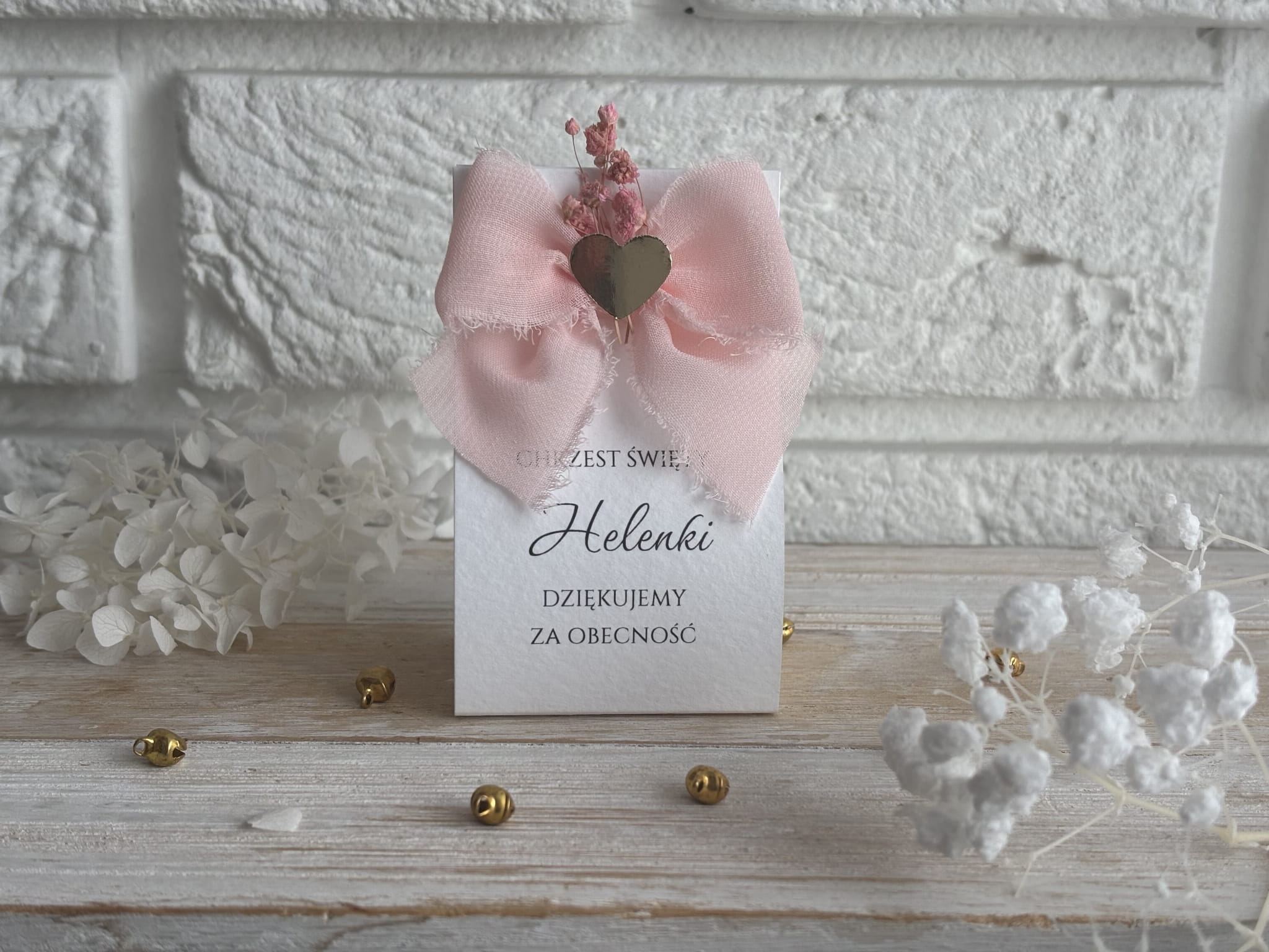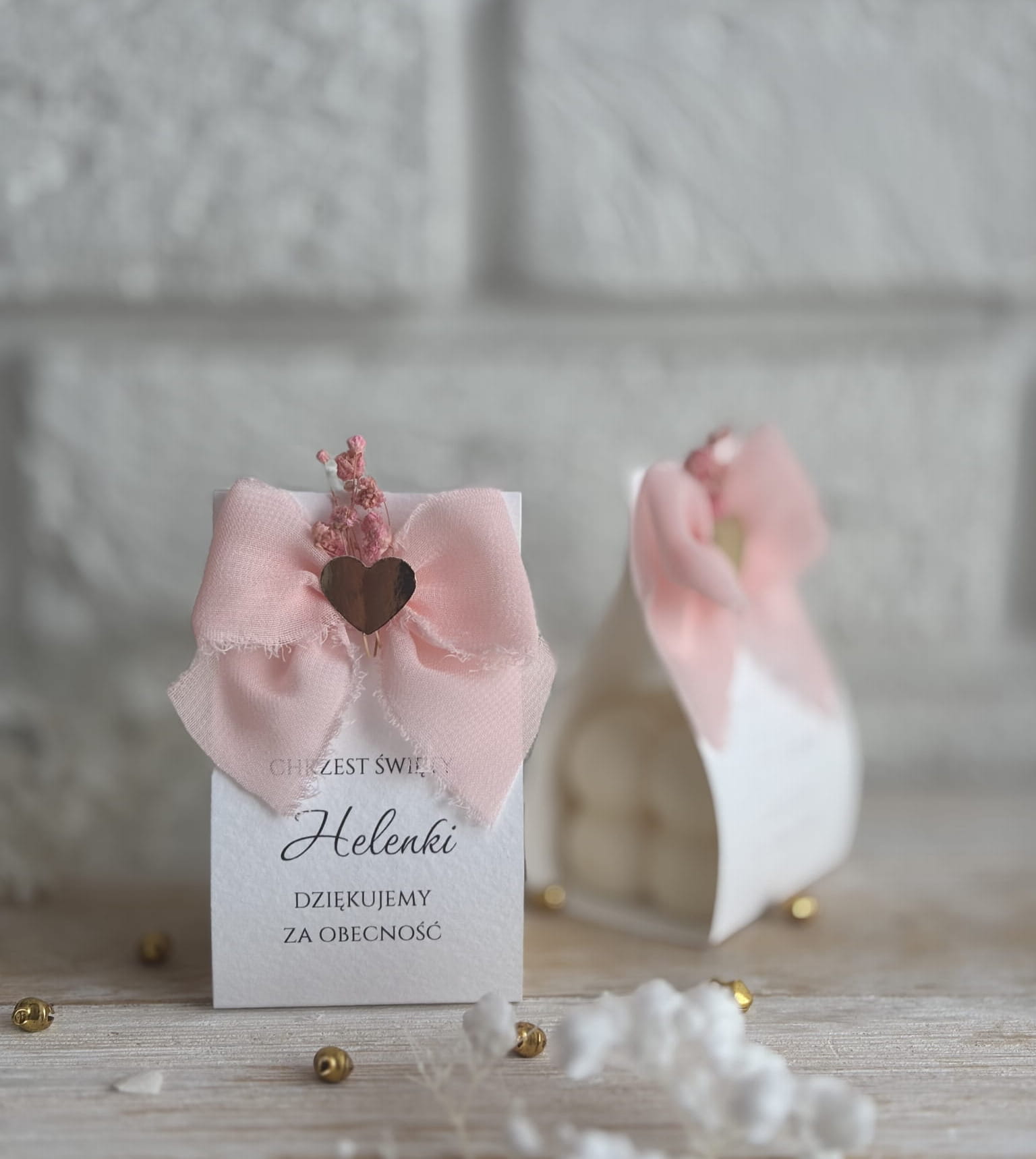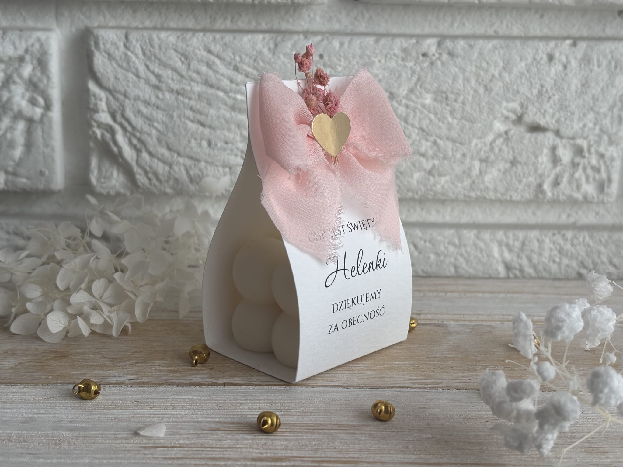 Wyjątkowa świeca bubble to eleganckie i nowoczesne podziękowanie dla gości z okazji Chrztu Świętego. Jej subtelna forma złożona z regularnych, miękkich kuleczek tworzy dekorację, która zachwyca minimalizmem i delikatnością. W połączeniu z pastelowymi akcentami i naturalnymi dodatkami tworzy spójną, harmonijną aranżację – idealną do uroczystych przyjęć w stylu boho, rustykalnym lub klasycznym.