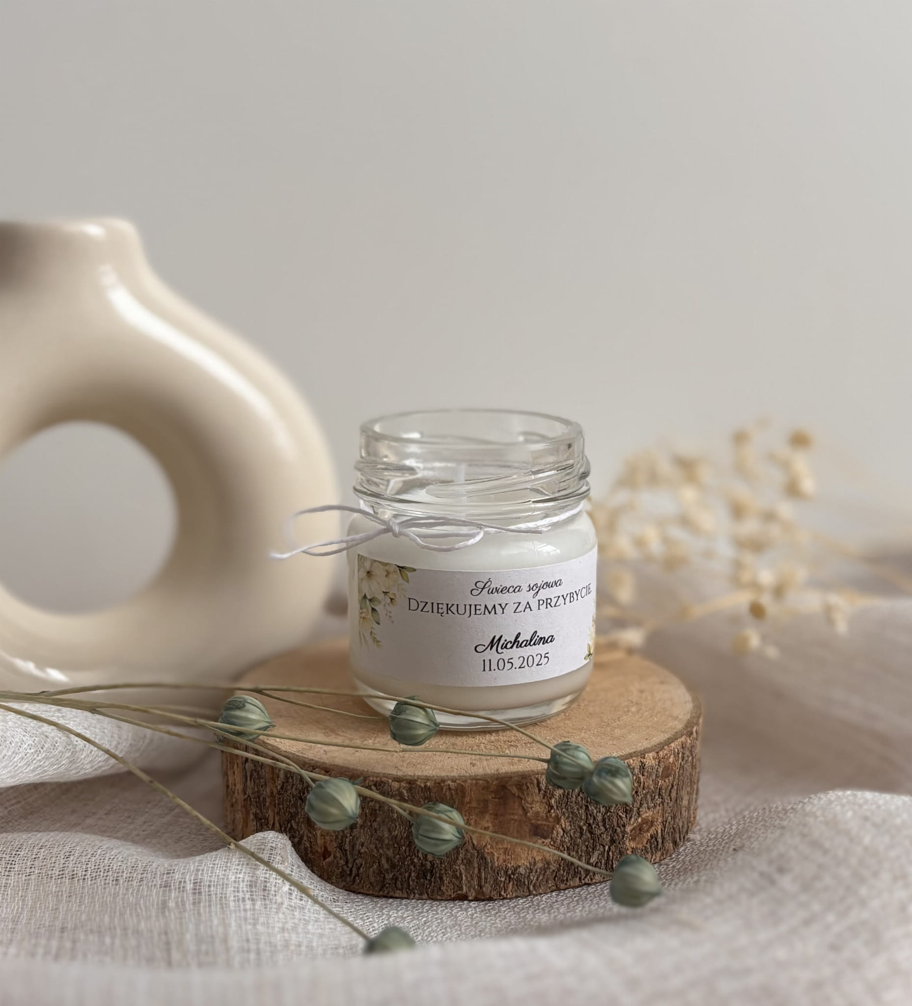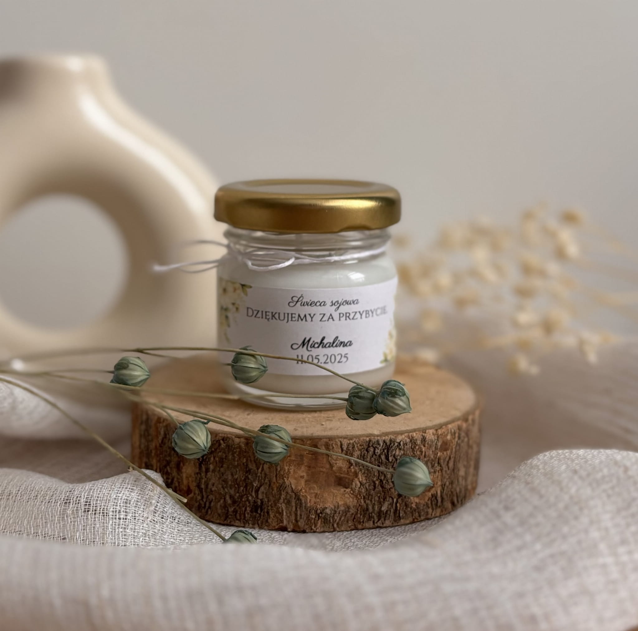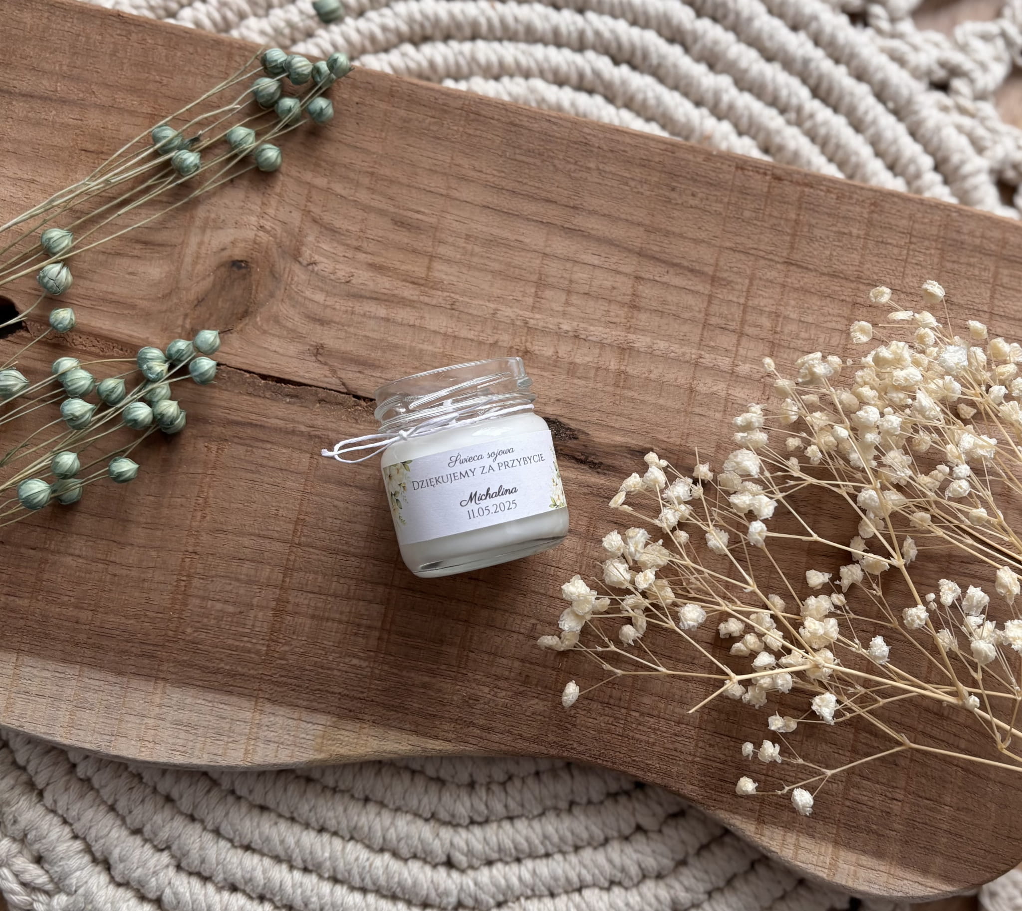Nasza propozycja to świece z naturalnego wosku sojowego, z personalizowaną etykietą, która odda klimat waszej uroczystości i będzie stanowiła spójny element dekoracyjny.