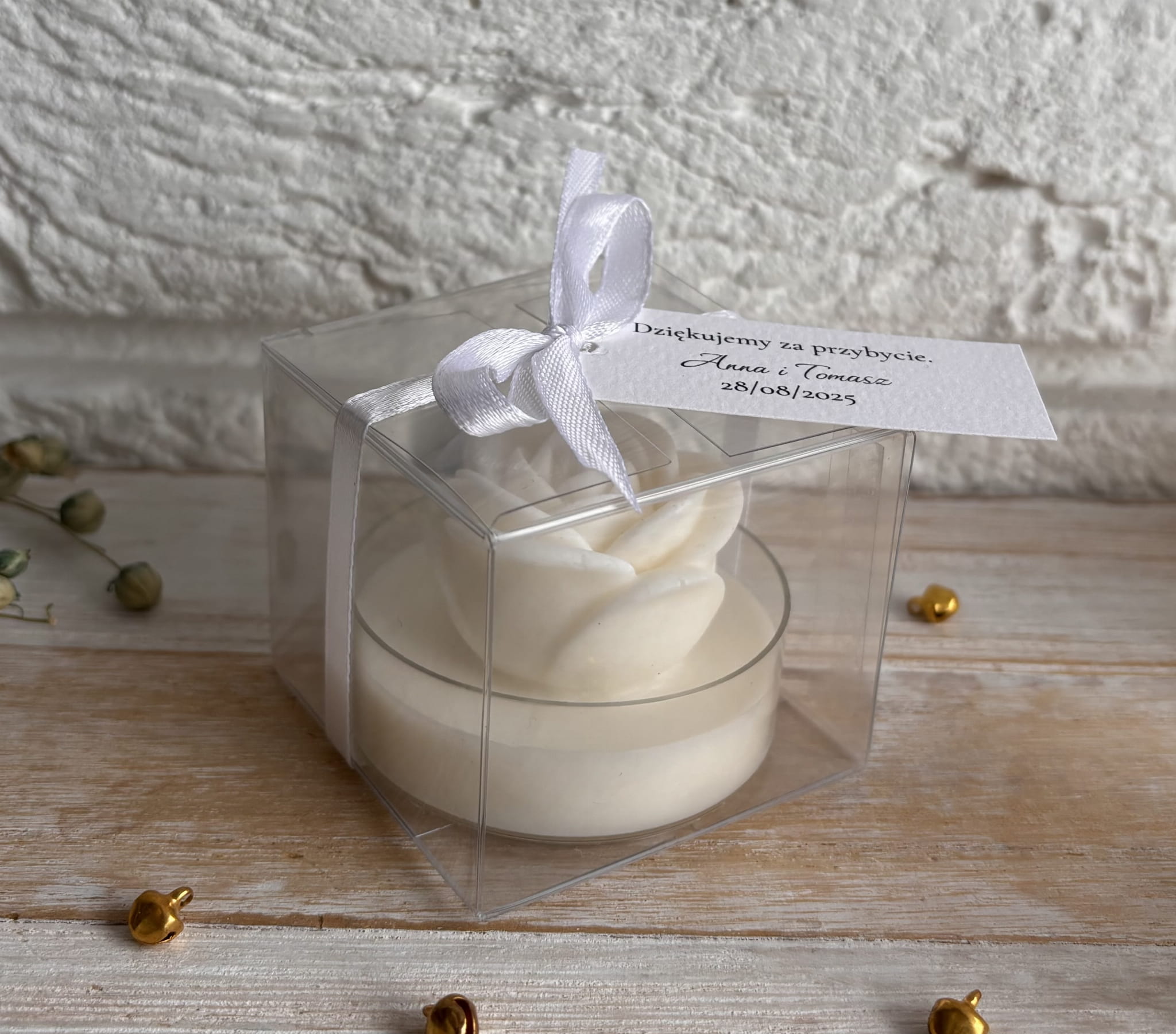 Nasza propozycja to świece z naturalnego wosku sojowego, z personalizowaną etykietką, która odda klimat waszej uroczystości i będzie stanowiła spójny element dekoracyjny.