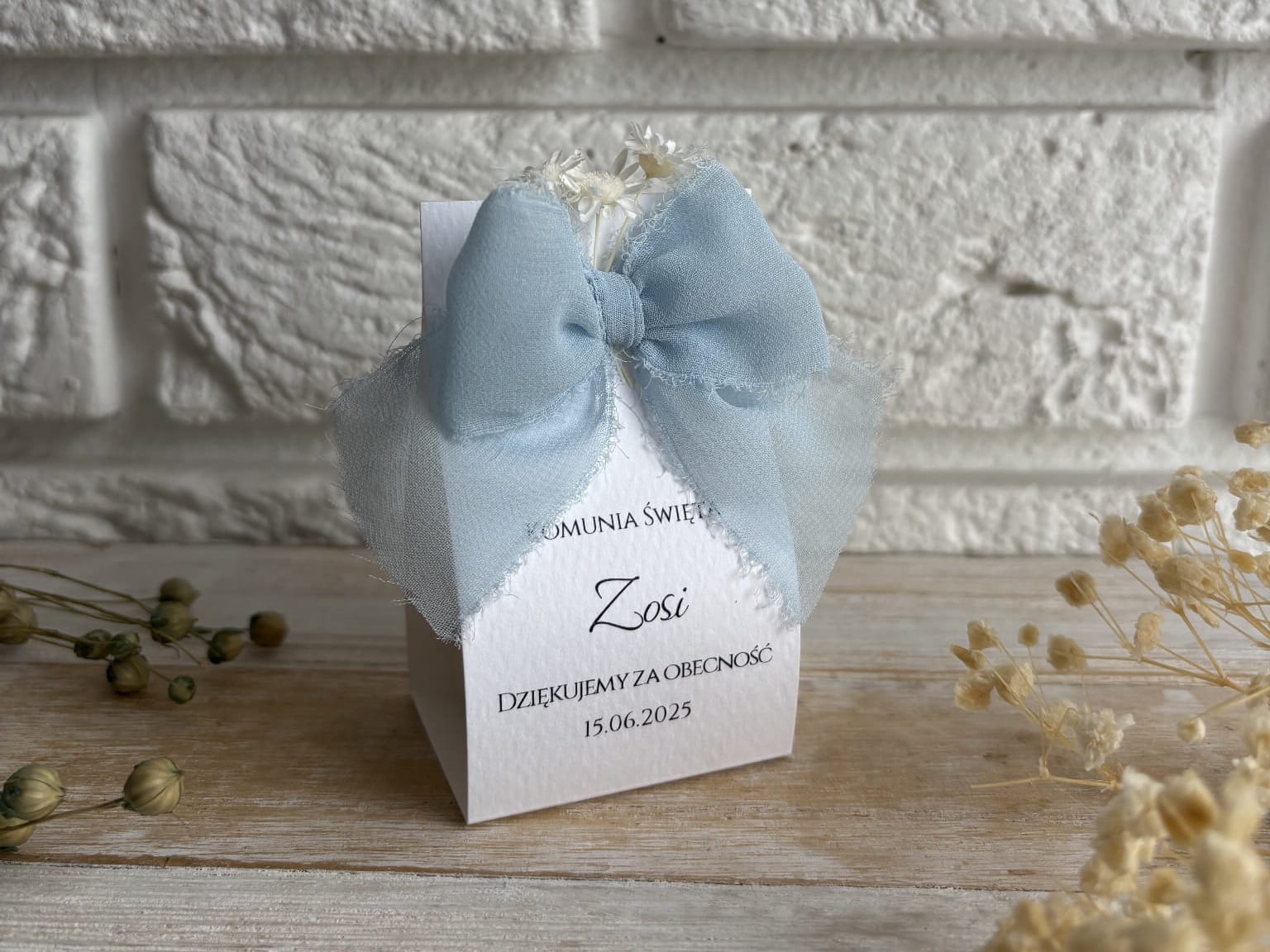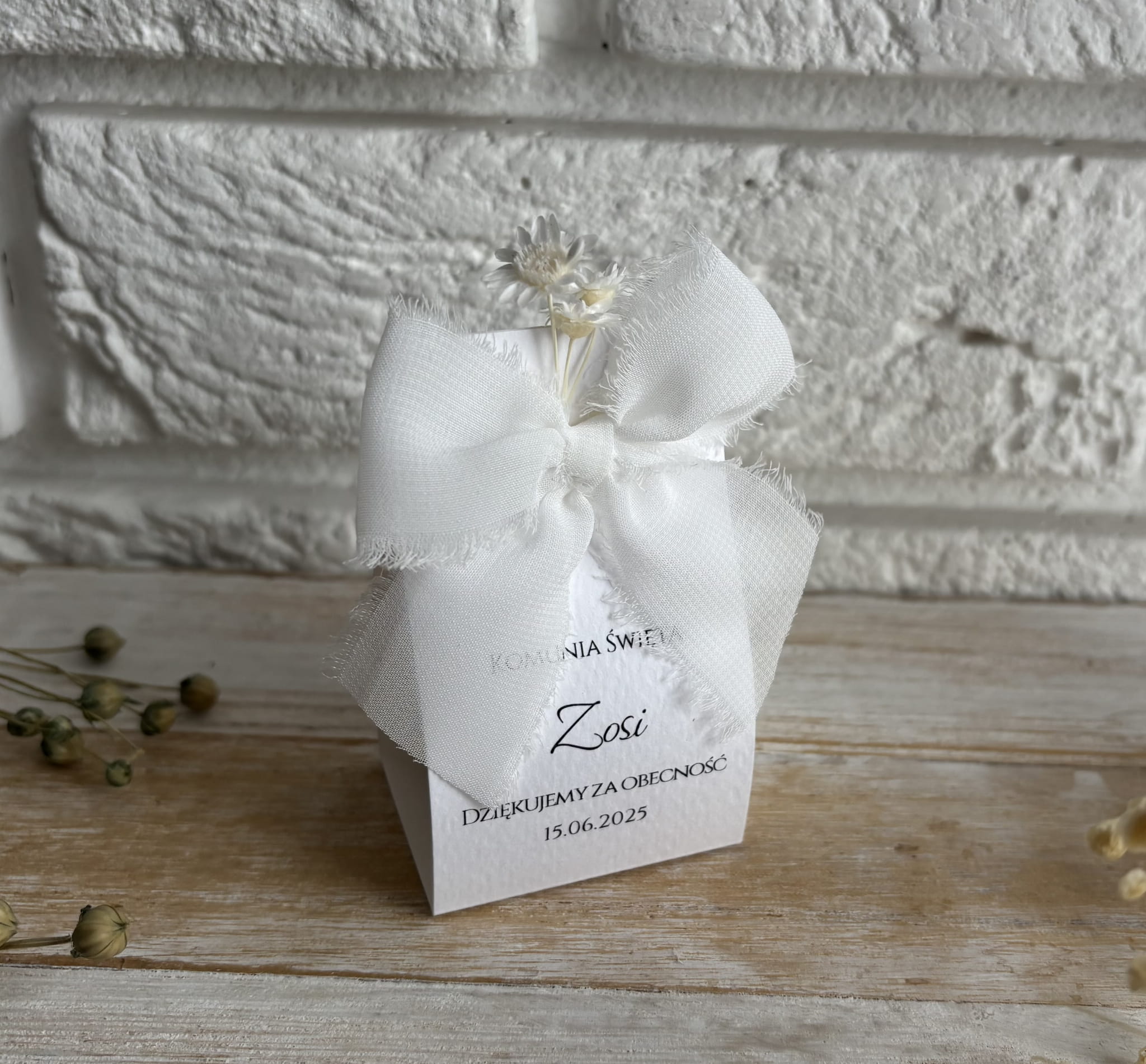 Podziękowanie dla gości z kokardą i kwiatami