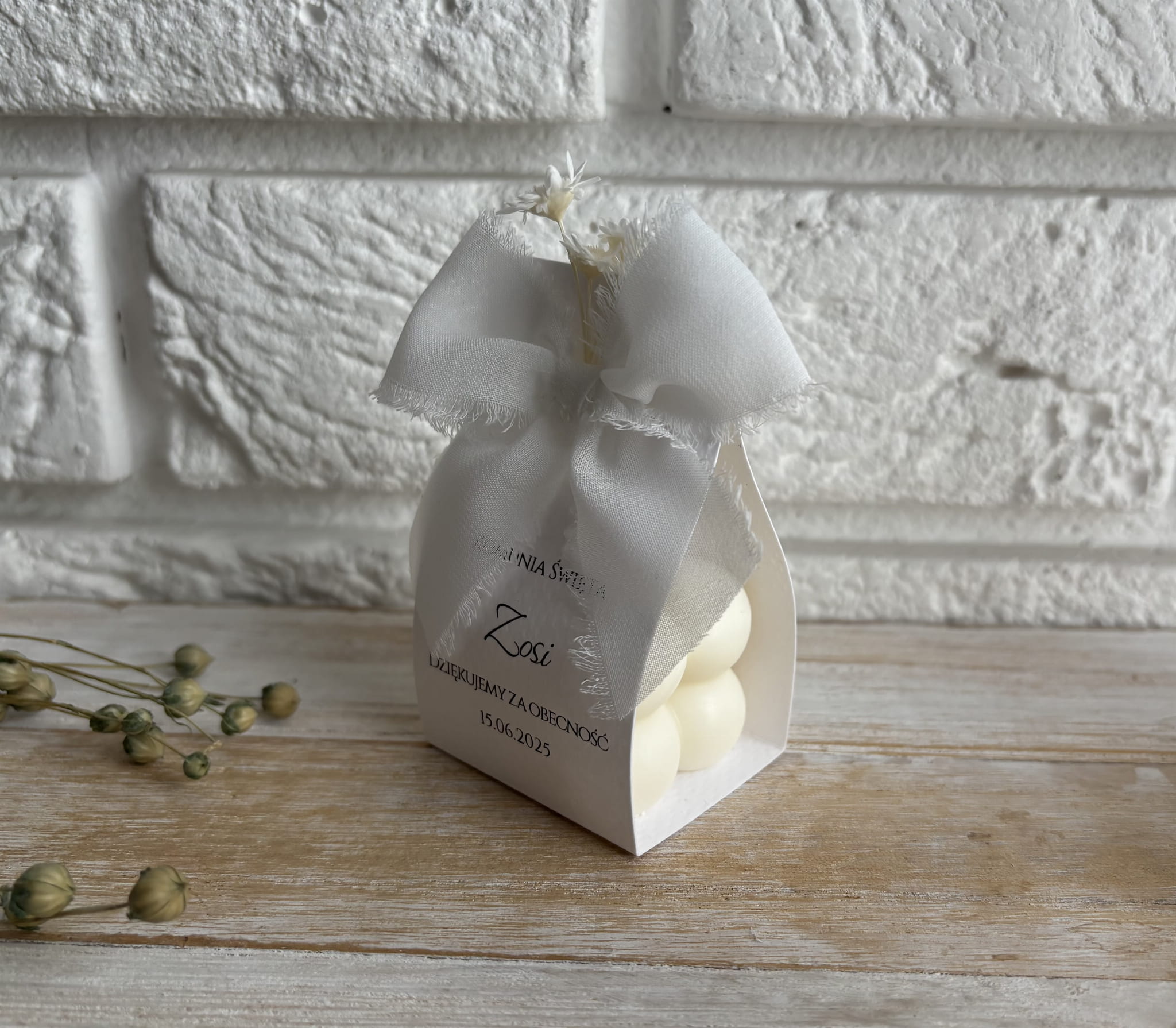 Ręcznie wykonana z naturalnego wosku sojowego, świeca zachwyca wyjątkowym kształtem – subtelne bańki nadają jej nowoczesny, a zarazem uroczy wygląd. Każda świeca zapakowana w ozdobne opakowanie i opatrzona personalizowaną etykietą z imionami, datą lub krótkim podziękowaniem.