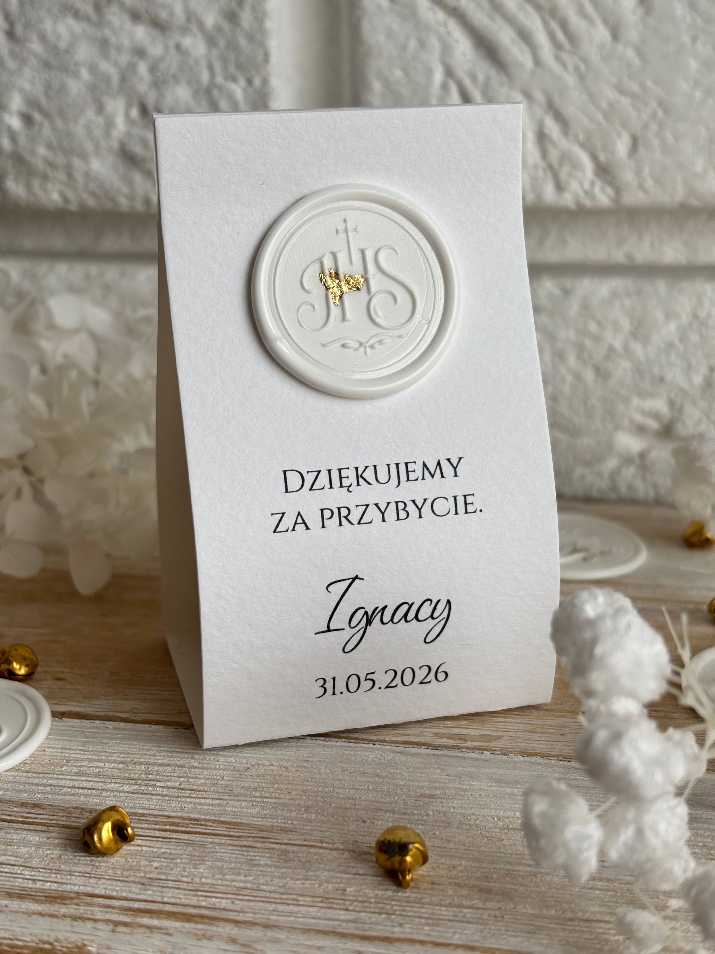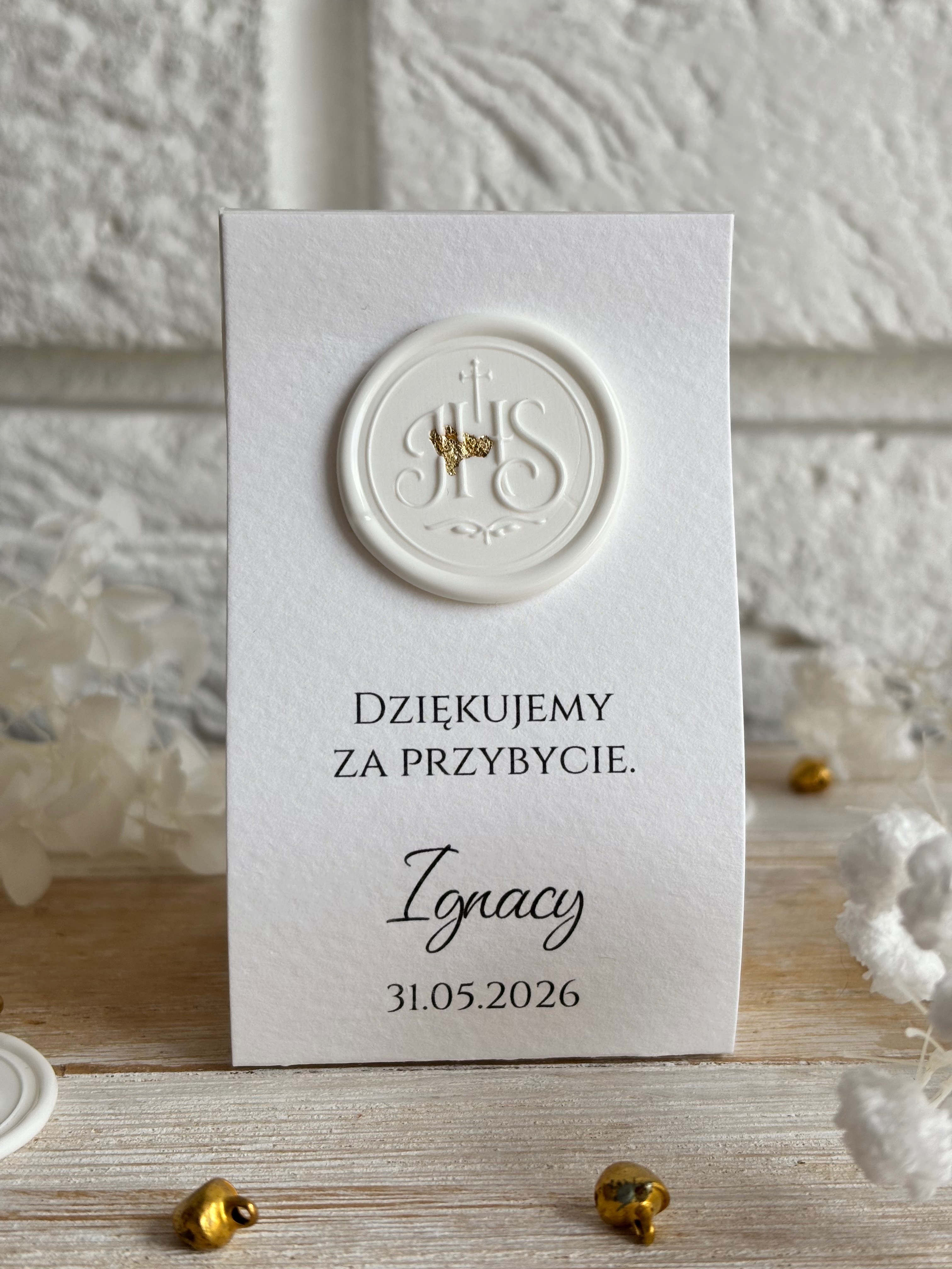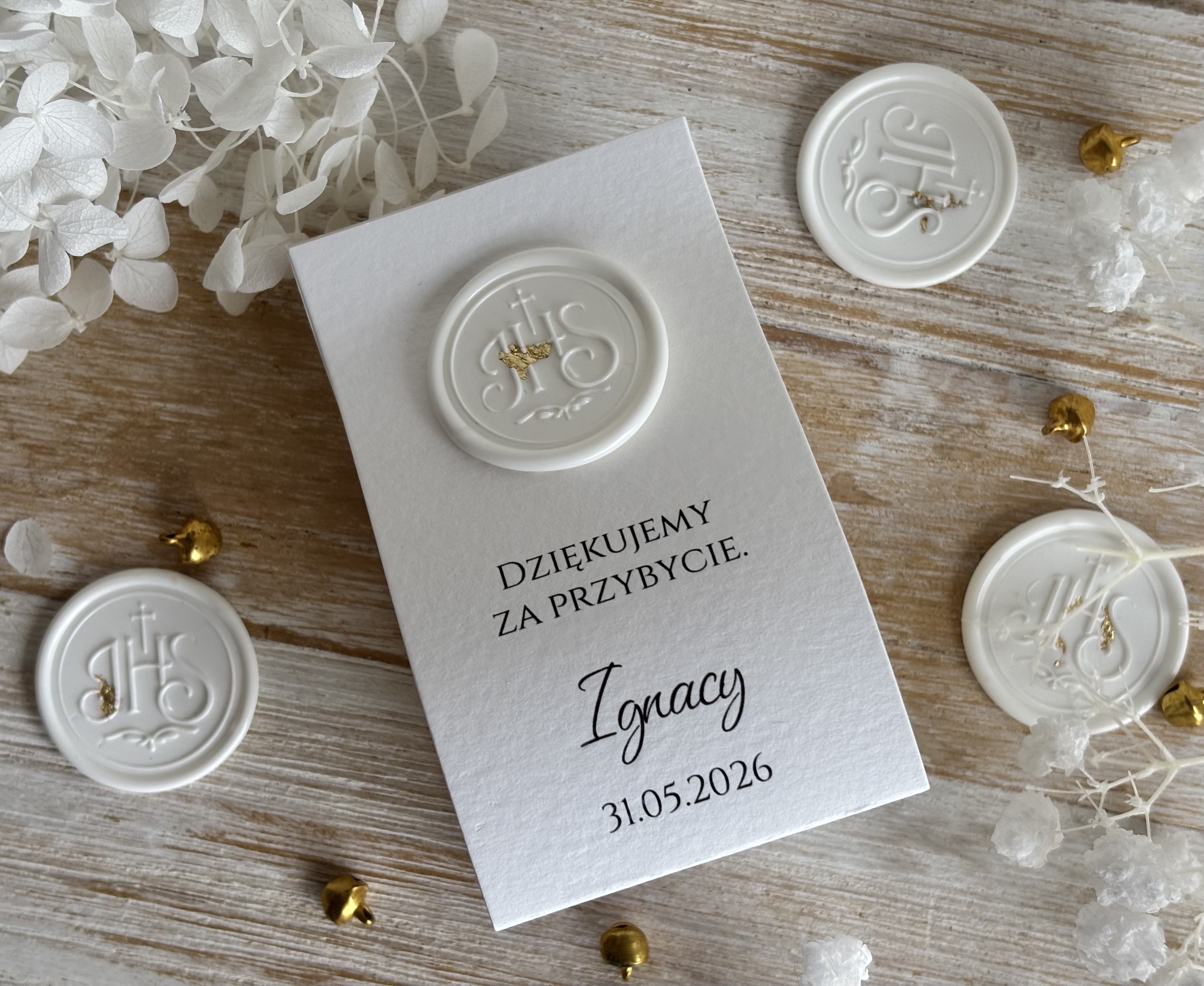 Eleganckie podziękowanie dla gości z okazji Pierwszej Komunii Świętej, które zachwyca ponadczasowym stylem i subtelną symboliką religijną. Minimalistyczne etui wykonane z wysokiej jakości, fakturowanego papieru zostało ozdobione ręcznie wykonaną pieczęcią lakową z motywem IHS oraz delikatnym złotym akcentem, podkreślającym uroczysty charakter wydarzenia.