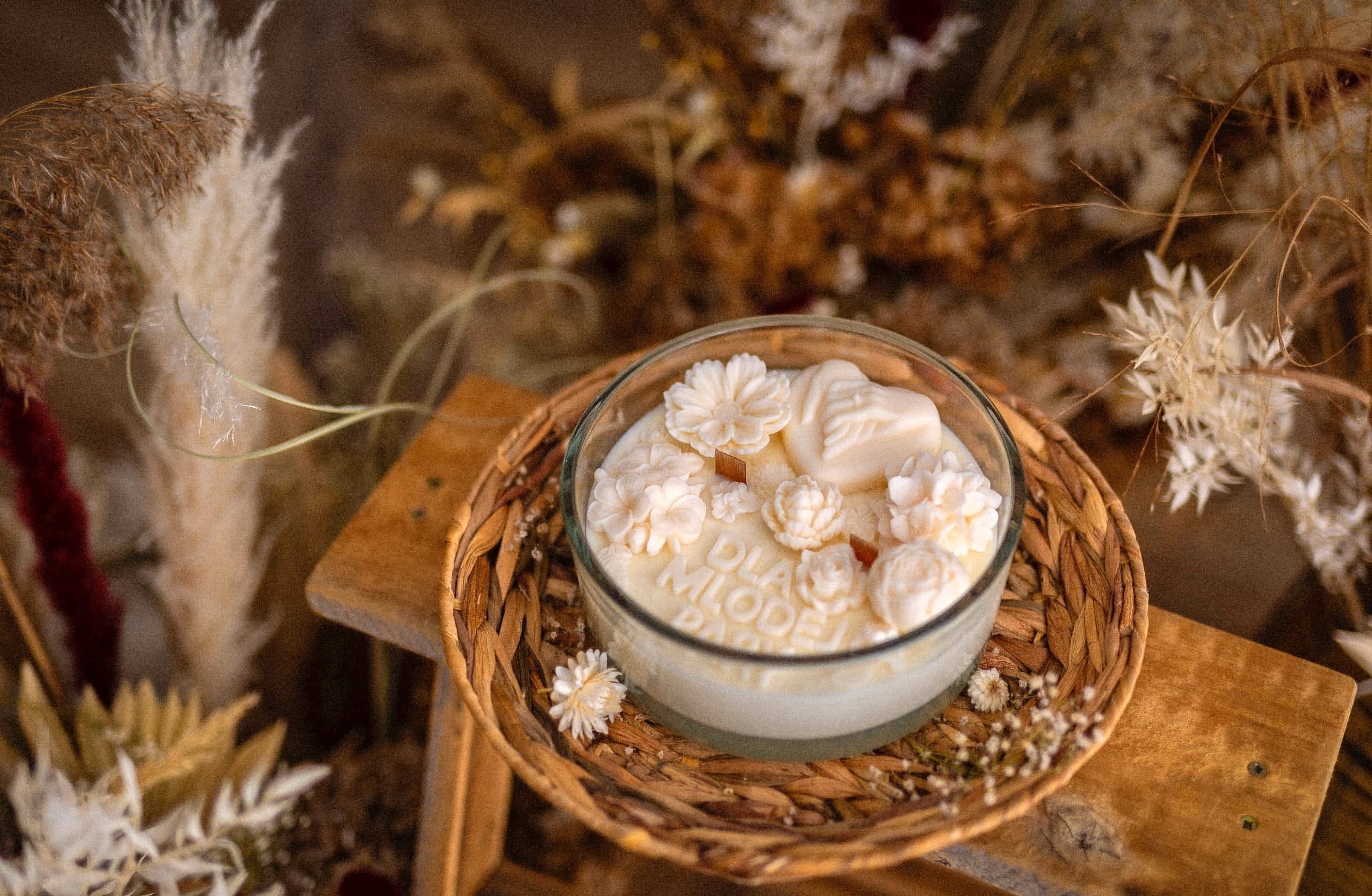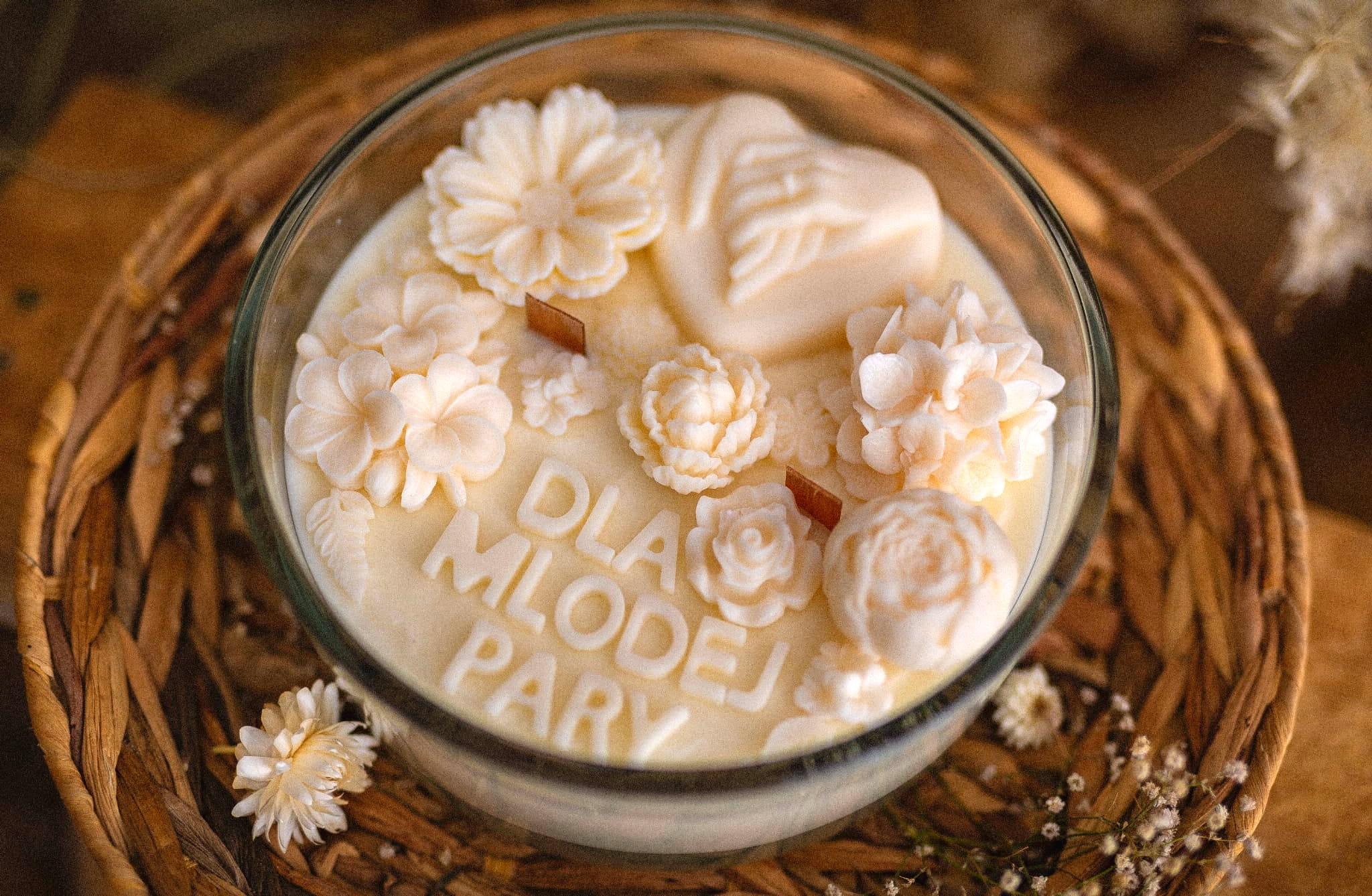 Świeca sojowa ozdobiona ślubną aplikacją będzie cudowną dekoracją a także wyjątkowym prezentem z okazji ślubu.