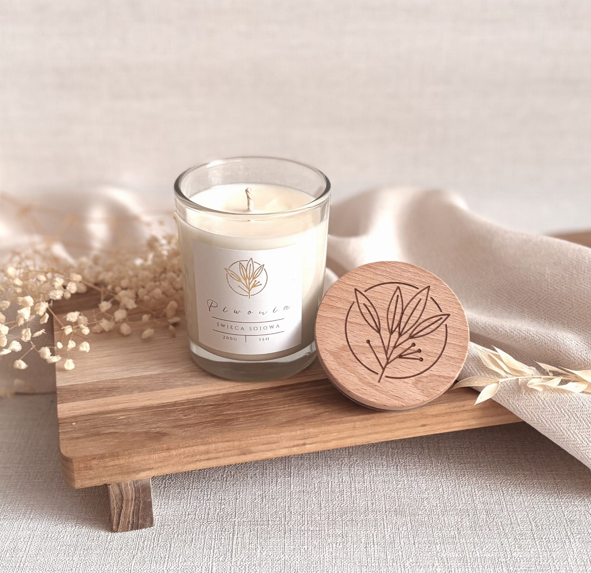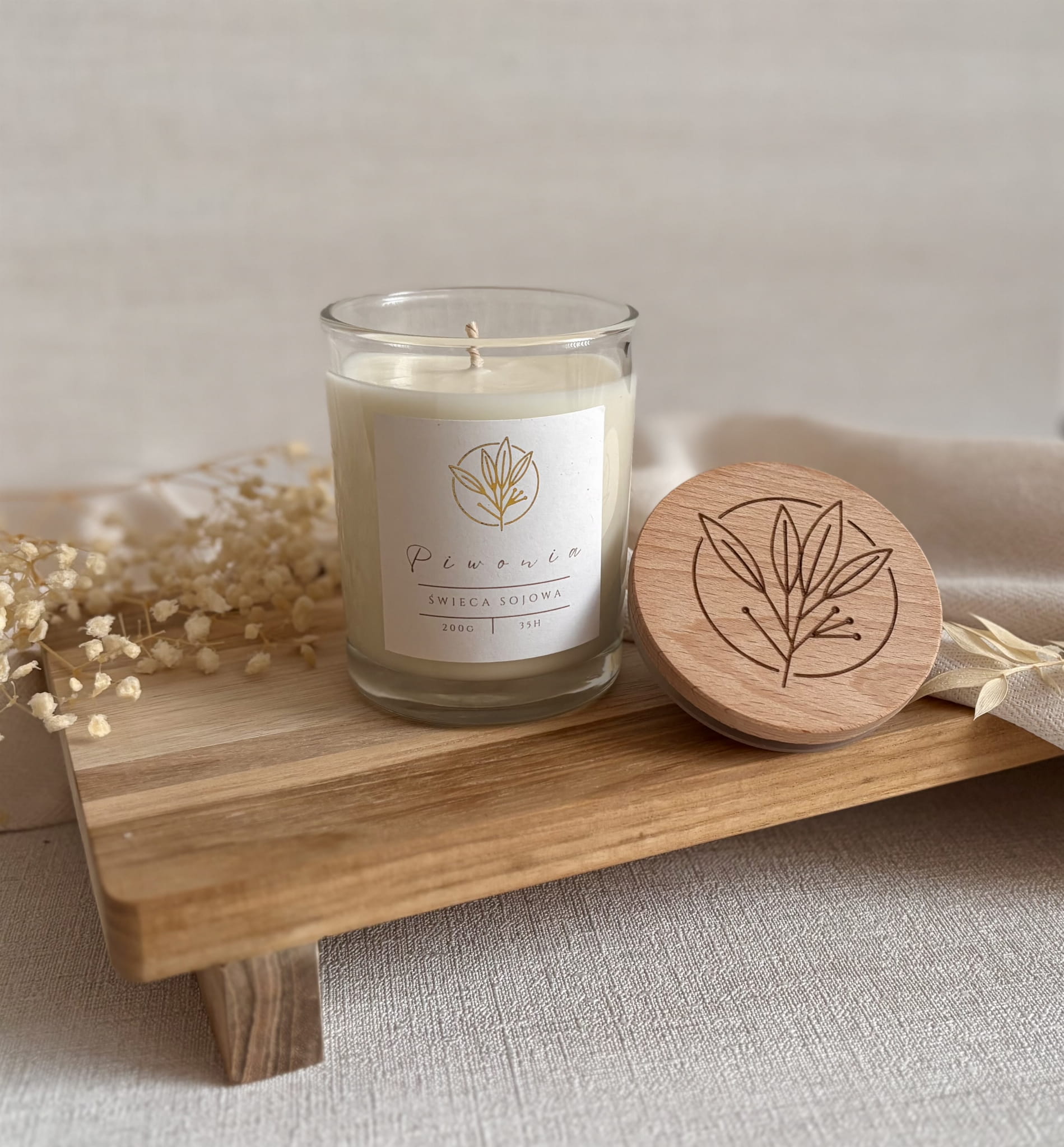 Ilość wosku: 180g Kolor szkła: przezroczyste Drewniana pokrywka.