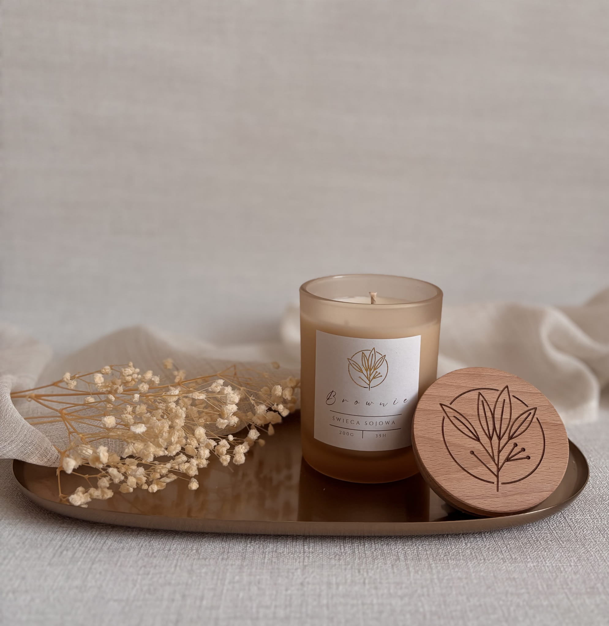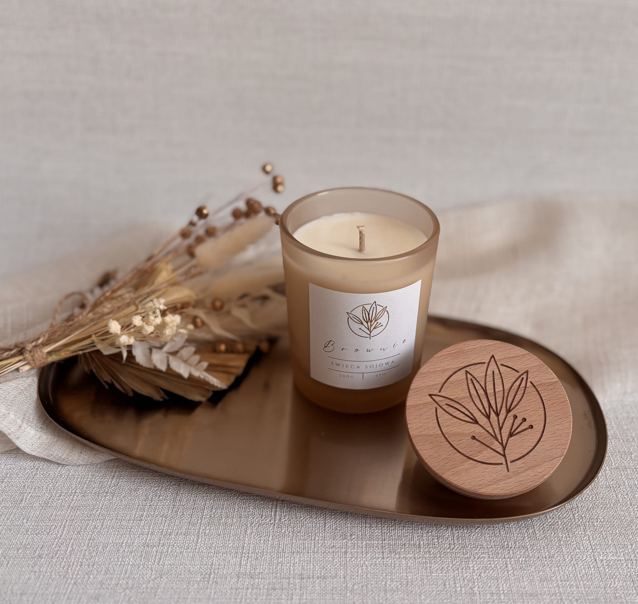 Ilość wosku: 180g Kolor szkła: brązowe satynowe Drewniana pokrywka.