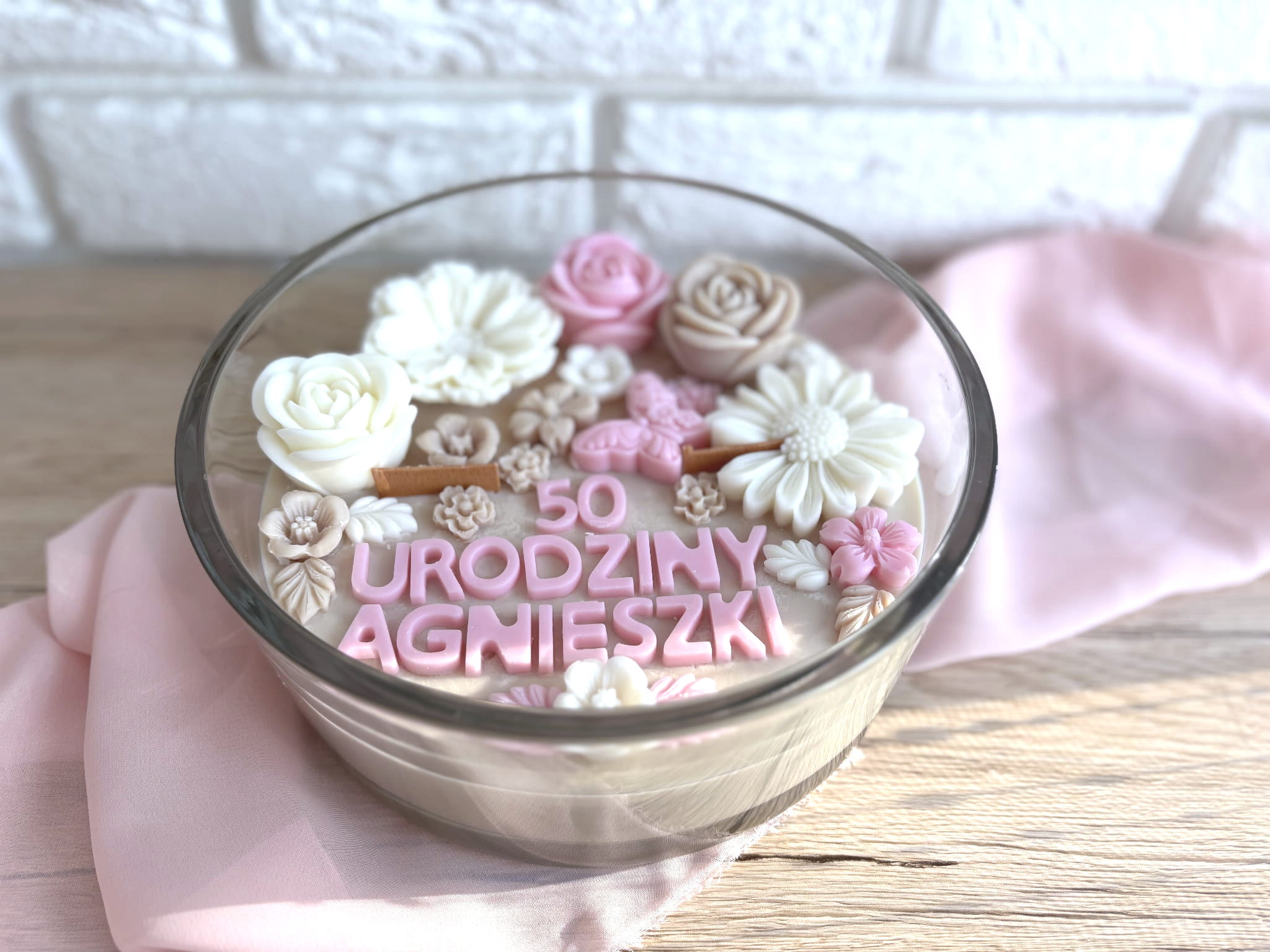 Świeca sojowa na urodziny z personalizacją – ręcznie robiona, z kwiatami i napisem