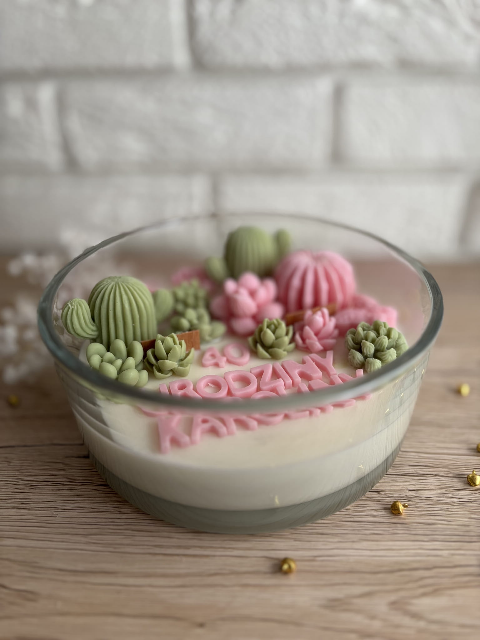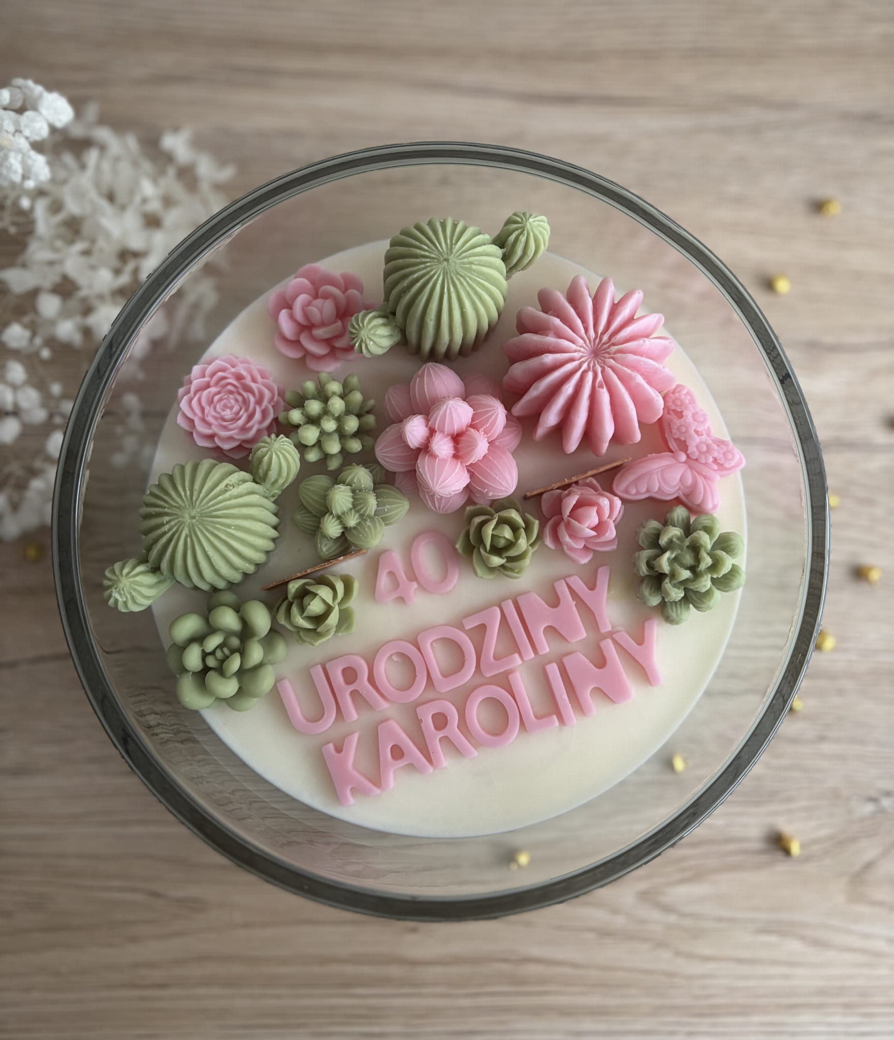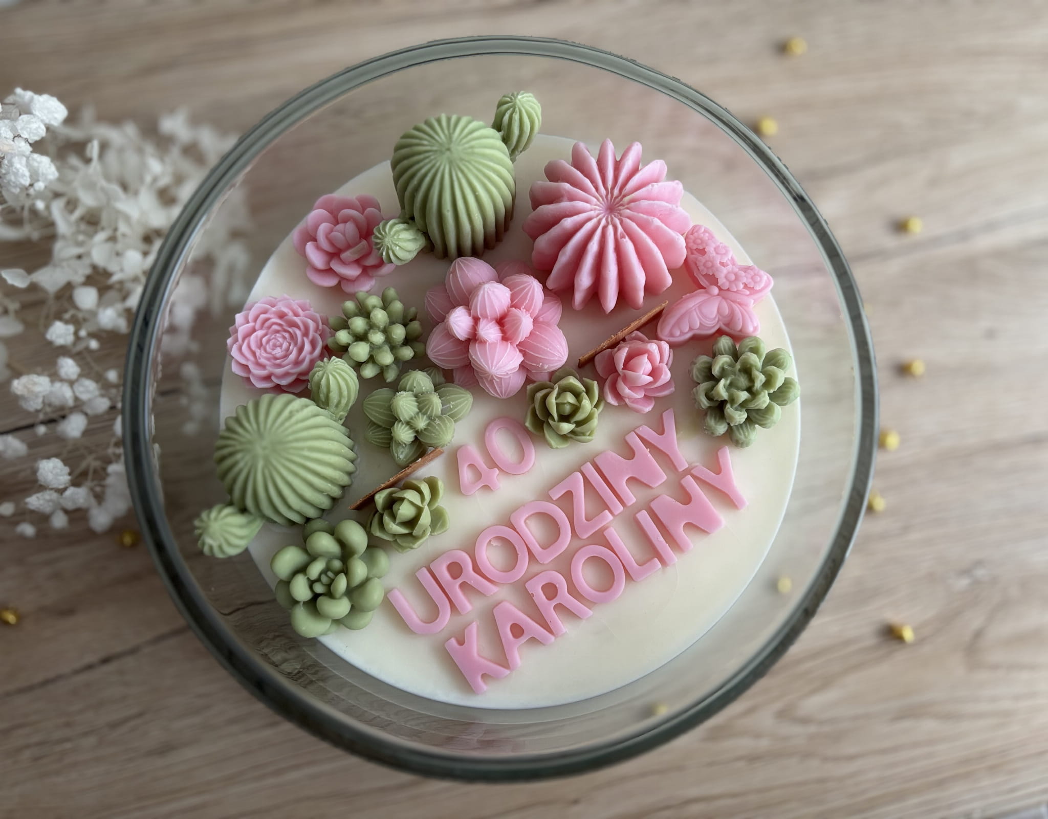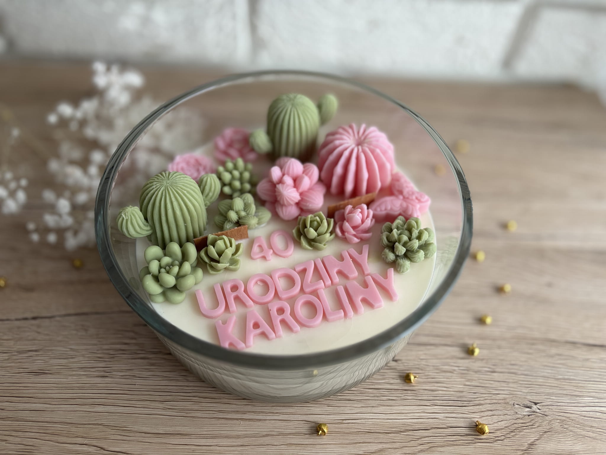 Wyjątkowa ręcznie robiona świeca sojowa zdobiona misternie wykonanymi roślinnymi dekoracjami z barwionego wosku. Na powierzchni świecy znajdują się przepiękne, realistyczne sukulenty oraz kaktusy w odcieniach pastelowej zieleni i różu, tworzące efektowną, trójwymiarową kompozycję. Centralną część zdobi woskowy napis, dzięki czemu świeca idealnie sprawdzi się jako personalizowany prezent urodzinowy.