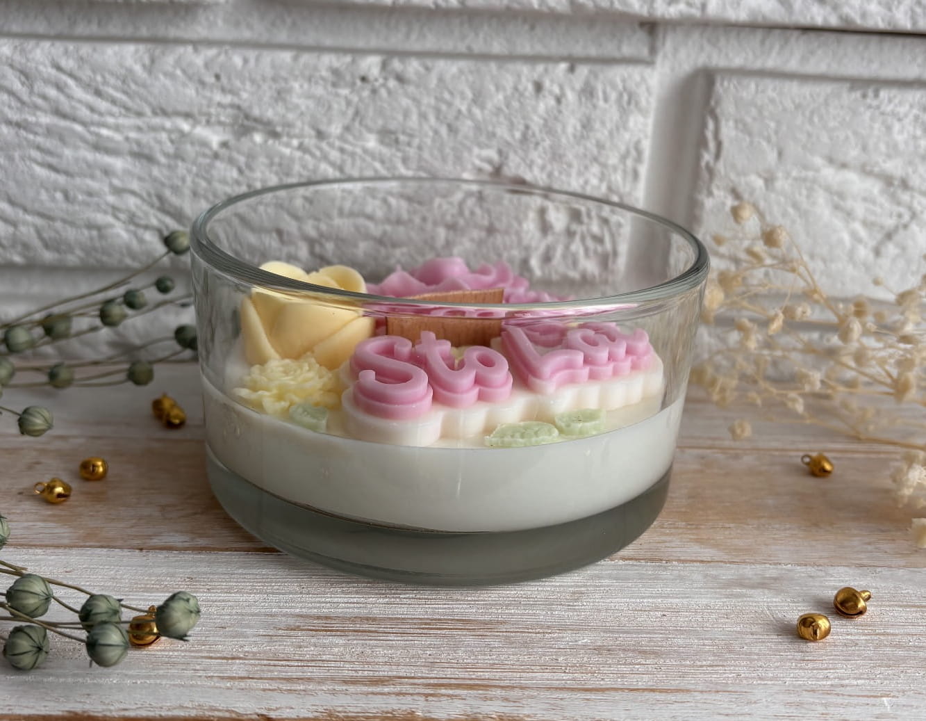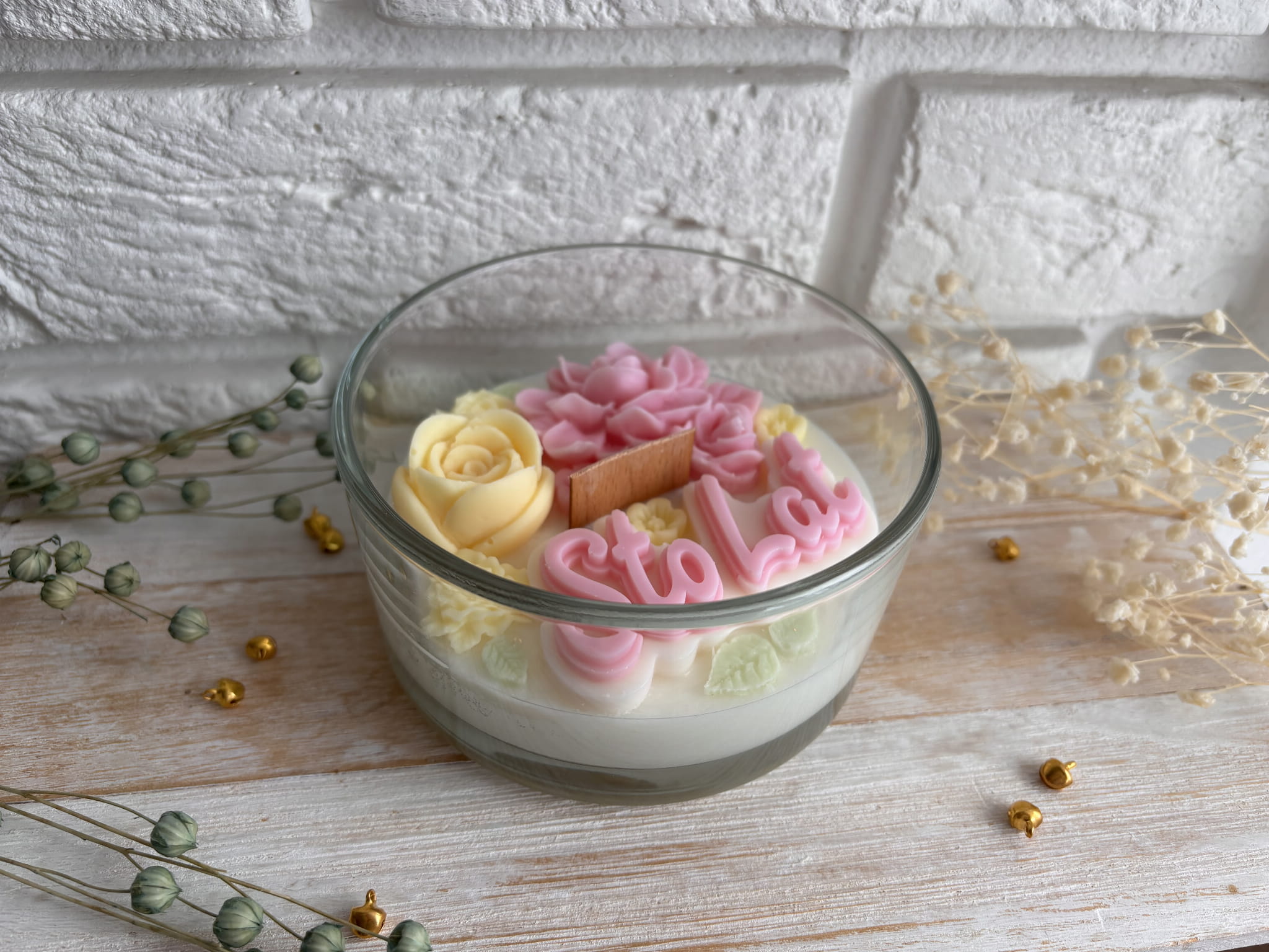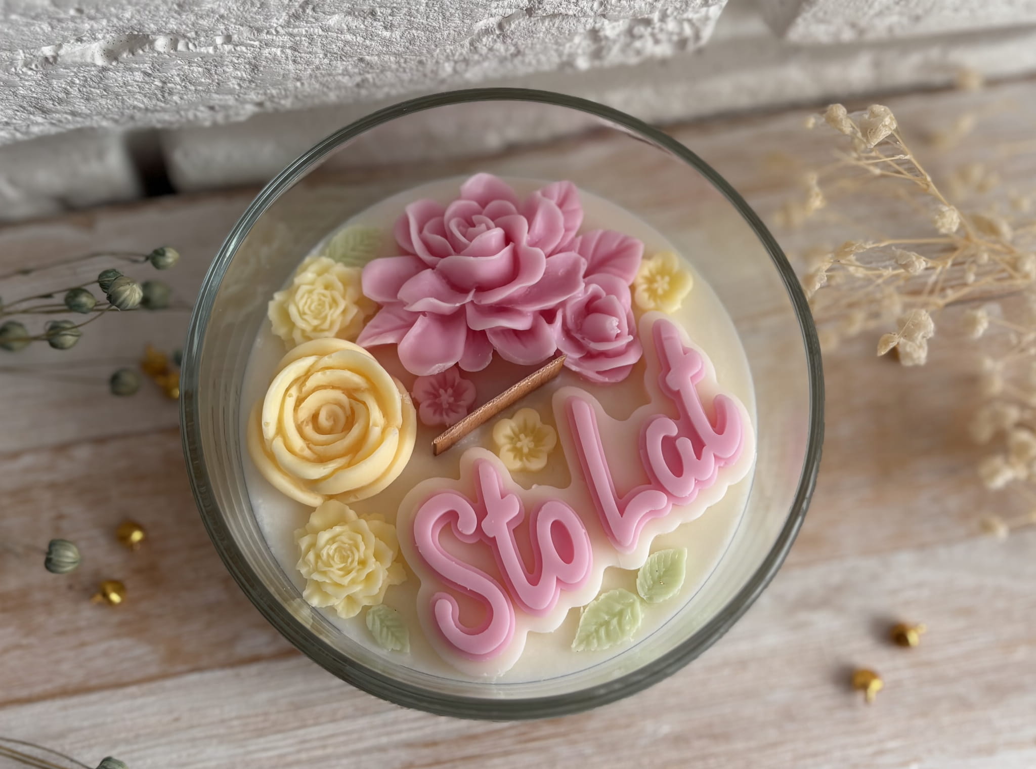 Świeca sojowa ozdobiona kwiatami będzie cudowną dekoracją każdego wnętrza. Idealnie sprawdzi się na prezent dla ukochanej osoby.