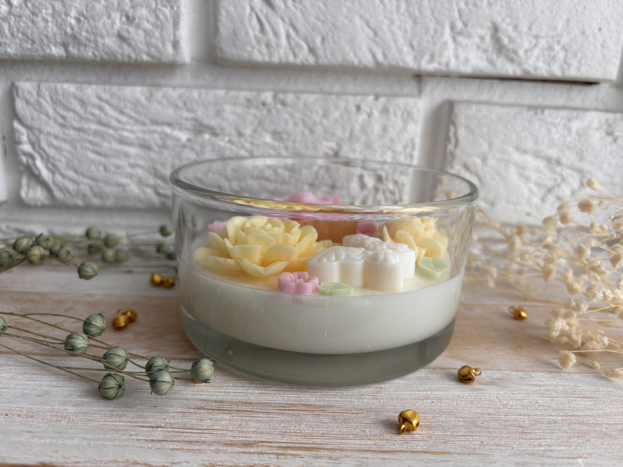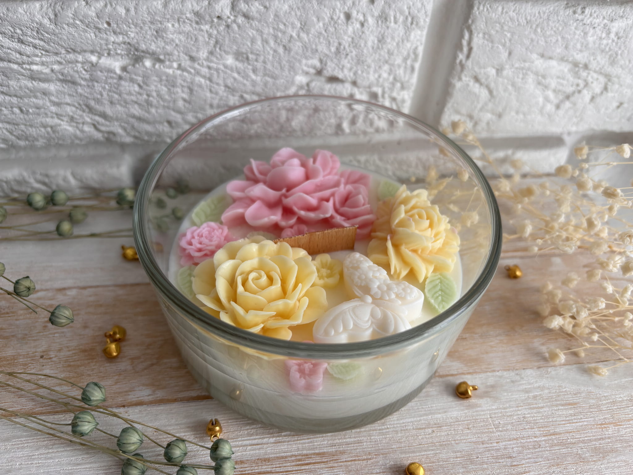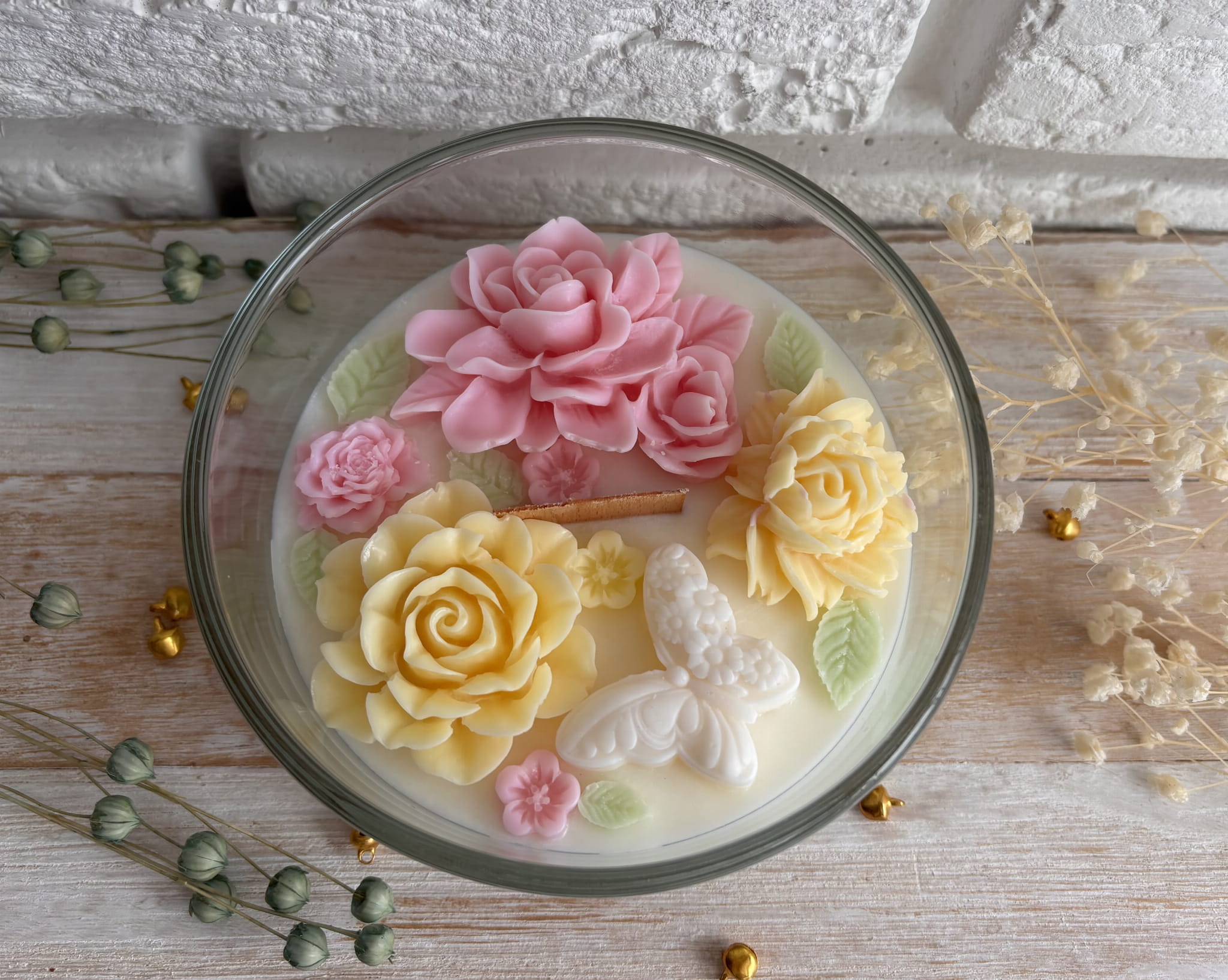 Świeca sojowa ozdobiona kwiatami będzie cudowną dekoracją każdego wnętrza. Idealnie sprawdzi się na prezent dla ukochanej osoby.