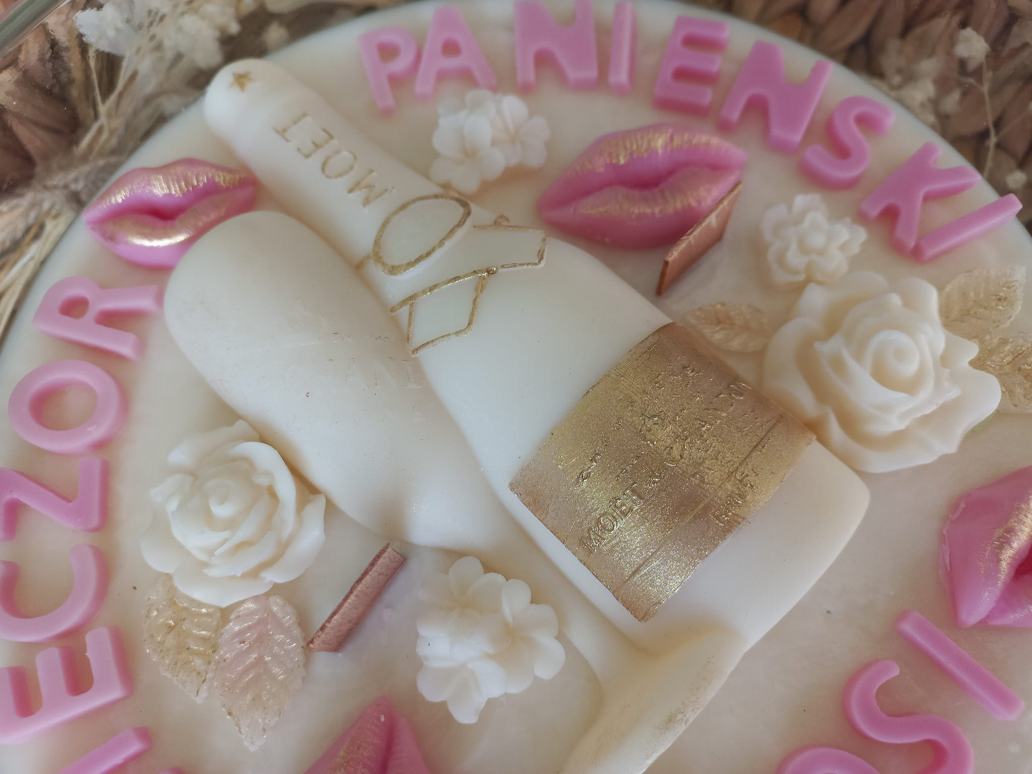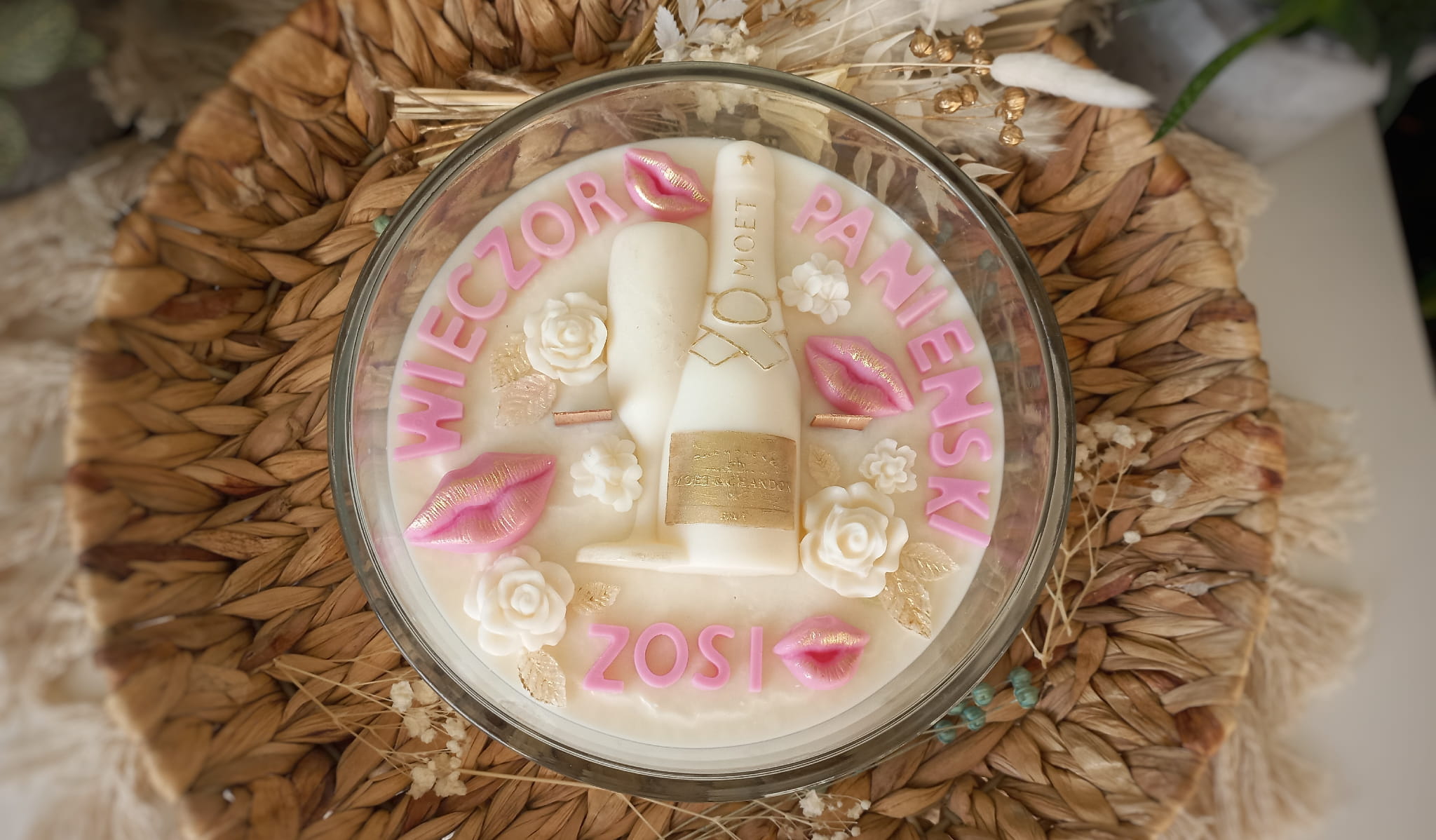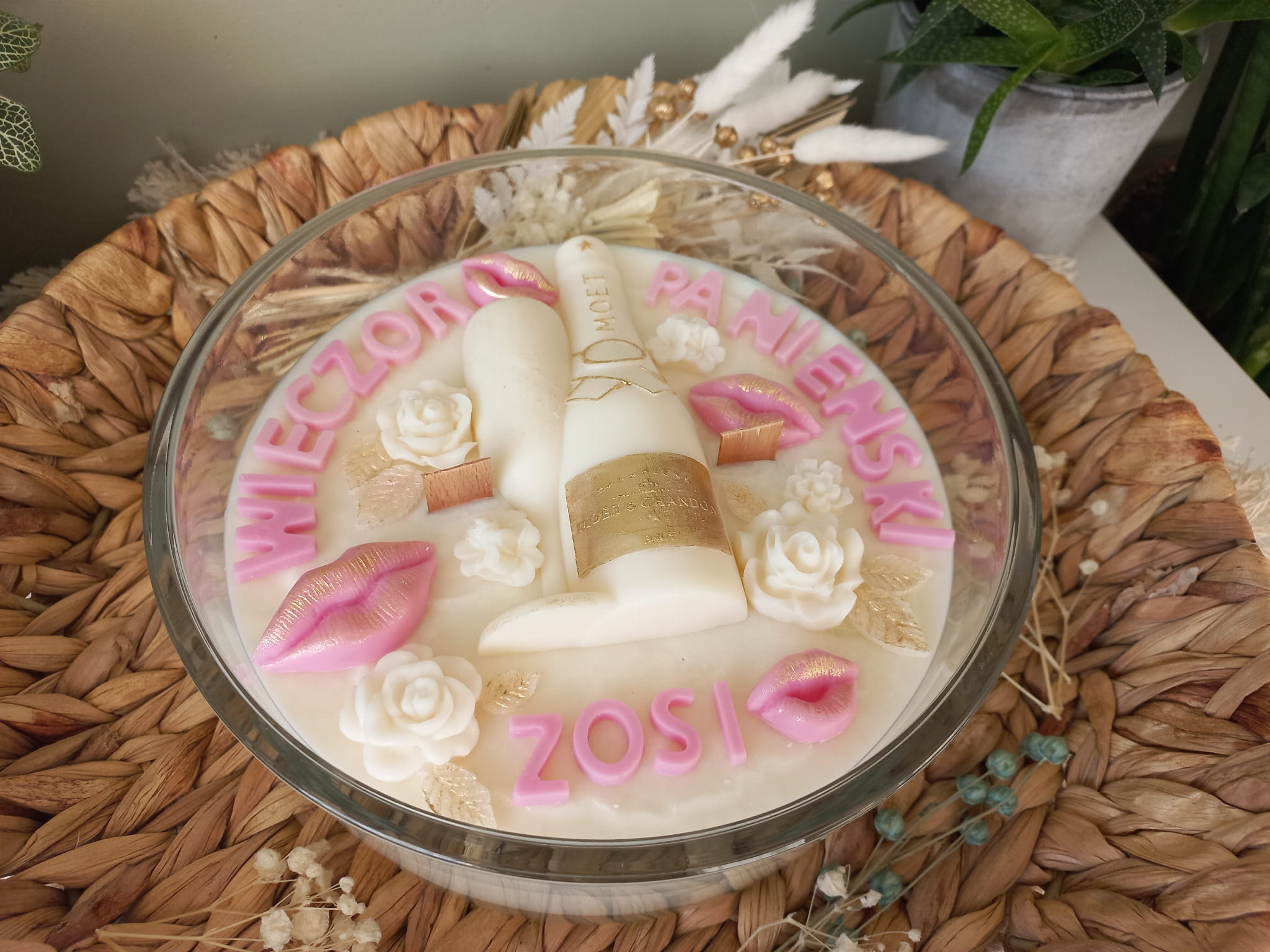 Świeca sojowa ozdobiona szampanem z kieliszkiem, ustami, kwiatami oraz napisem będzie cudowną pamiątką z wieczoru Panieńskiego.