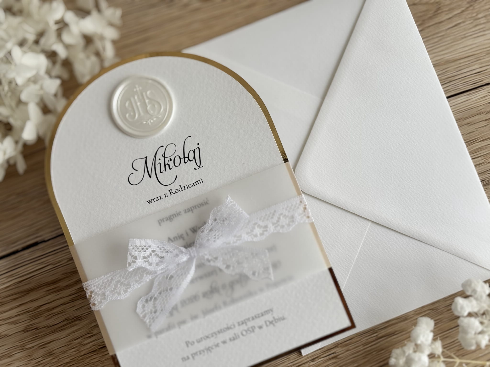 Zaproszenia na Komunię Świętą z lakiem, kalką i koronkową kokardą