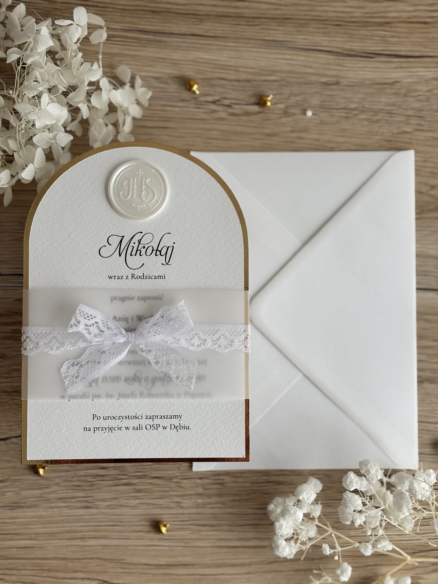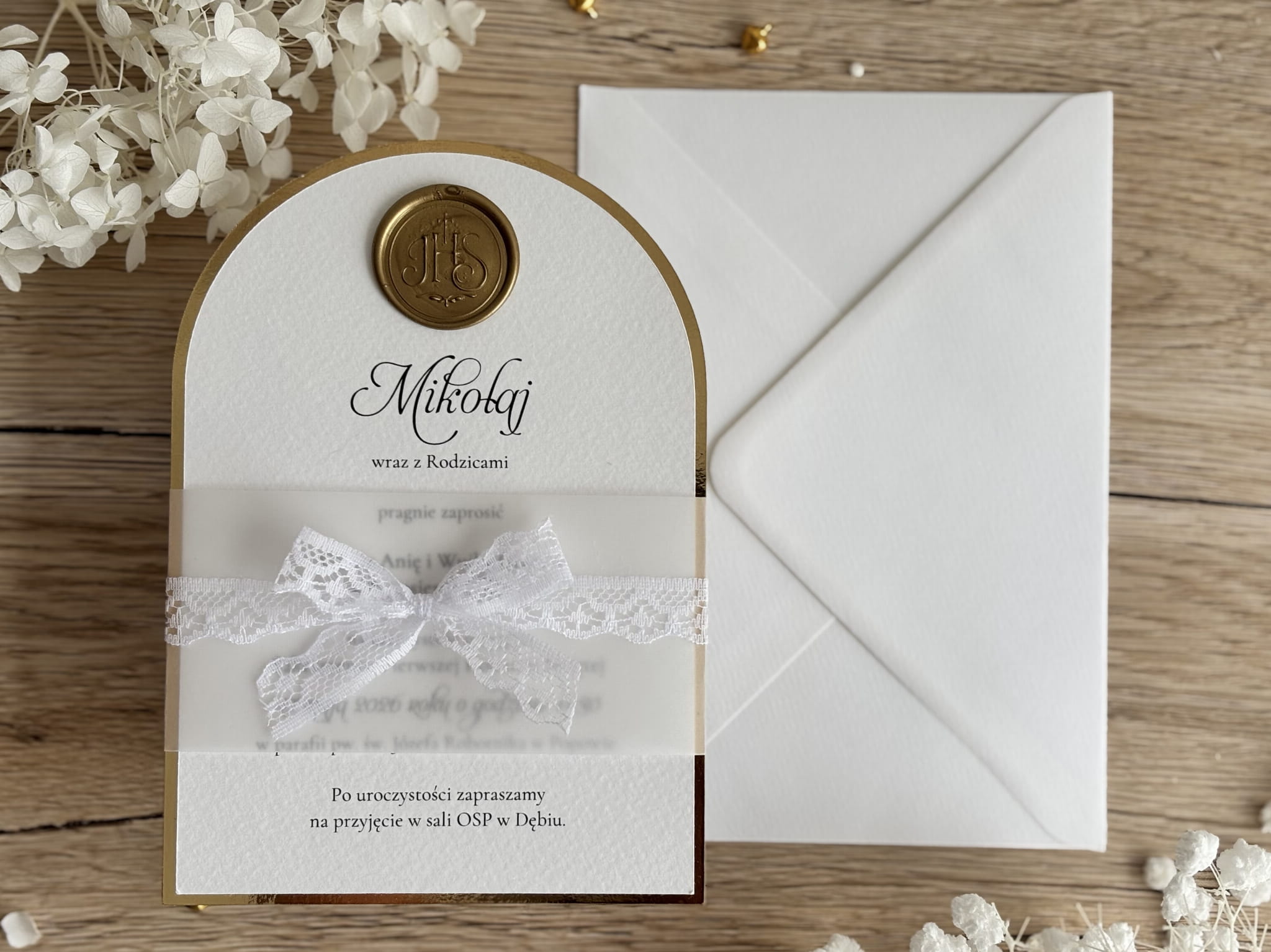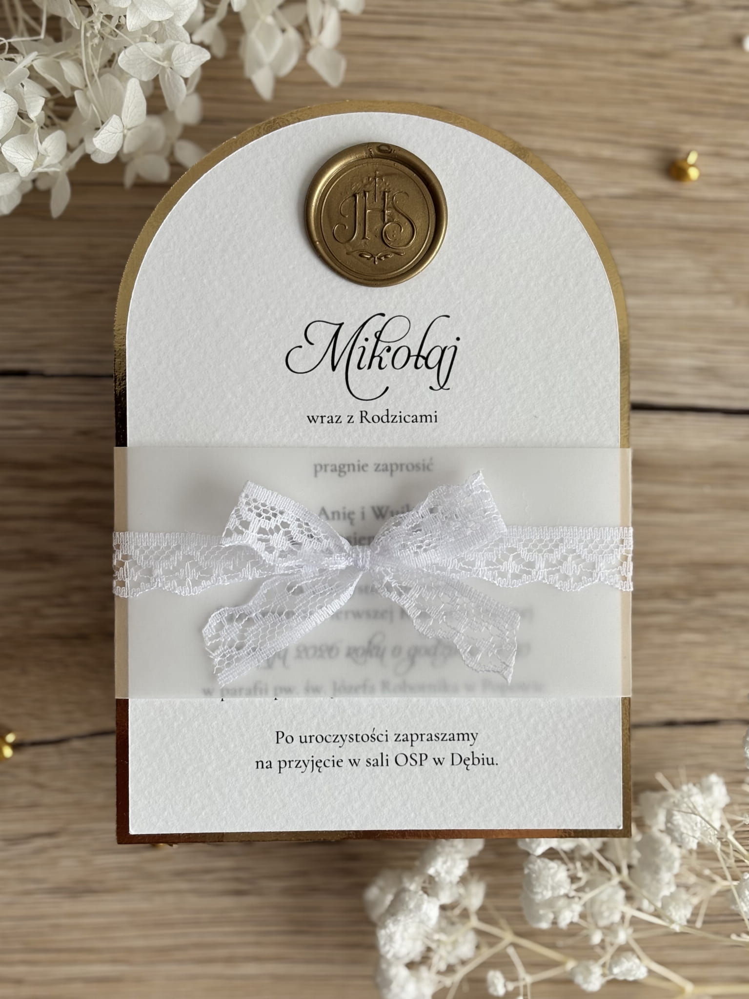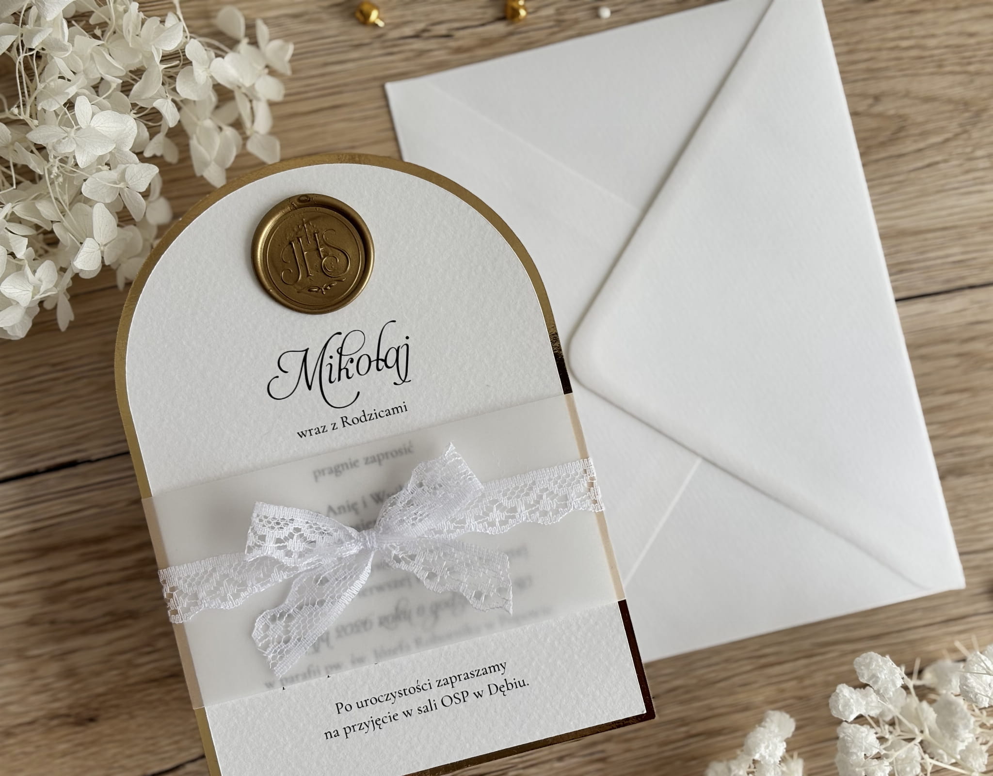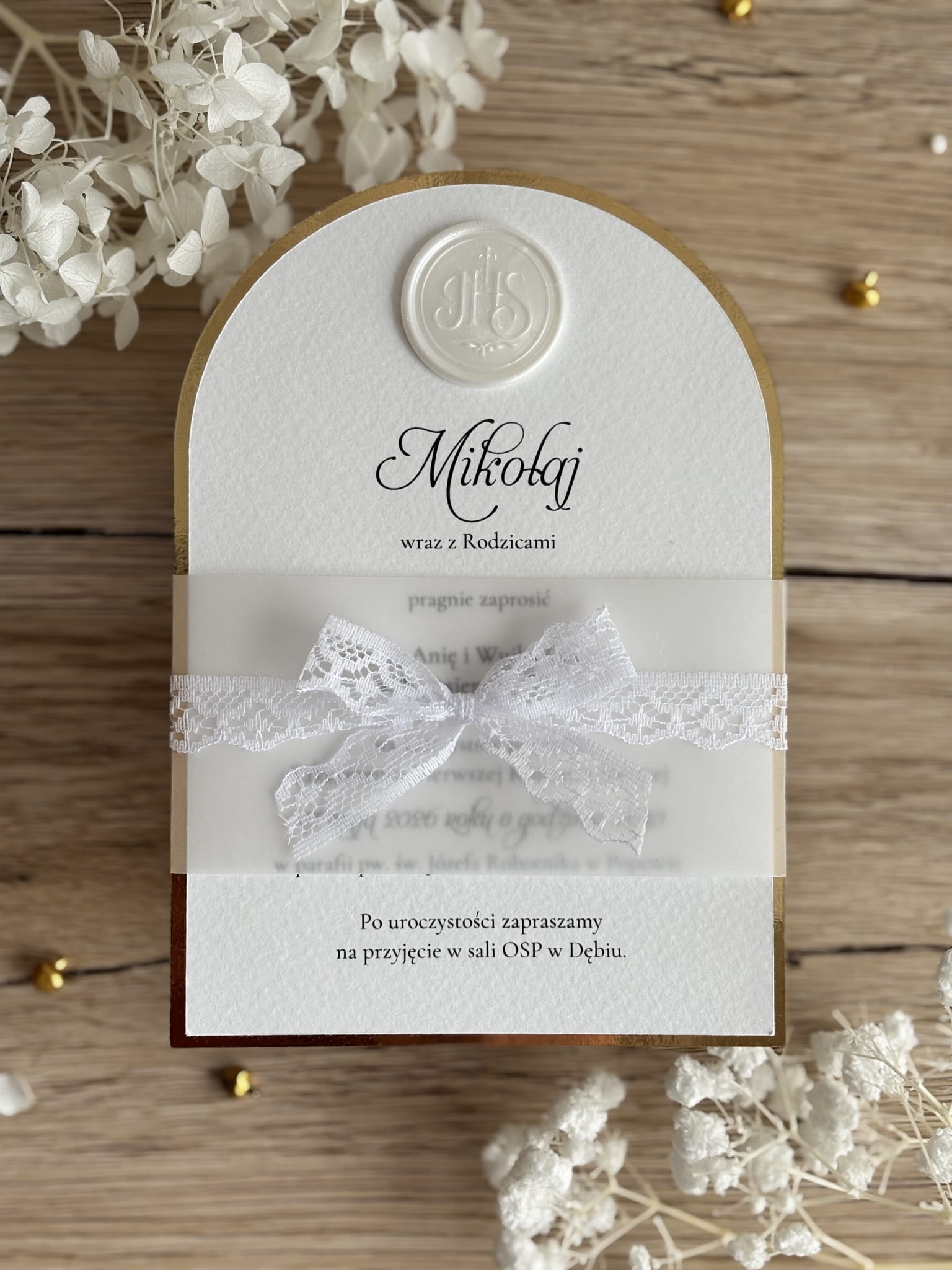 Zaproszenie wykonane jest z ozdobnego, fakturowanego papieru w odcieniu bieli, który nadaje całości subtelnej i ponadczasowej elegancji. Charakterystycznym elementem projektu jest półokrągłe wykończenie ze złotą ramką, podkreślającą uroczysty charakter wydarzenia. Górną część zaproszenia zdobi delikatna kalka z eleganckim nadrukiem oraz dekoracyjna, koronkowa kokarda, która dodaje całości lekkości i wyjątkowego stylu.