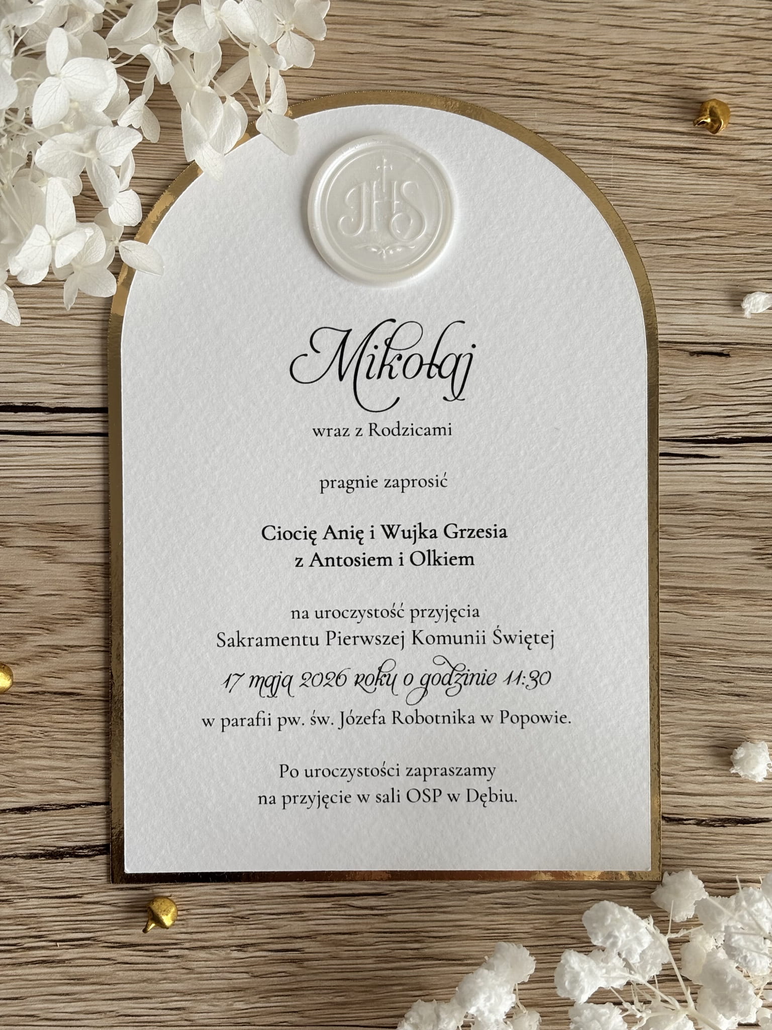 Na froncie zaproszenia znajduje się ozdobna pieczęć z symbolem IHS, nawiązująca do religijnego charakteru uroczystości Pierwszej Komunii Świętej. Wnętrze zaproszenia zawiera personalizowaną treść z imieniem dziecka, danymi uroczystości oraz informacjami dotyczącymi przyjęcia.