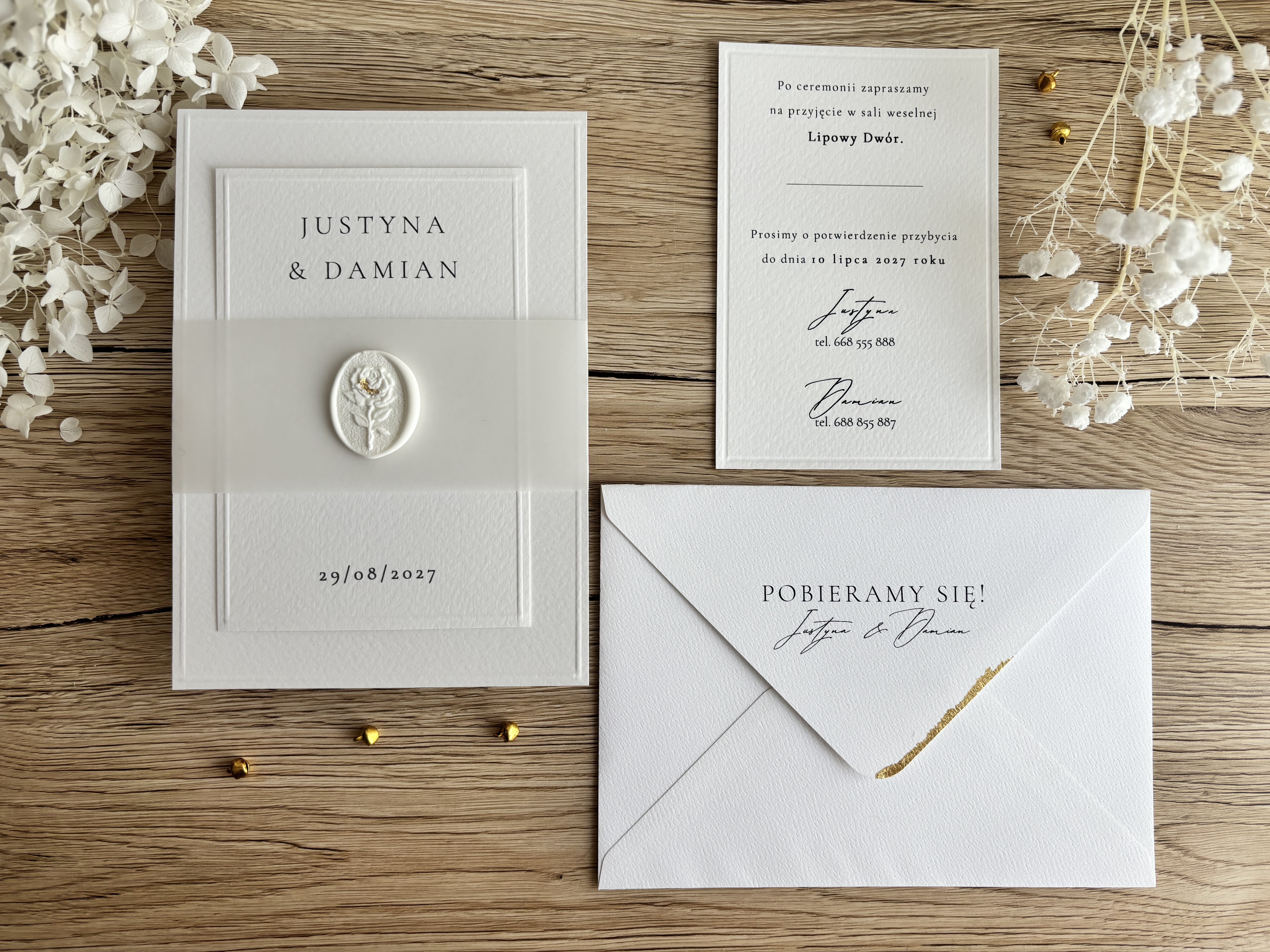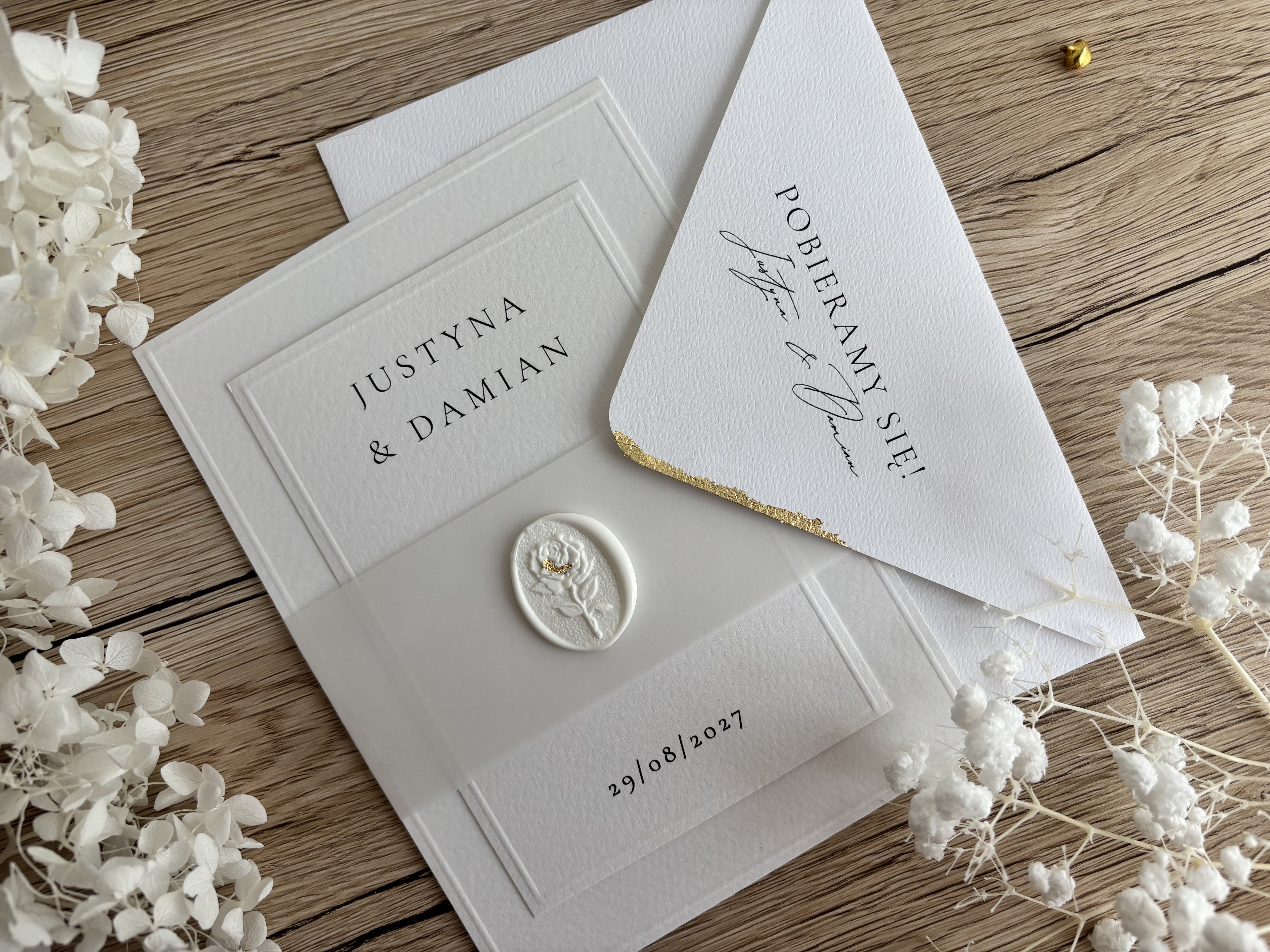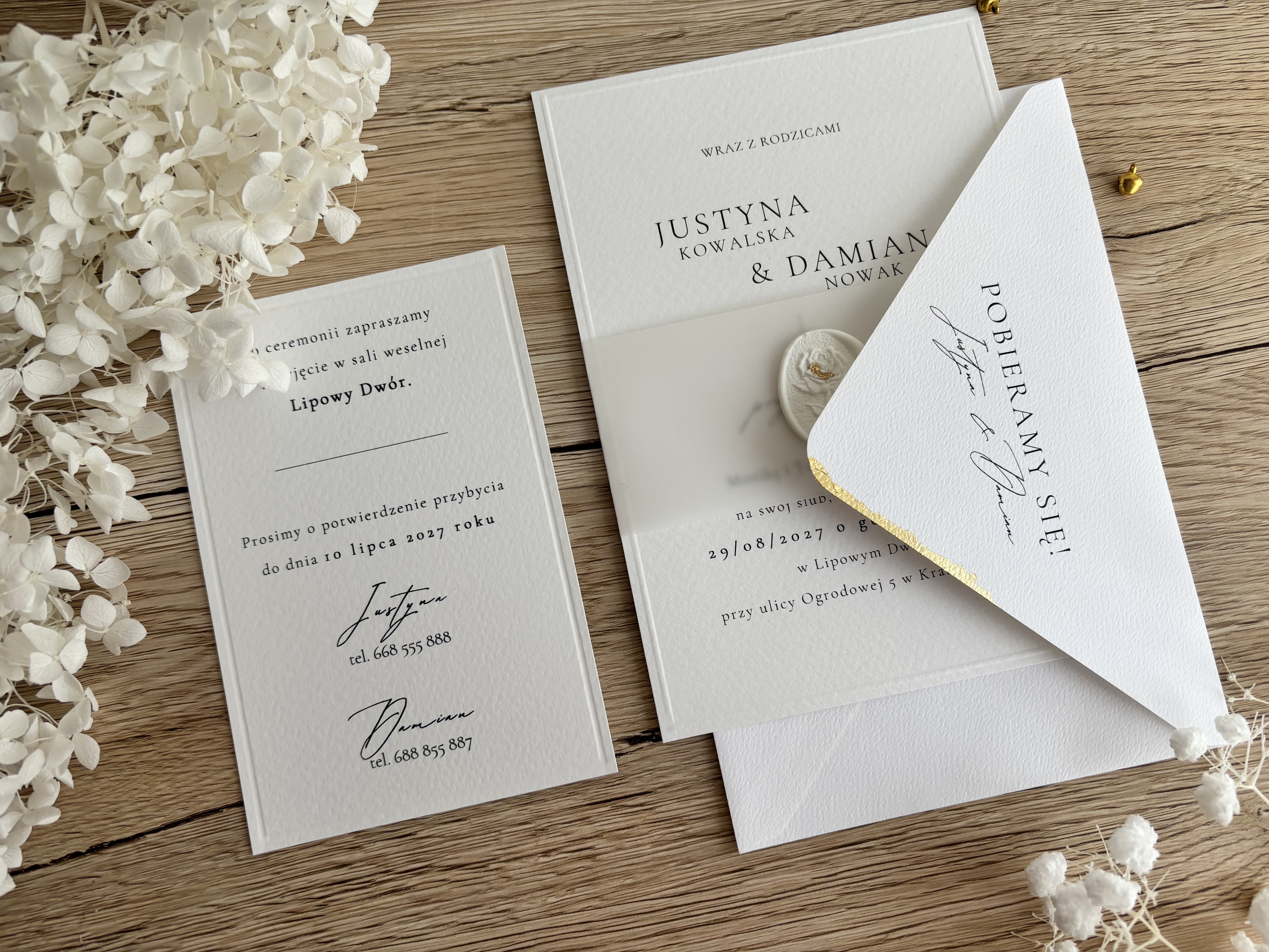Wyjątkowe zaproszenia ślubne stworzone dla par ceniących ponadczasową elegancję i dopracowane detale. Połączenie wysokiej jakości papieru fakturowanego, półtransparentnej kalki oraz ręcznie wykonanej pieczęci lakowej tworzy harmonijną, luksusową kompozycję.
