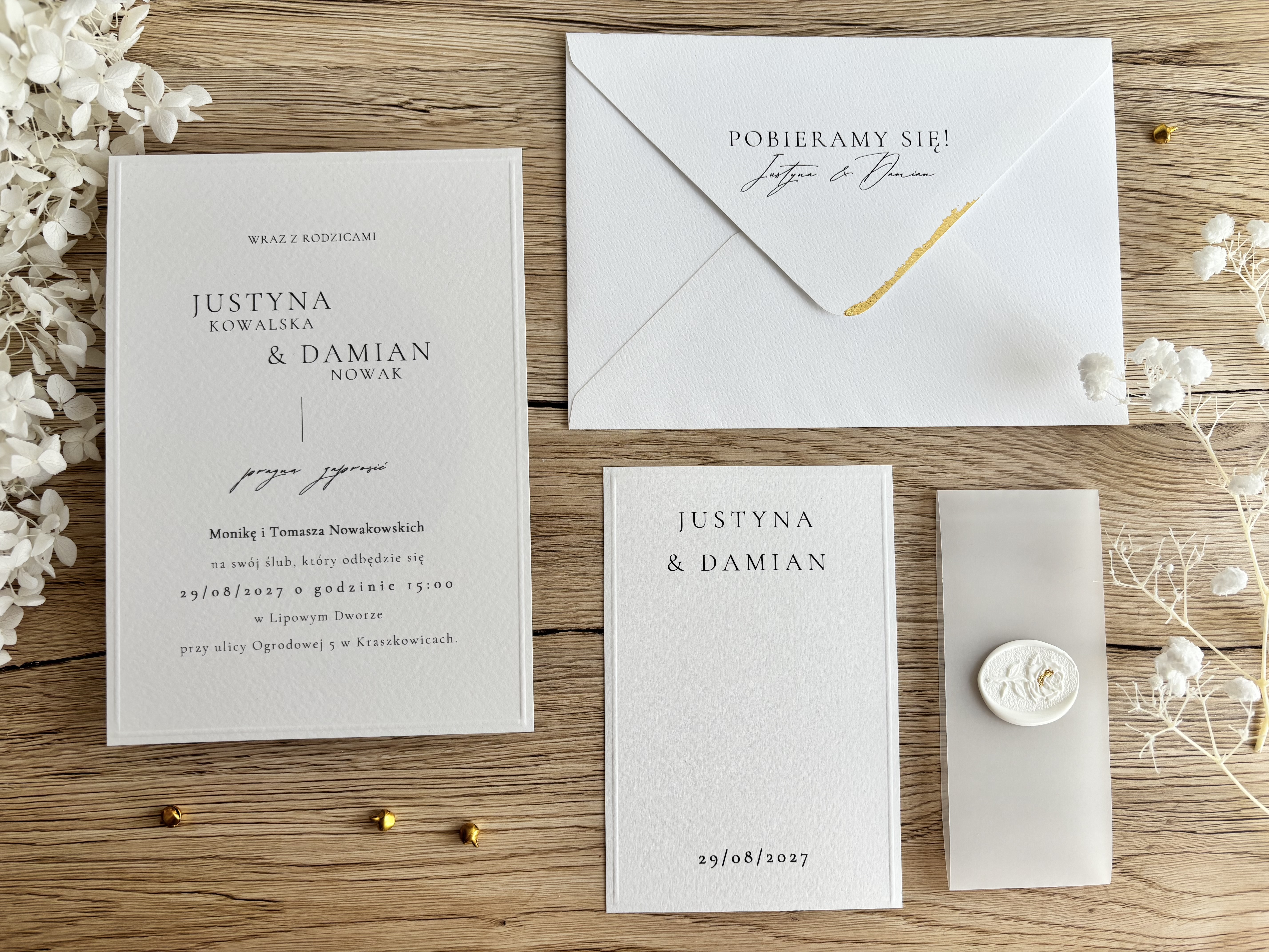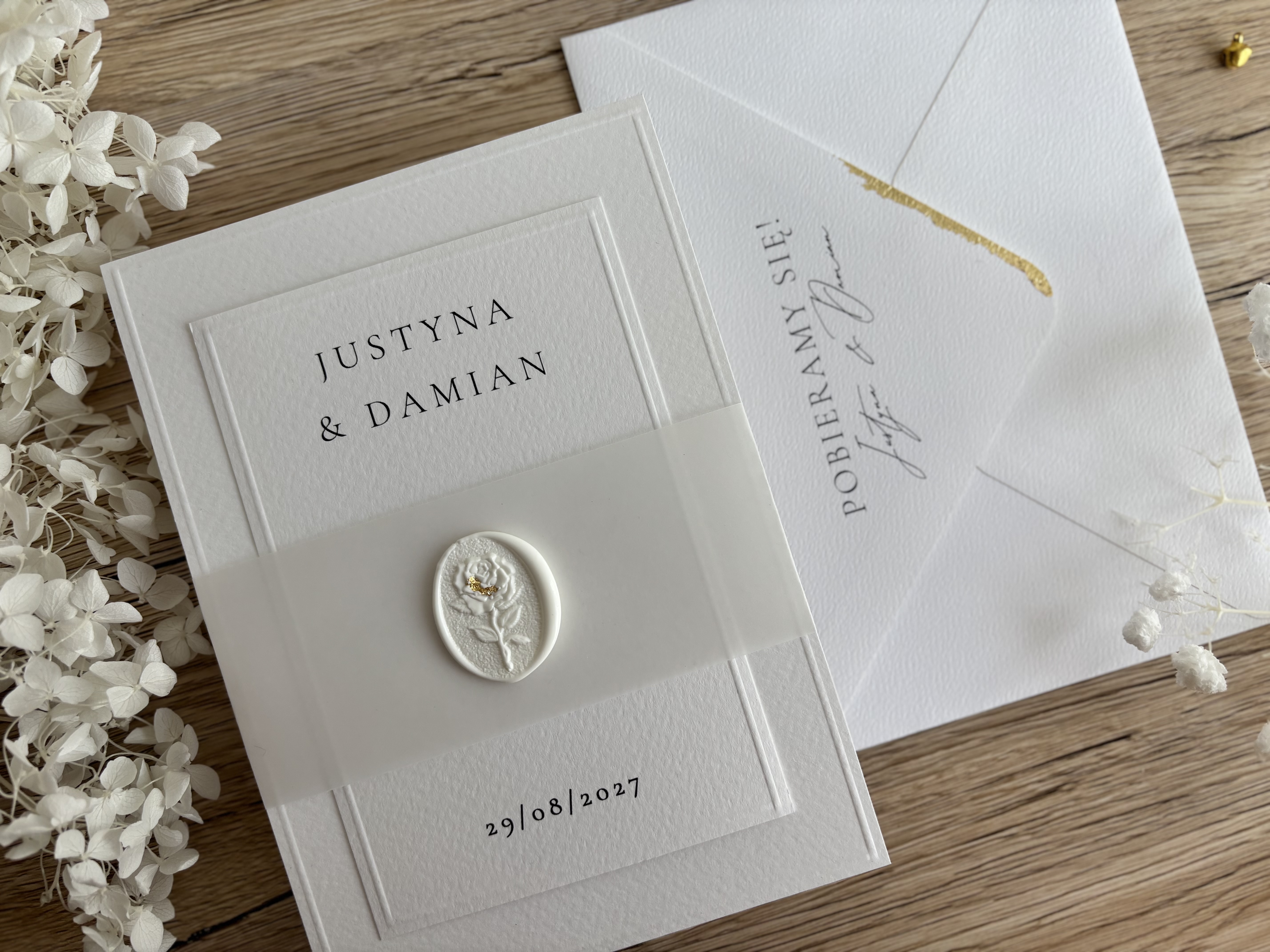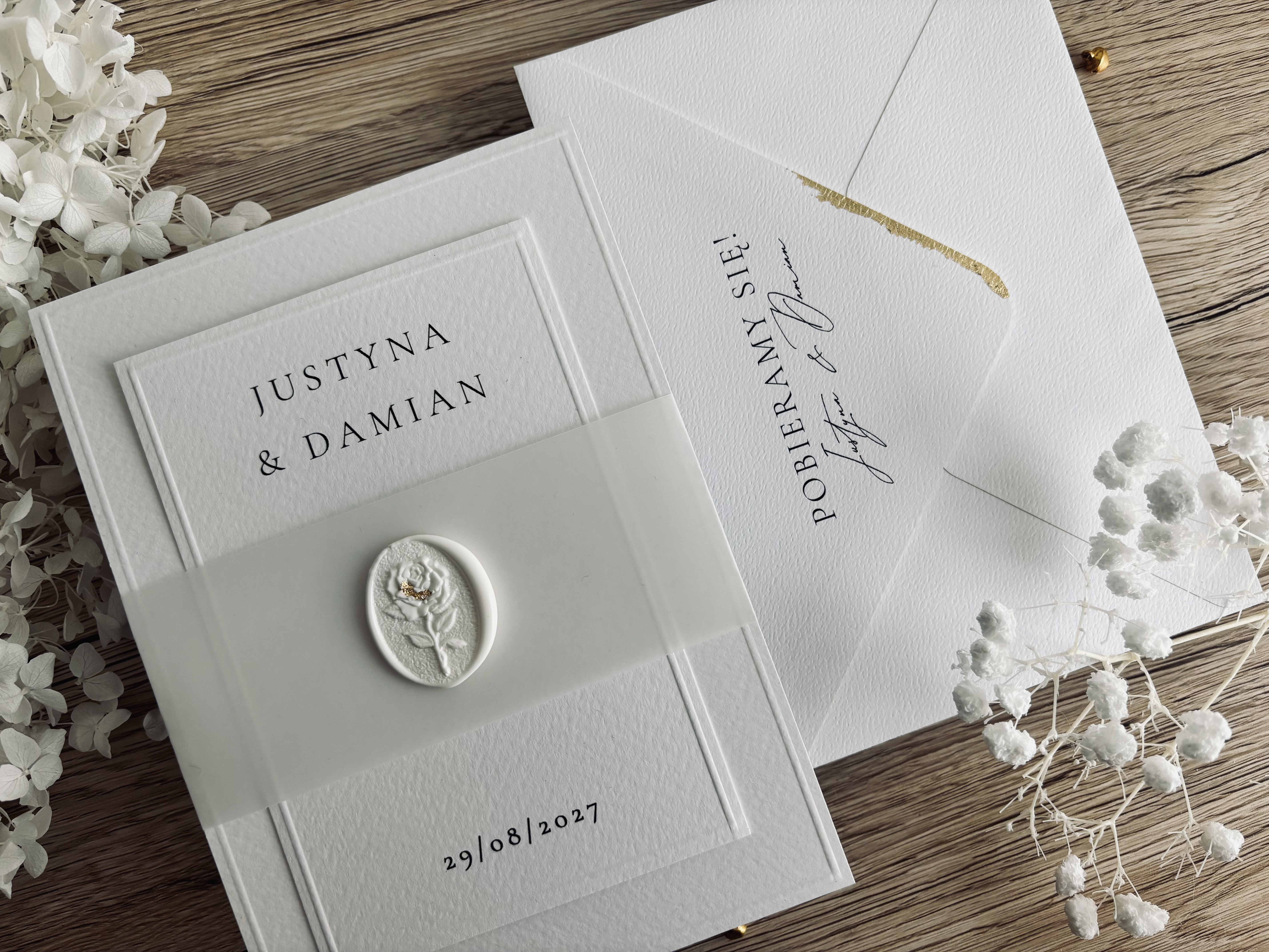 Wyjątkowe zaproszenia ślubne stworzone dla par ceniących ponadczasową elegancję i dopracowane detale. Połączenie wysokiej jakości papieru fakturowanego, półtransparentnej kalki oraz ręcznie wykonanej pieczęci lakowej tworzy harmonijną, luksusową kompozycję.
