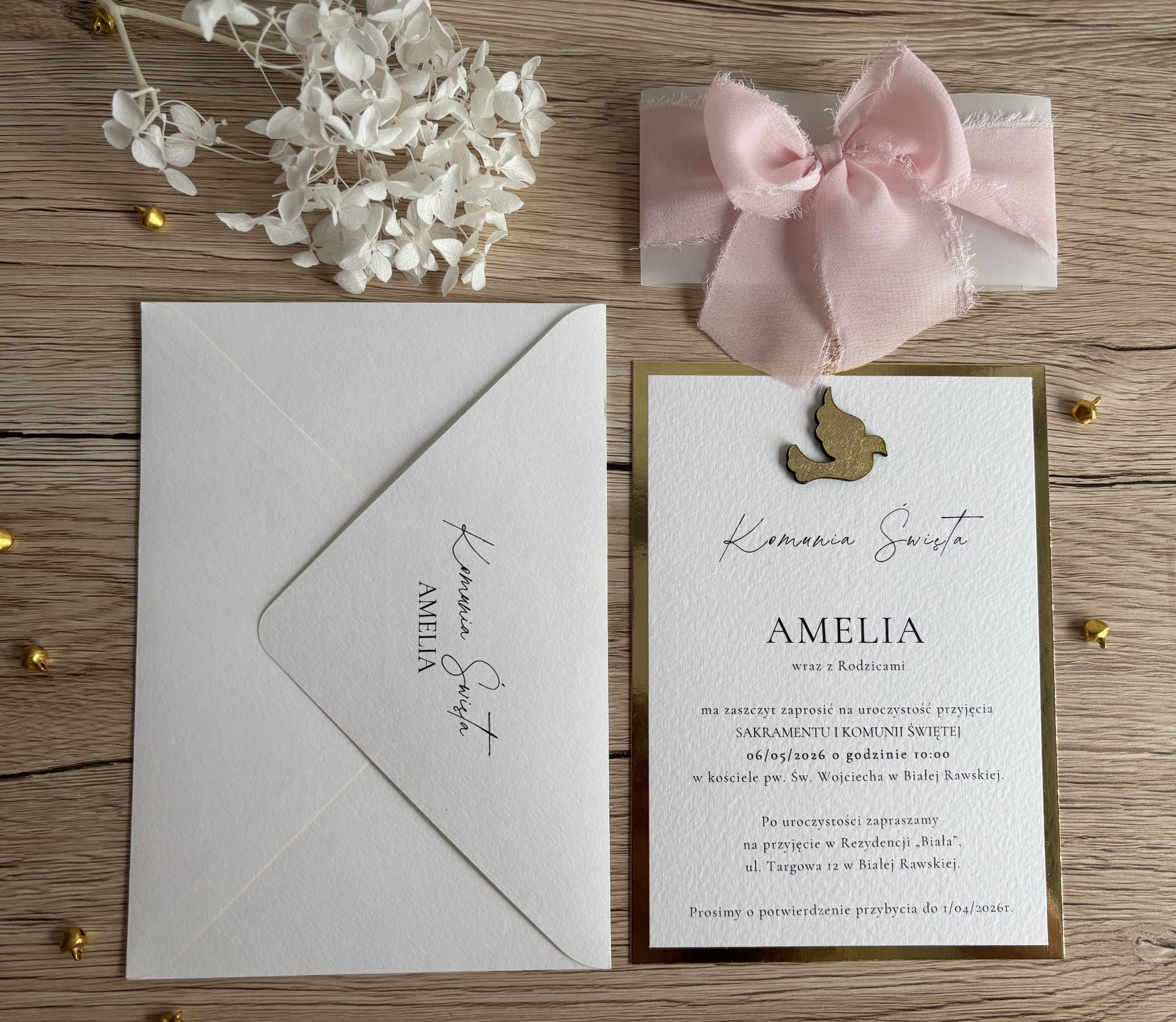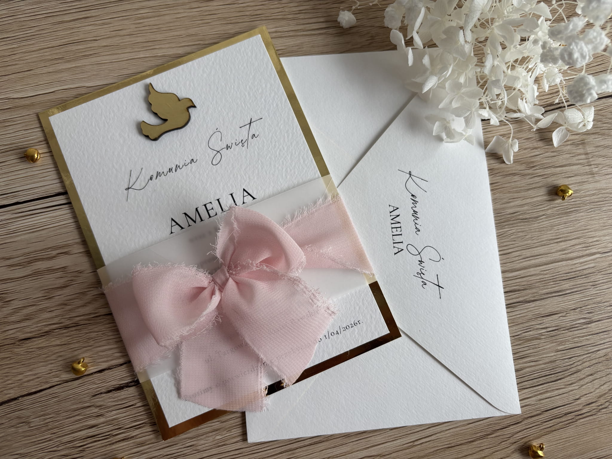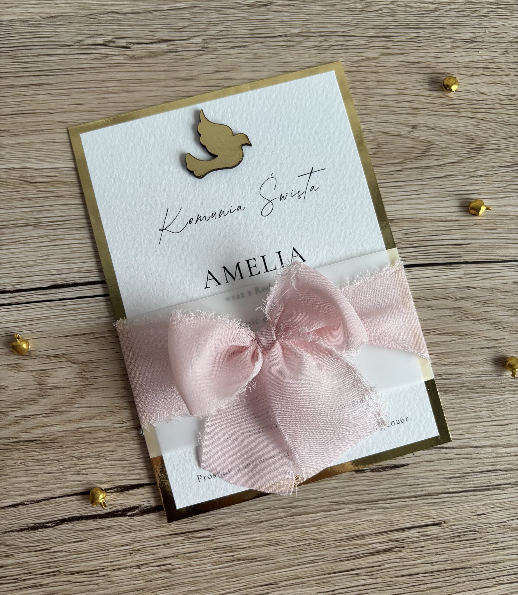 Eleganckie zaproszenie na Komunię Świętą, które łączy w sobie subtelną delikatność i uroczysty charakter. Wykonane z wysokiej jakości papieru fakturowanego, złotego papieru który tworzy ramkę oraz symbolem gołębicy – znakiem pokoju i czystości. Całość dopełnia opaska z kalki z romantyczną, różową kokardą z tkaniny, dodająca wyjątkowego uroku.