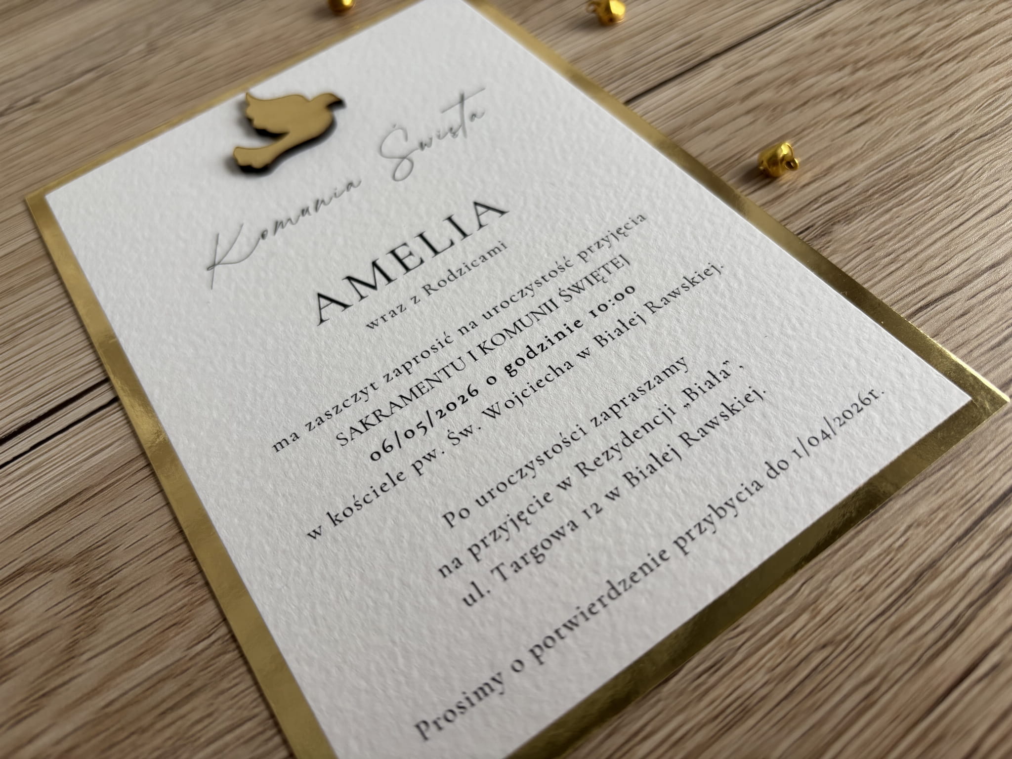 Zaproszenie na Komunię Świętą z kokardą i złotym gołębiem
