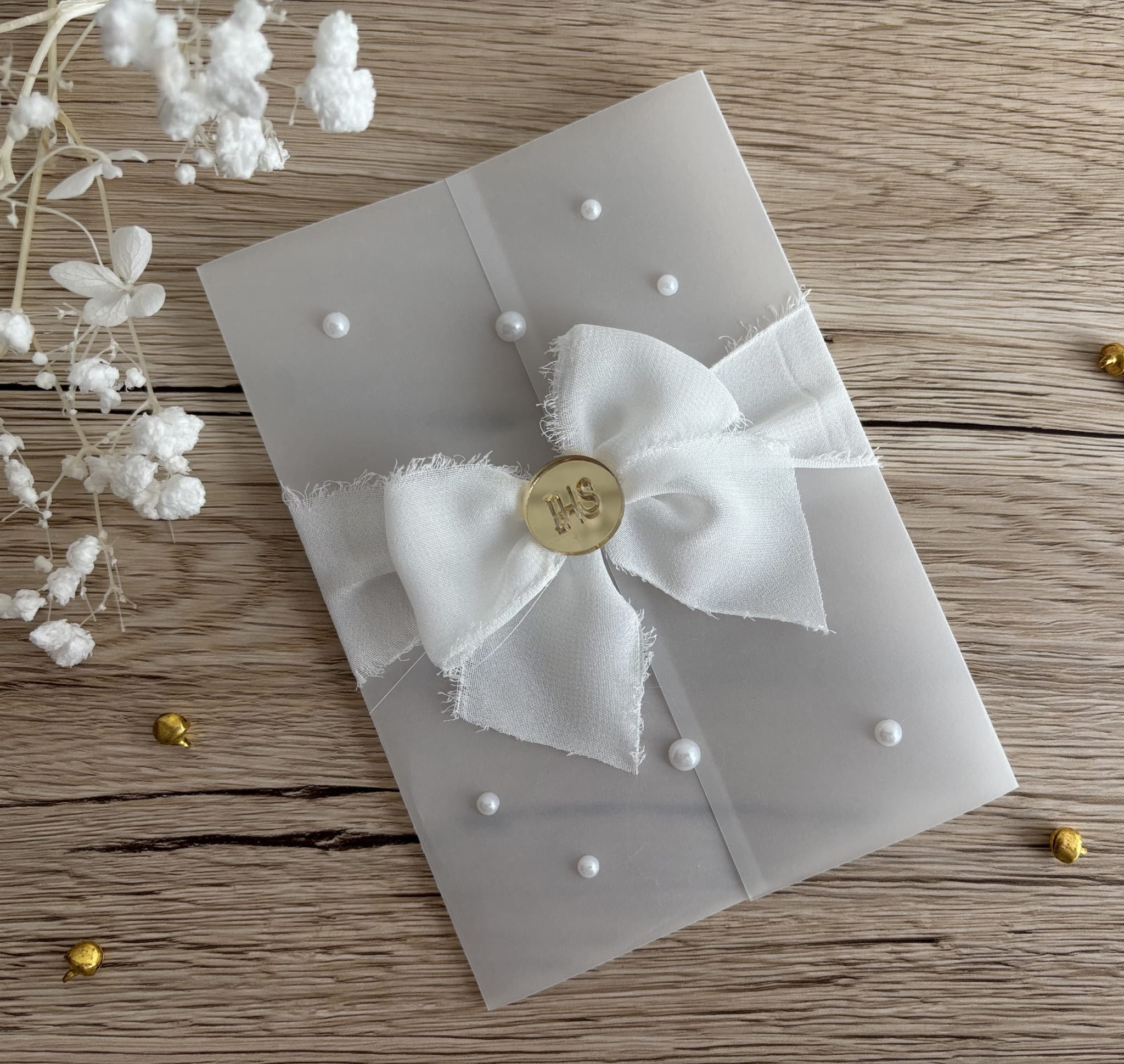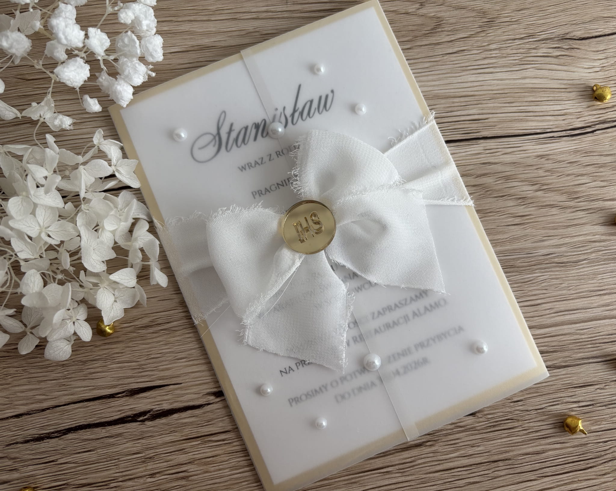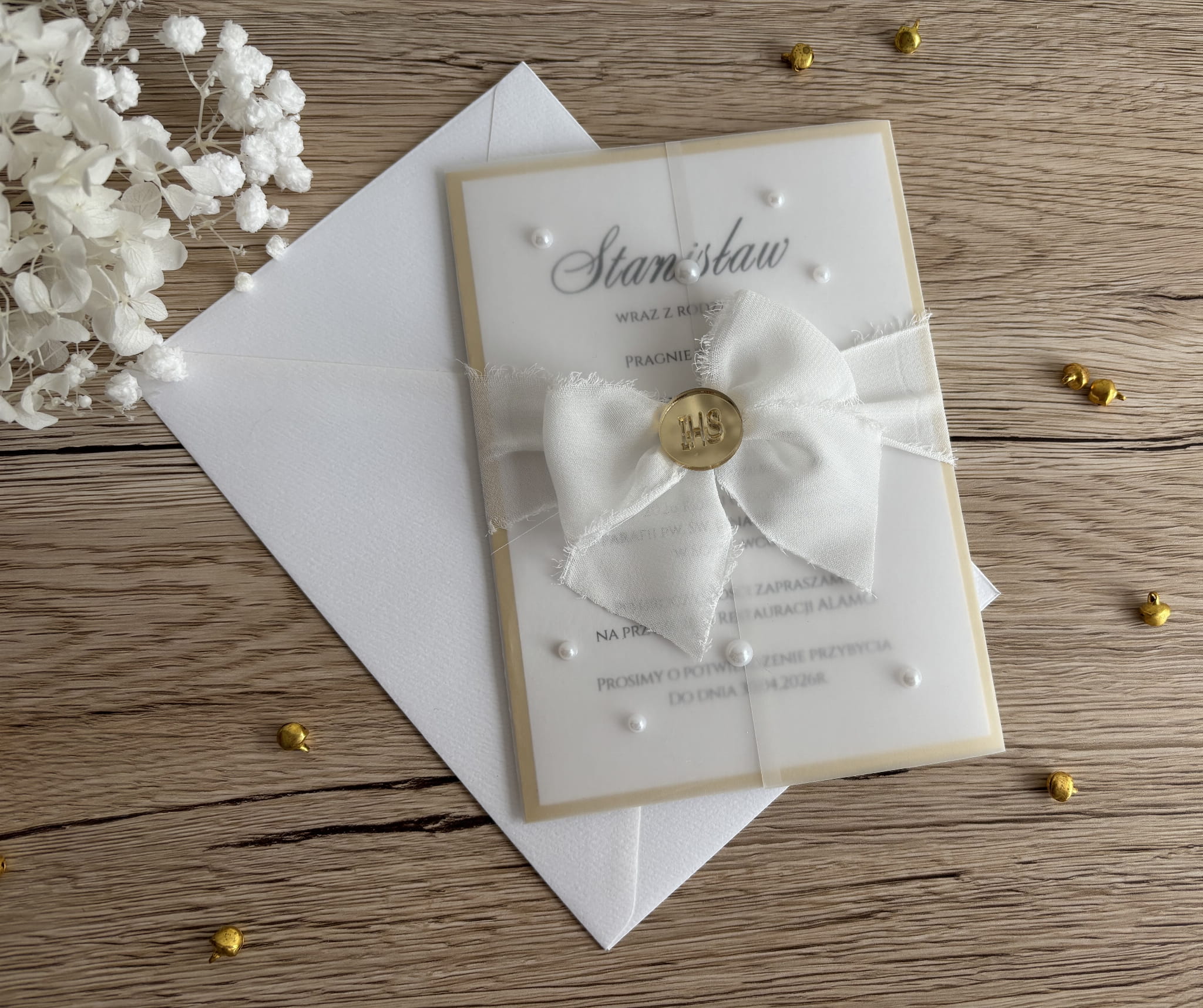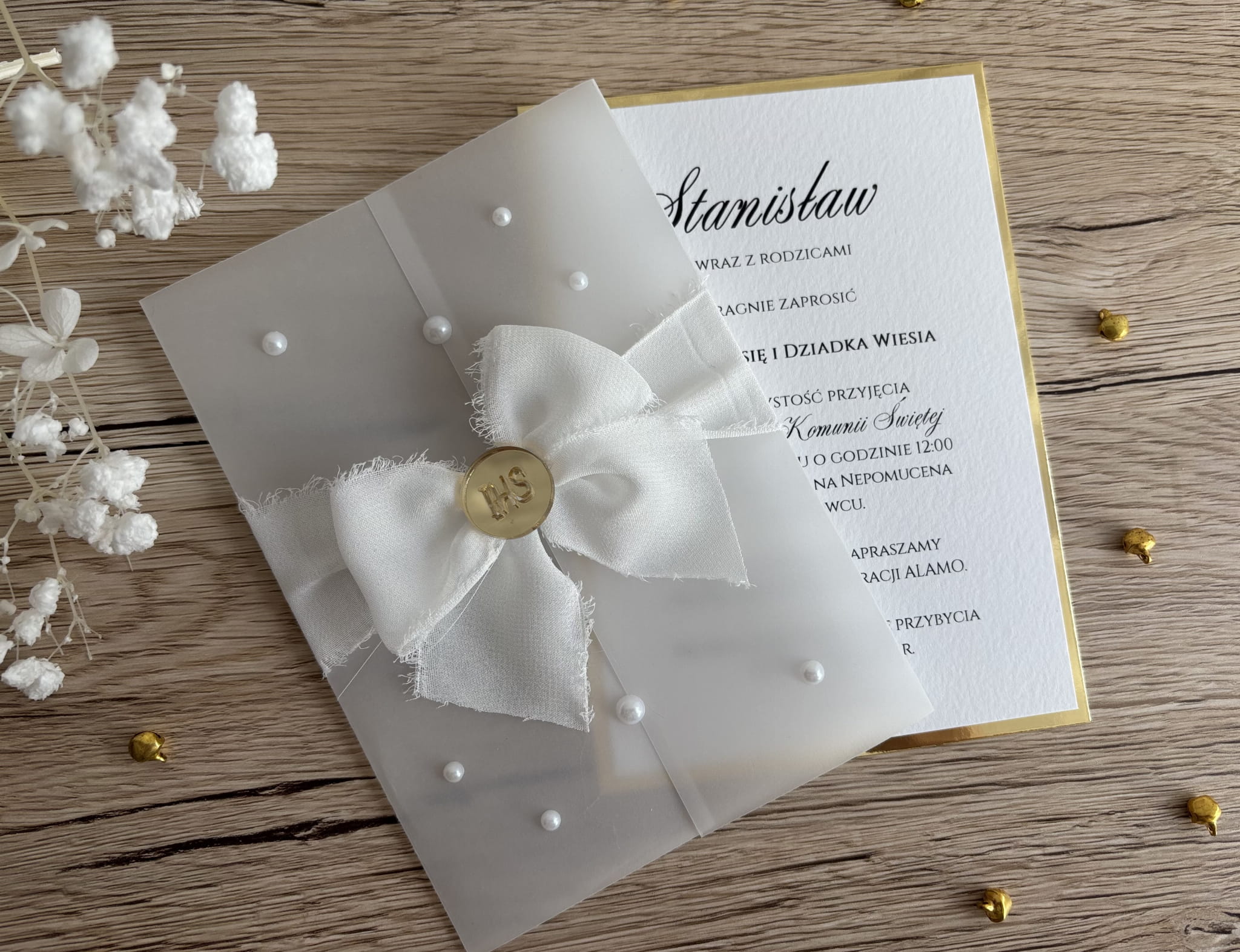 Eleganckie zaproszenie na Pierwszą Komunię Świętą, które zachwyca subtelnością i klasą. Wykonane z wysokiej jakości papieru w odcieniu ecru, ozdobione półprzezroczystą kalką, delikatnymi perełkami oraz efektowną kokardą z muślinowej wstążki. Centralnym punktem dekoracji jest złoty symbol IHS – piękne, religijne dopełnienie całej kompozycji.
