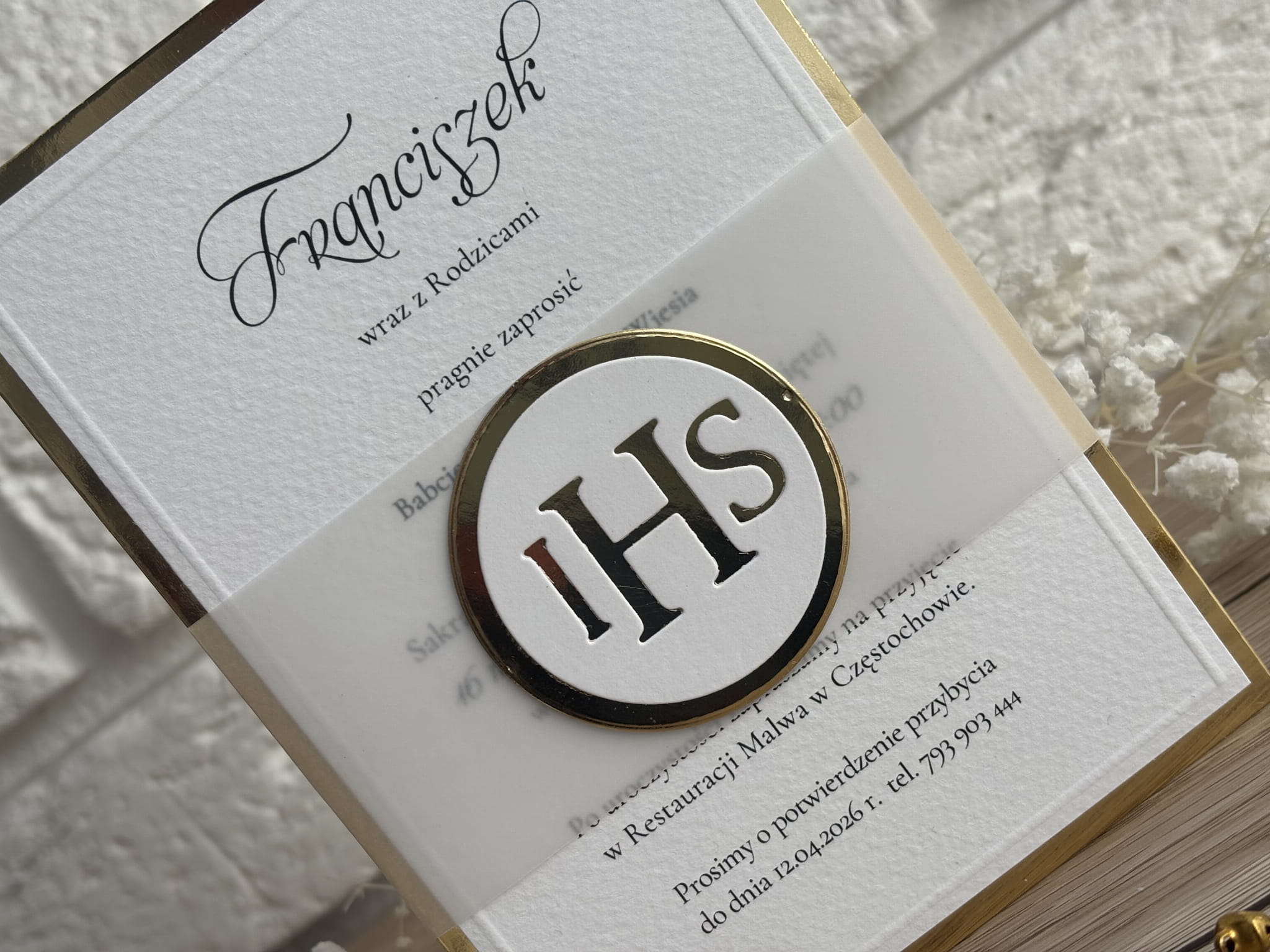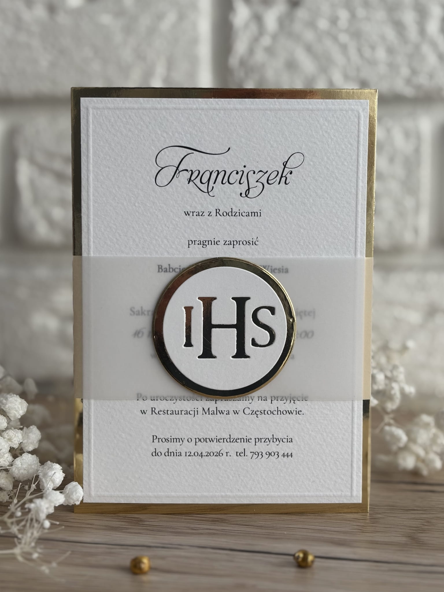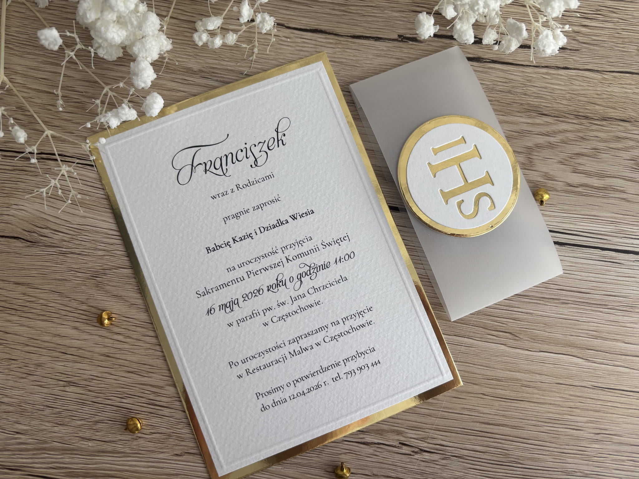 Zaproszenie wykonane jest na szlachetnym, grubym papierze o delikatnej fakturze, który podkreśla uroczysty charakter wydarzenia. Centralnym elementem jest okrągły emblemat z napisem IHS, symbolizujący Jezusa Chrystusa i sakrament Eucharystii. Całość dopełnia złota ramka, nadająca zaproszeniu luksusowego i ponadczasowego wyglądu.
