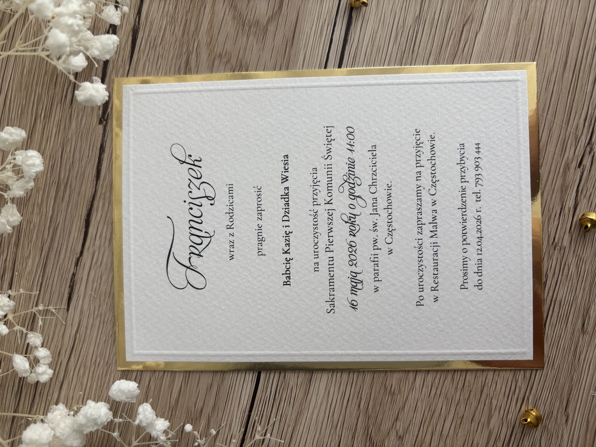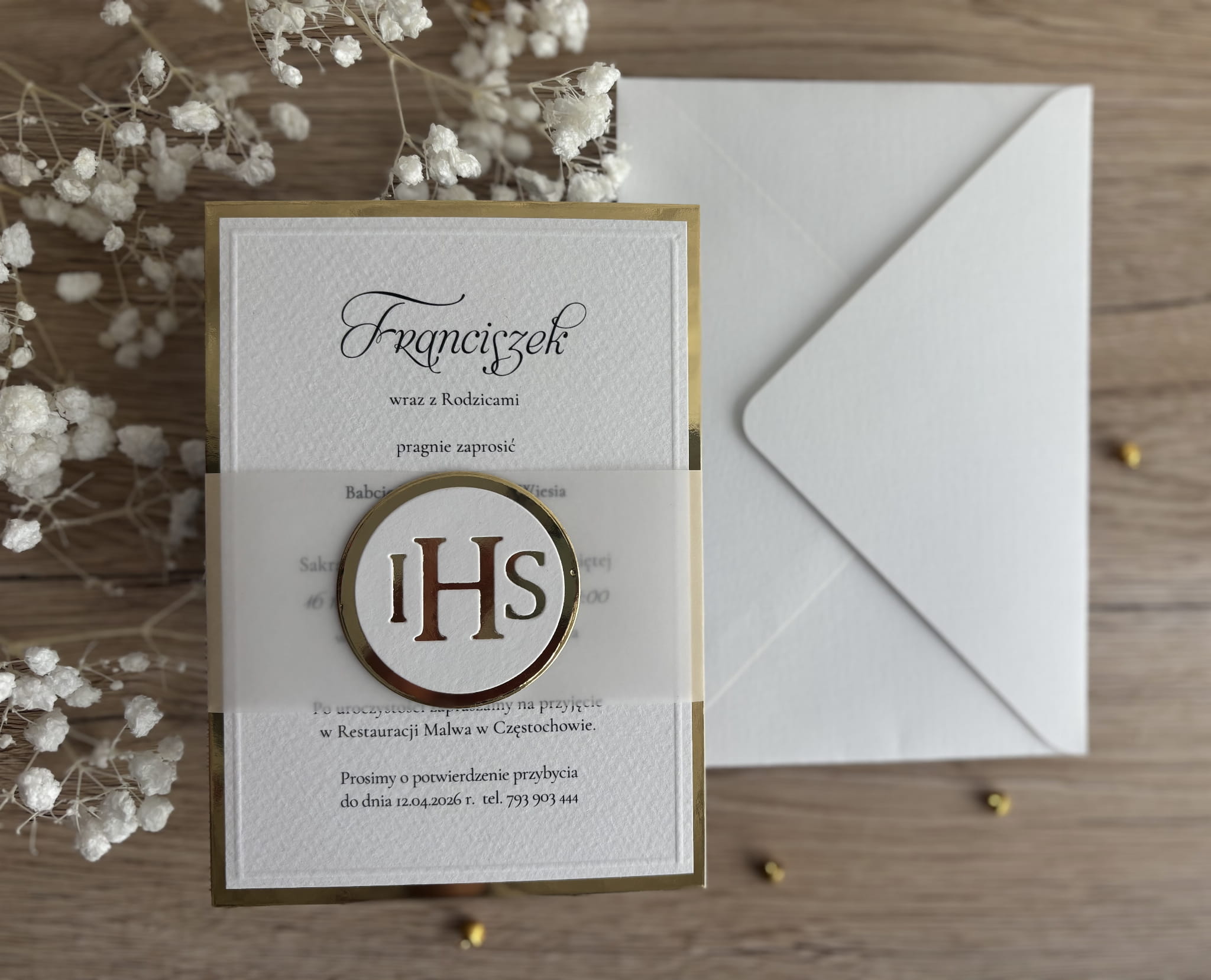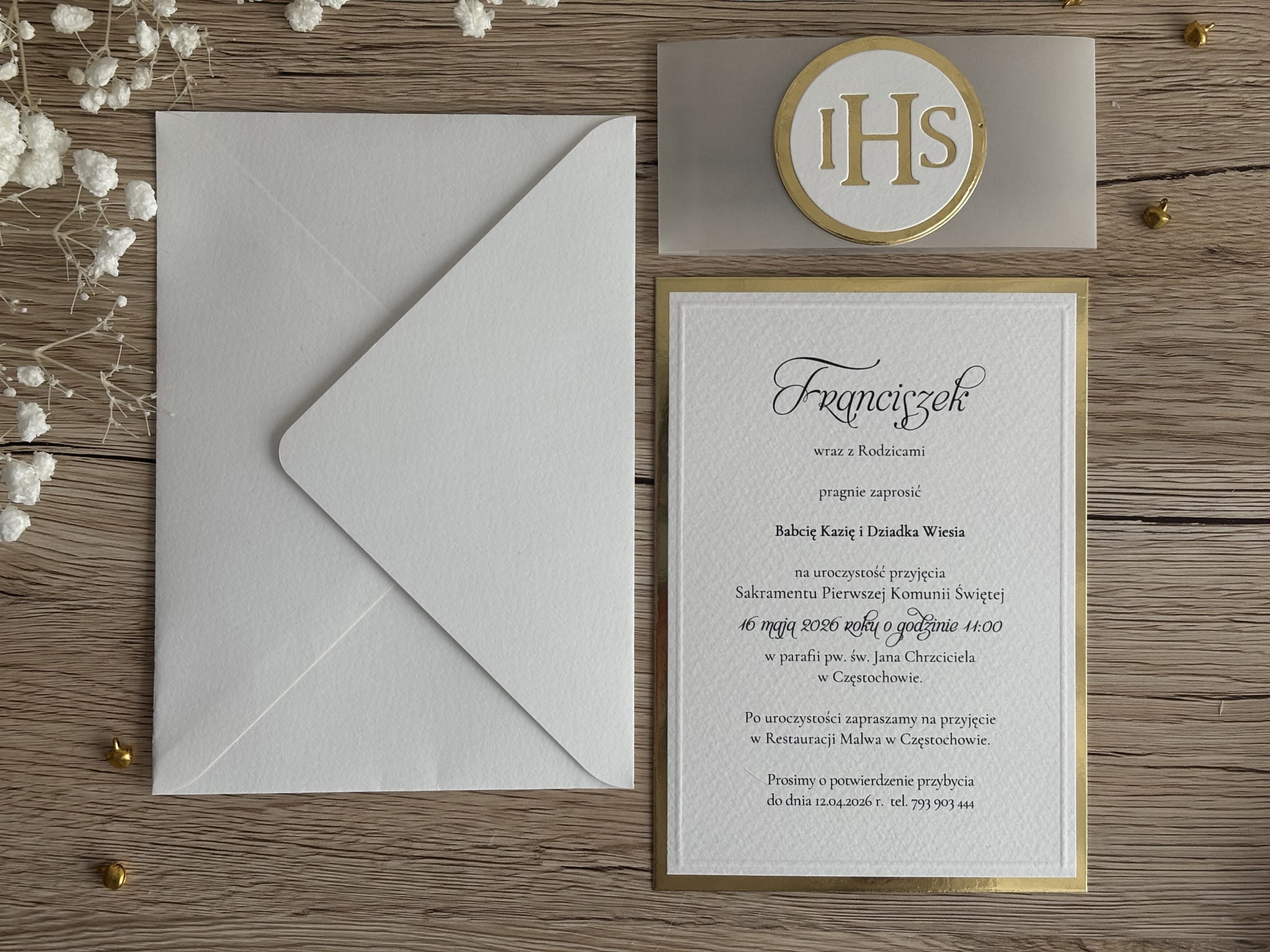 Zaproszenie wykonane jest na szlachetnym, grubym papierze o delikatnej fakturze, który podkreśla uroczysty charakter wydarzenia. Centralnym elementem jest okrągły emblemat z napisem IHS, symbolizujący Jezusa Chrystusa i sakrament Eucharystii. Całość dopełnia złota ramka, nadająca zaproszeniu luksusowego i ponadczasowego wyglądu.