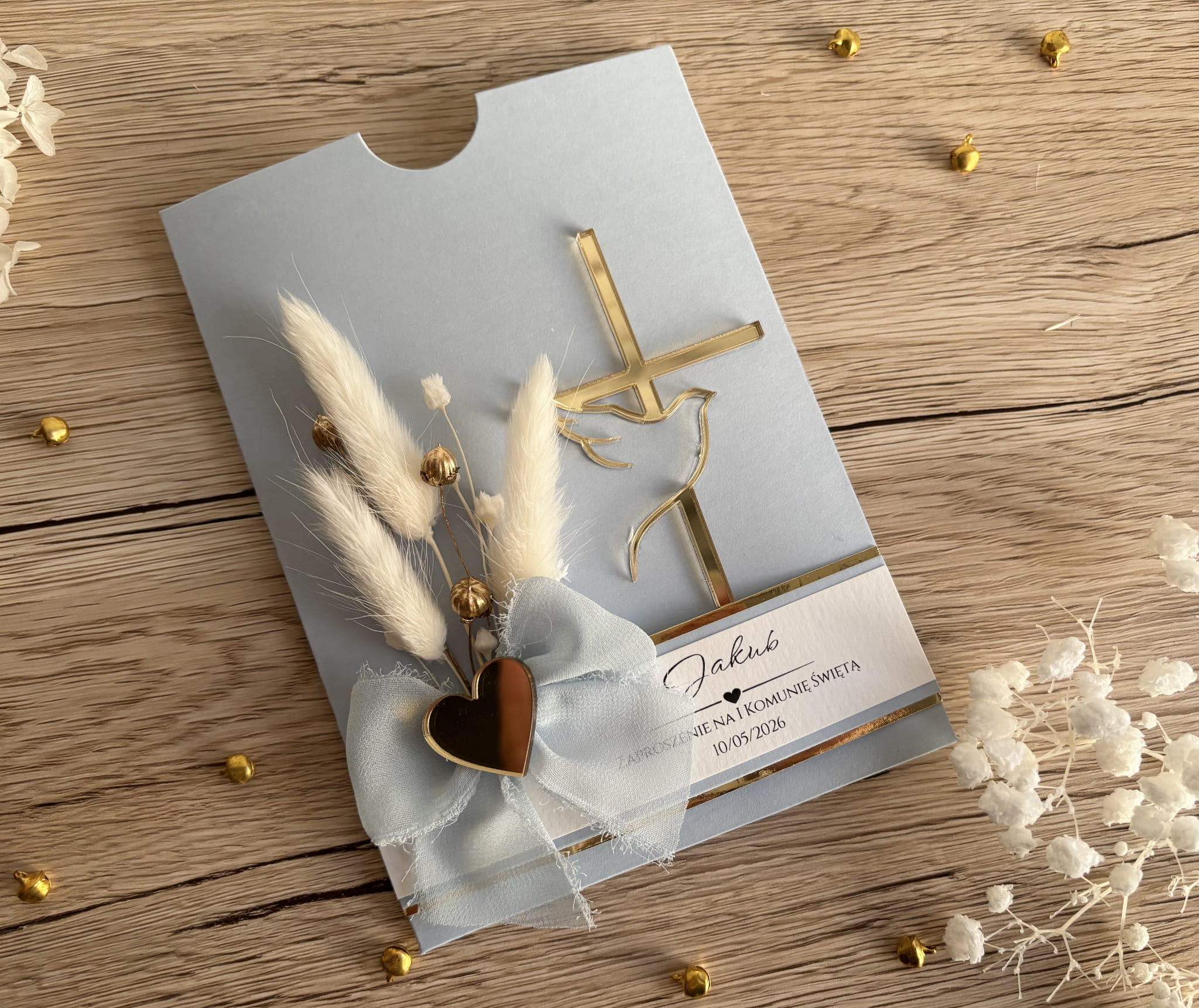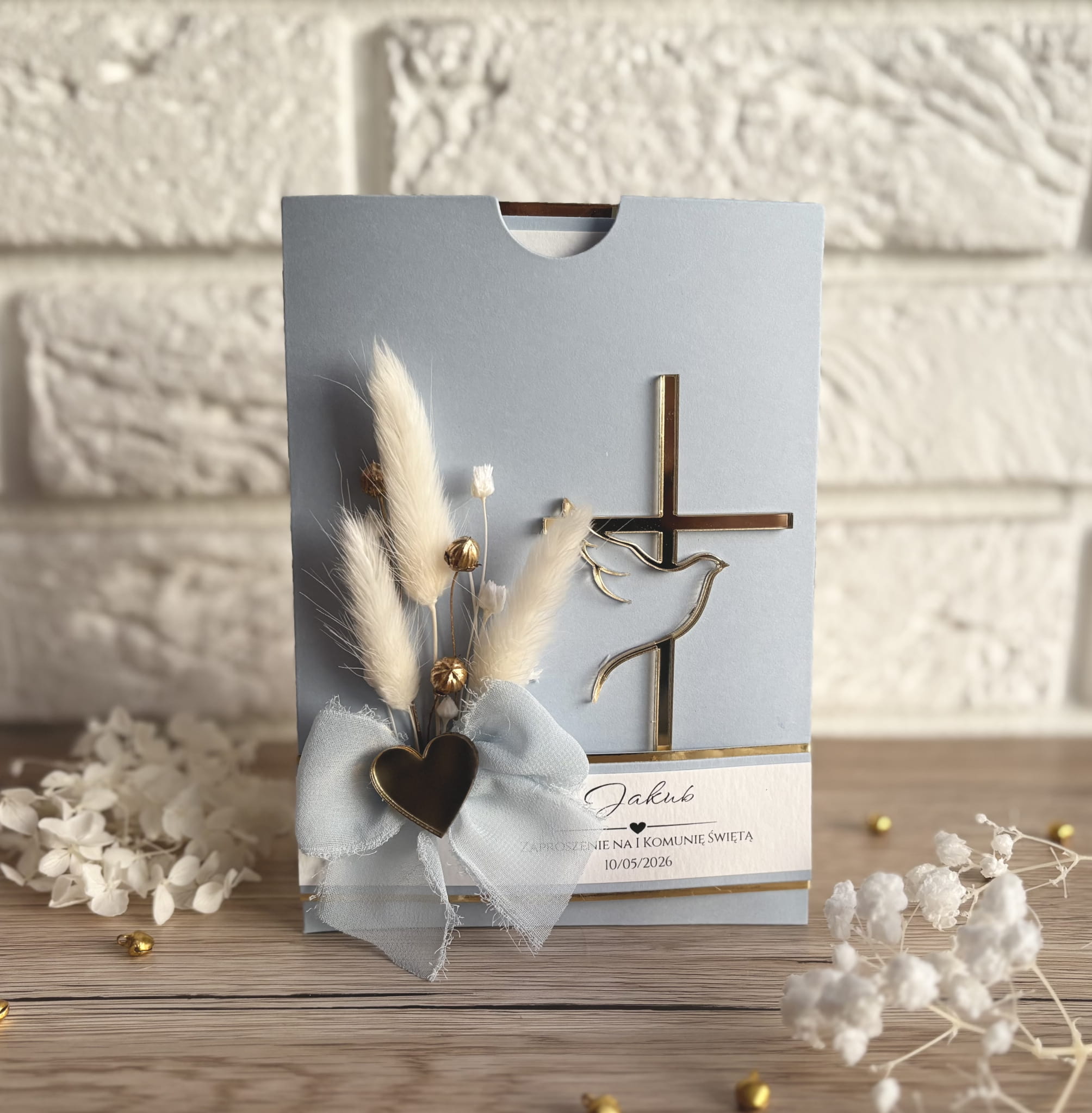 Wykonane z pastelowego papieru w odcieniu pudrowego różu, ozdobione złotym krzyżem z gołębiem – symbolem Ducha Świętego. Ręcznie komponowana wiązanka z naturalnych suszonych kwiatów i subtelna kokarda z materiału dodają całości uroku i niepowtarzalnego charakteru.