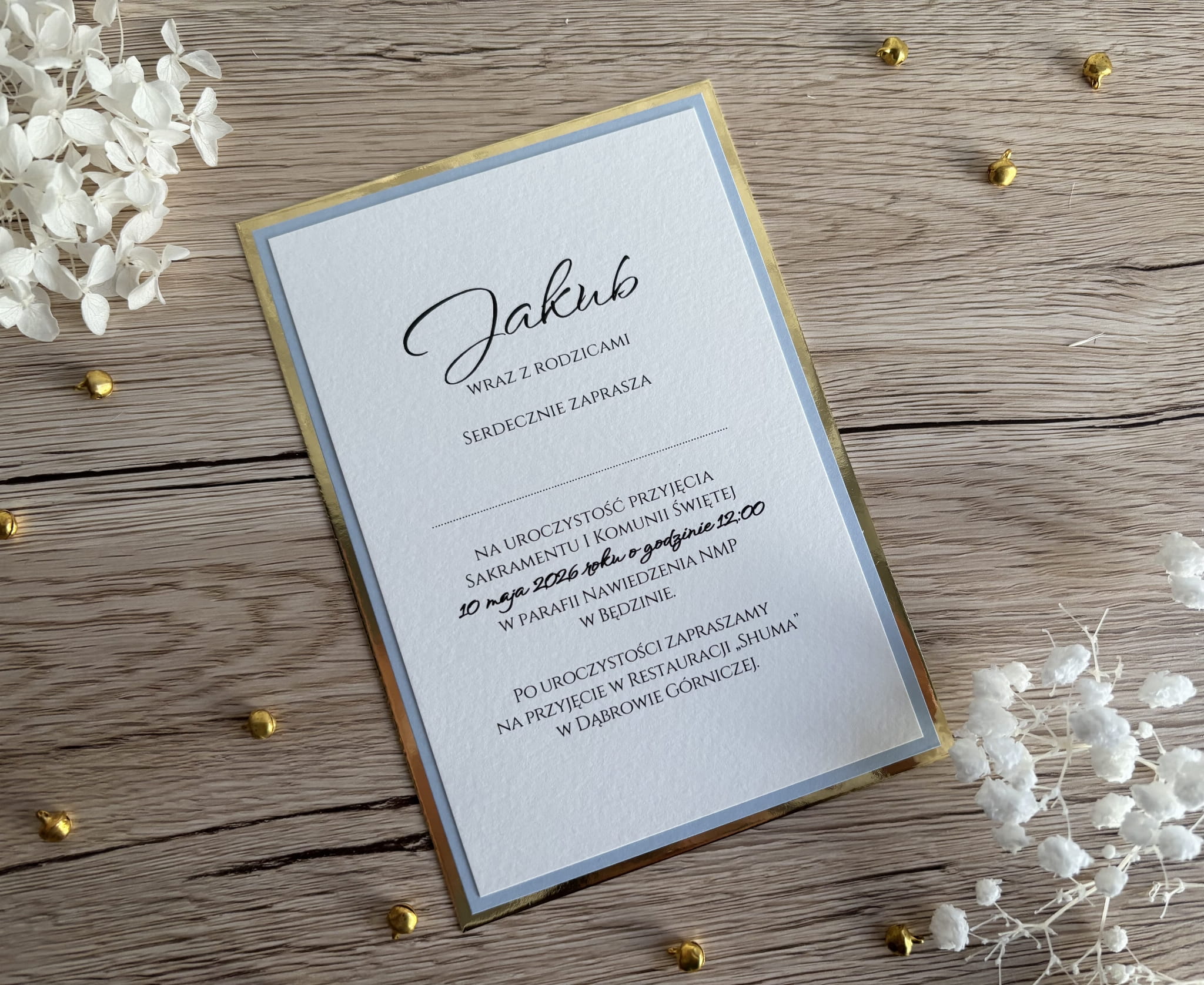 Wkładka wewnętrzna drukowana na papierze fakturowanym, z eleganckim złotym obramowaniem – gotowa do personalizacji (imię dziecka, data, miejsce i tekst zaproszenia).