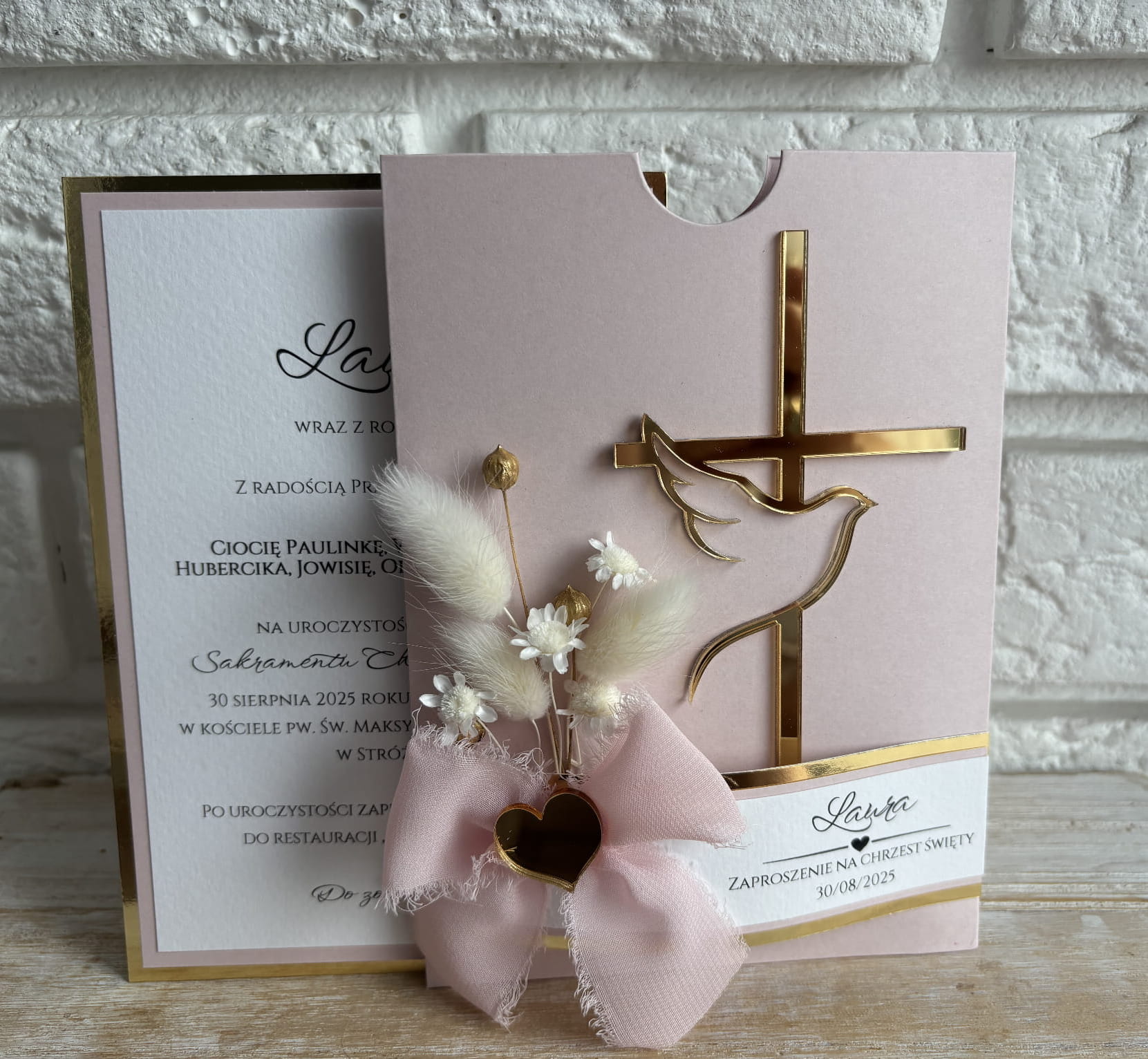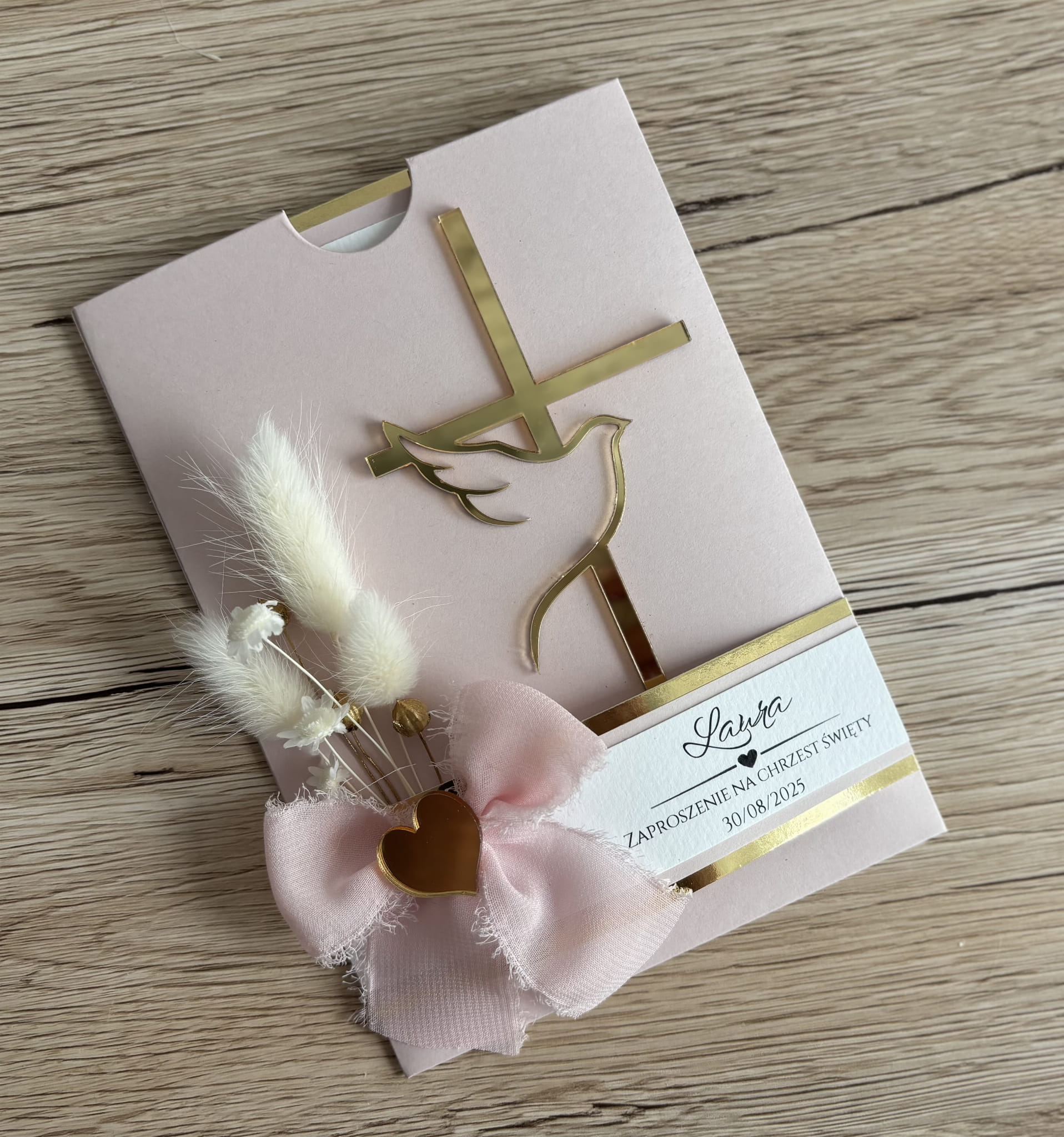 Wykonane z pastelowego papieru w odcieniu pudrowego różu, ozdobione złotym krzyżem z gołębiem – symbolem Ducha Świętego. Ręcznie komponowana wiązanka z naturalnych suszonych kwiatów i subtelna kokarda z materiału dodają całości uroku i niepowtarzalnego charakteru.