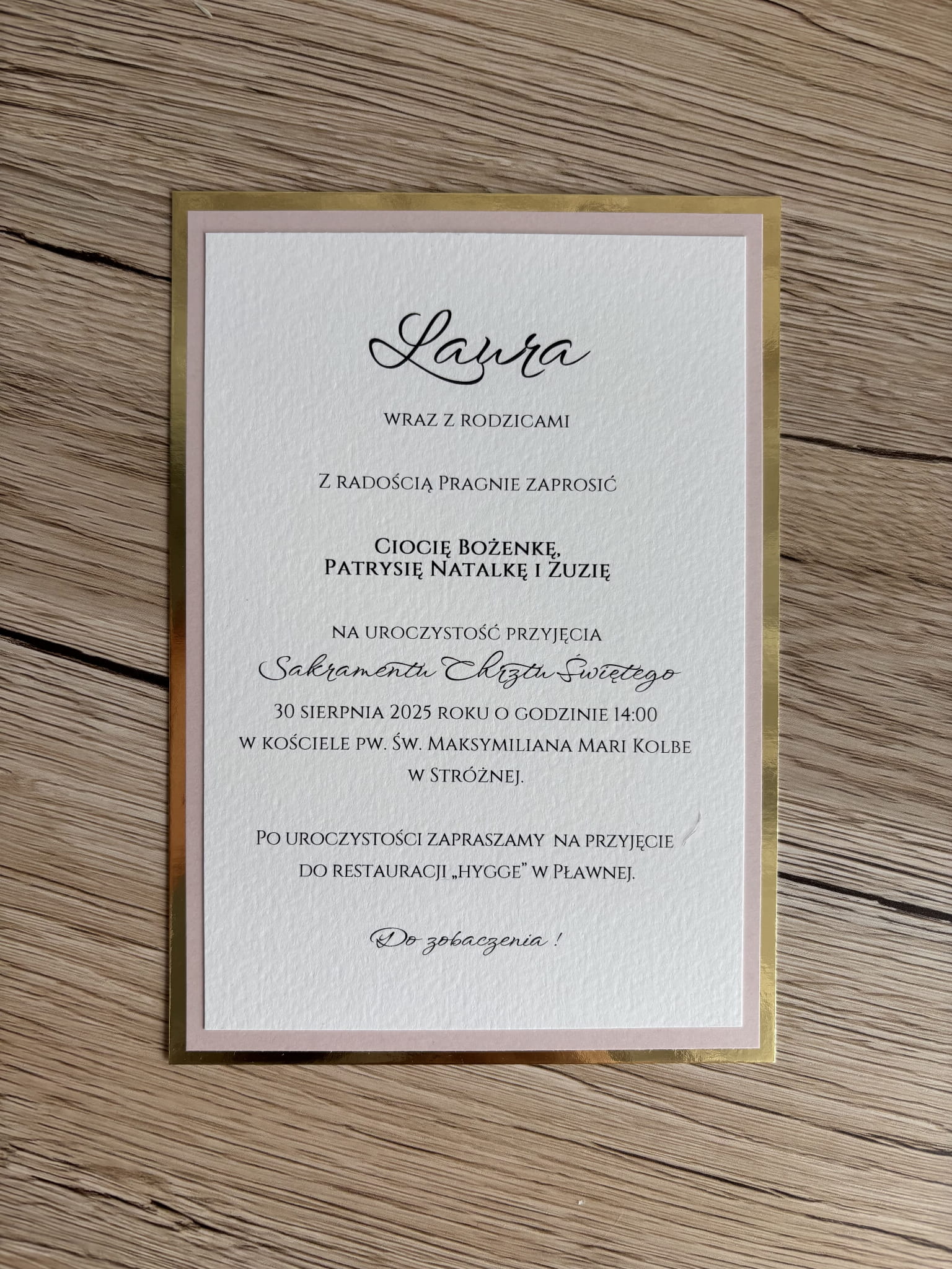 Wkładka wewnętrzna drukowana na papierze fakturowanym, z eleganckim złotym obramowaniem – gotowa do personalizacji (imię dziecka, data, miejsce i tekst zaproszenia).