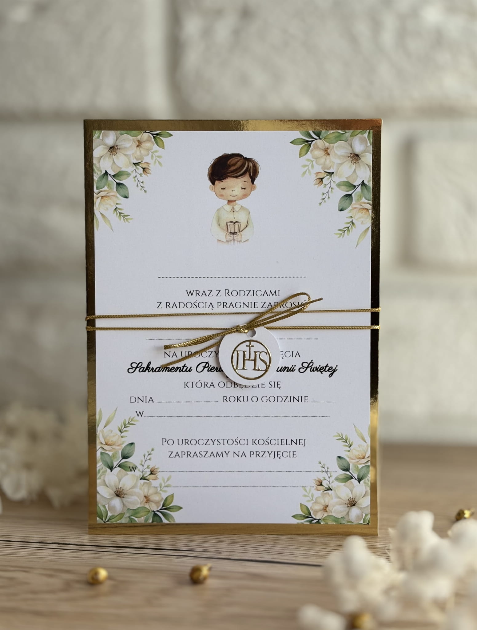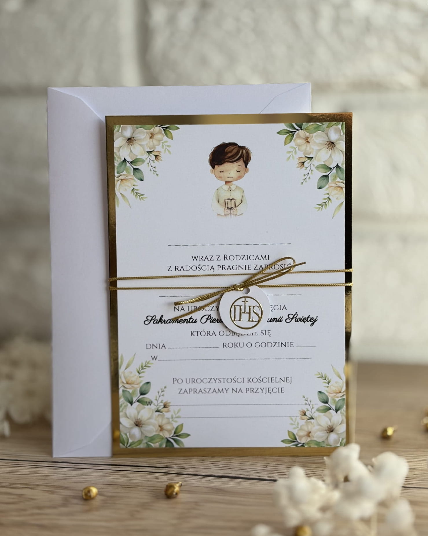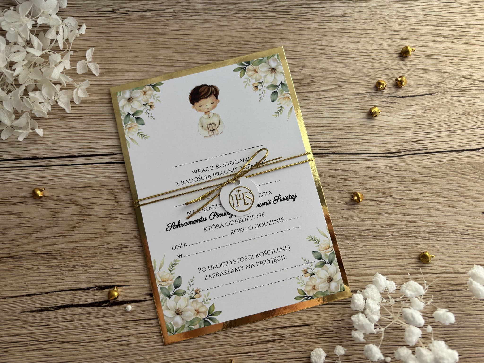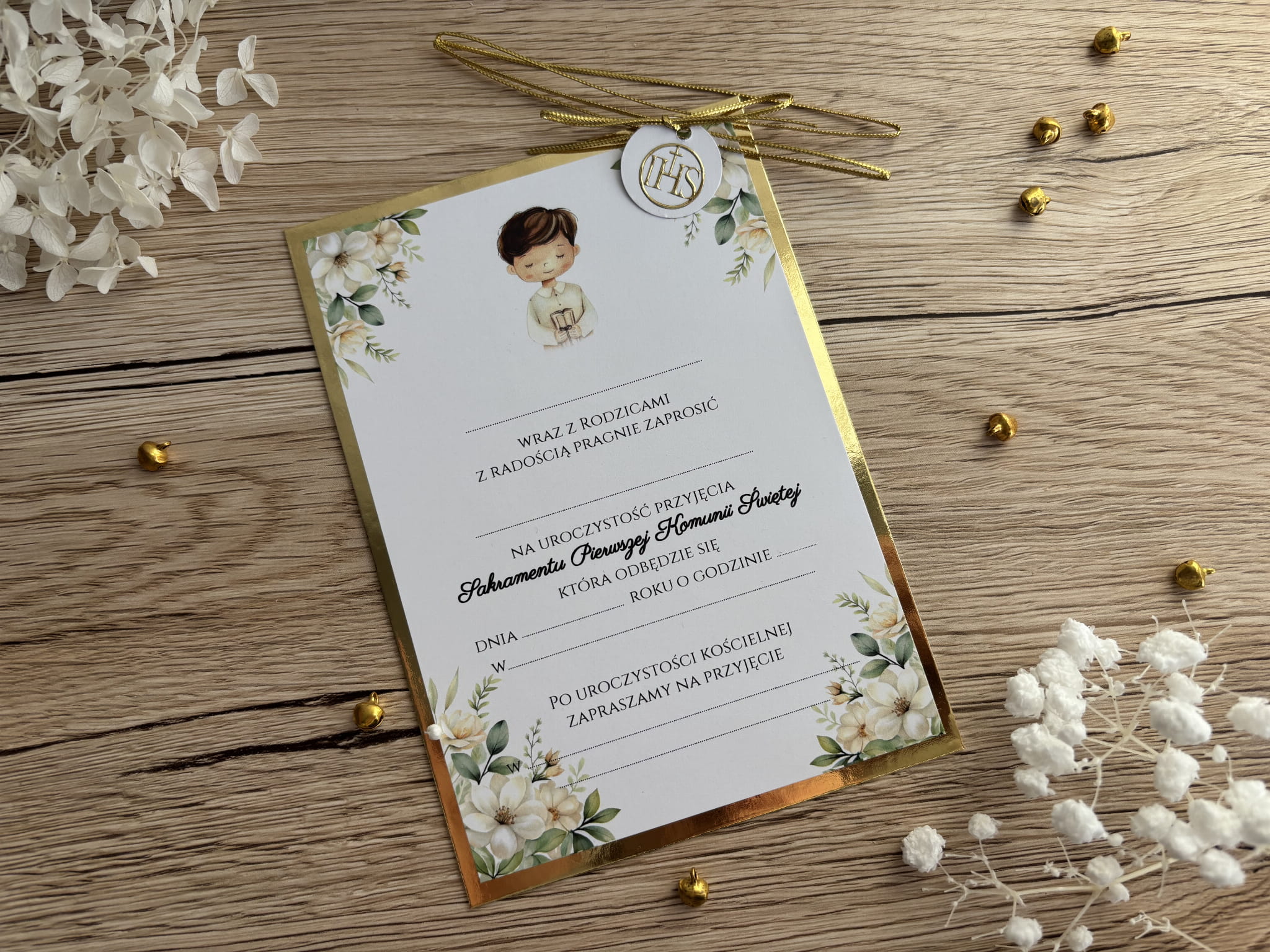 Zaproszenie na Komunię Świętą dla chłopca ze złotymi dodatkami