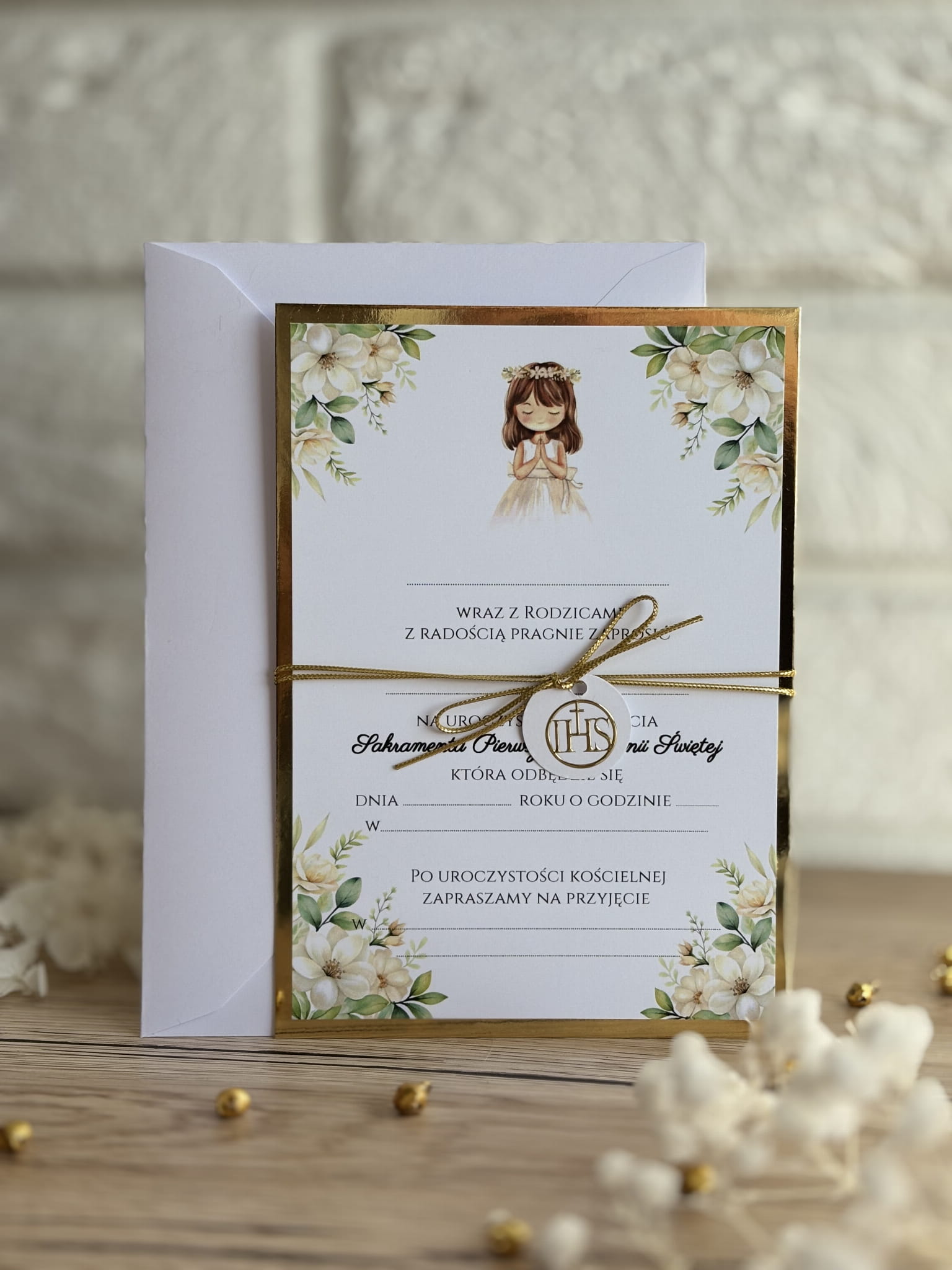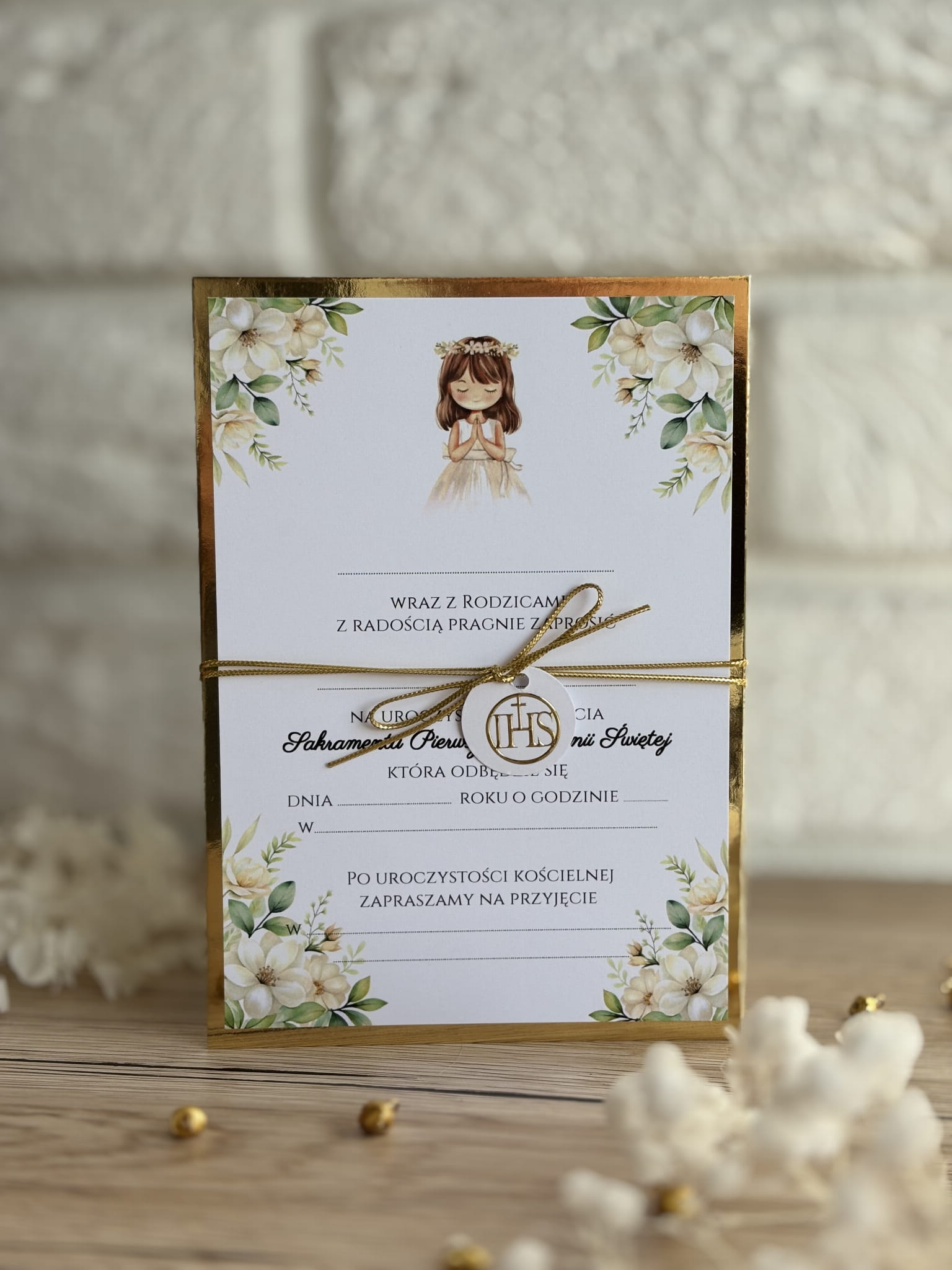 Eleganckie zaproszenie na Pierwszą Komunię Świętą w stylu klasycznym i delikatnym. Utrzymane w białych i złotych tonacjach, ozdobione subtelną grafiką dziewczynki w komunijnej sukience oraz kwiatowym motywem magnolii. Całość oprawiona w złotą ramkę i przewiązana złotym sznurkiem z medalikem IHS, który dodaje wyjątkowego, sakralnego charakteru.