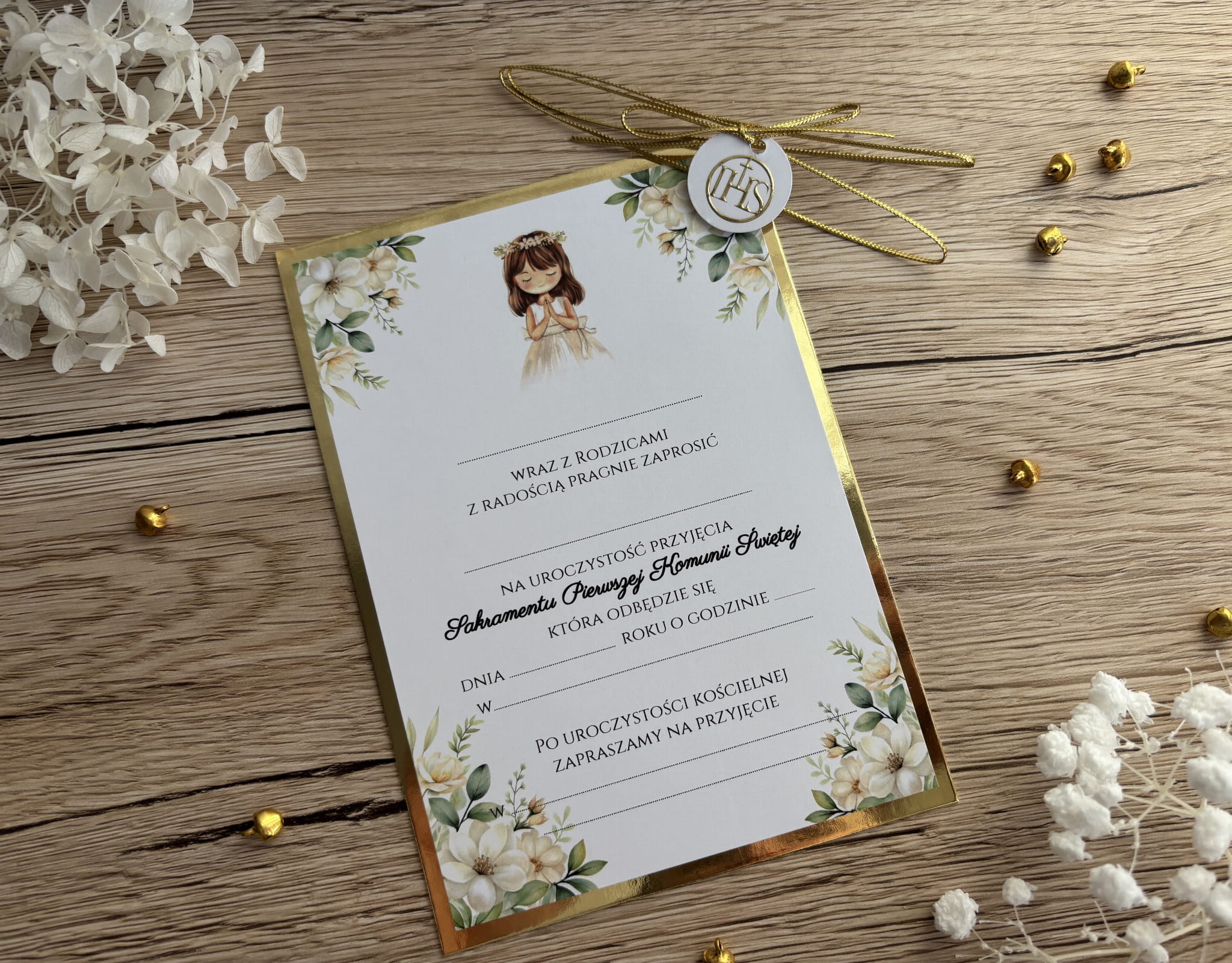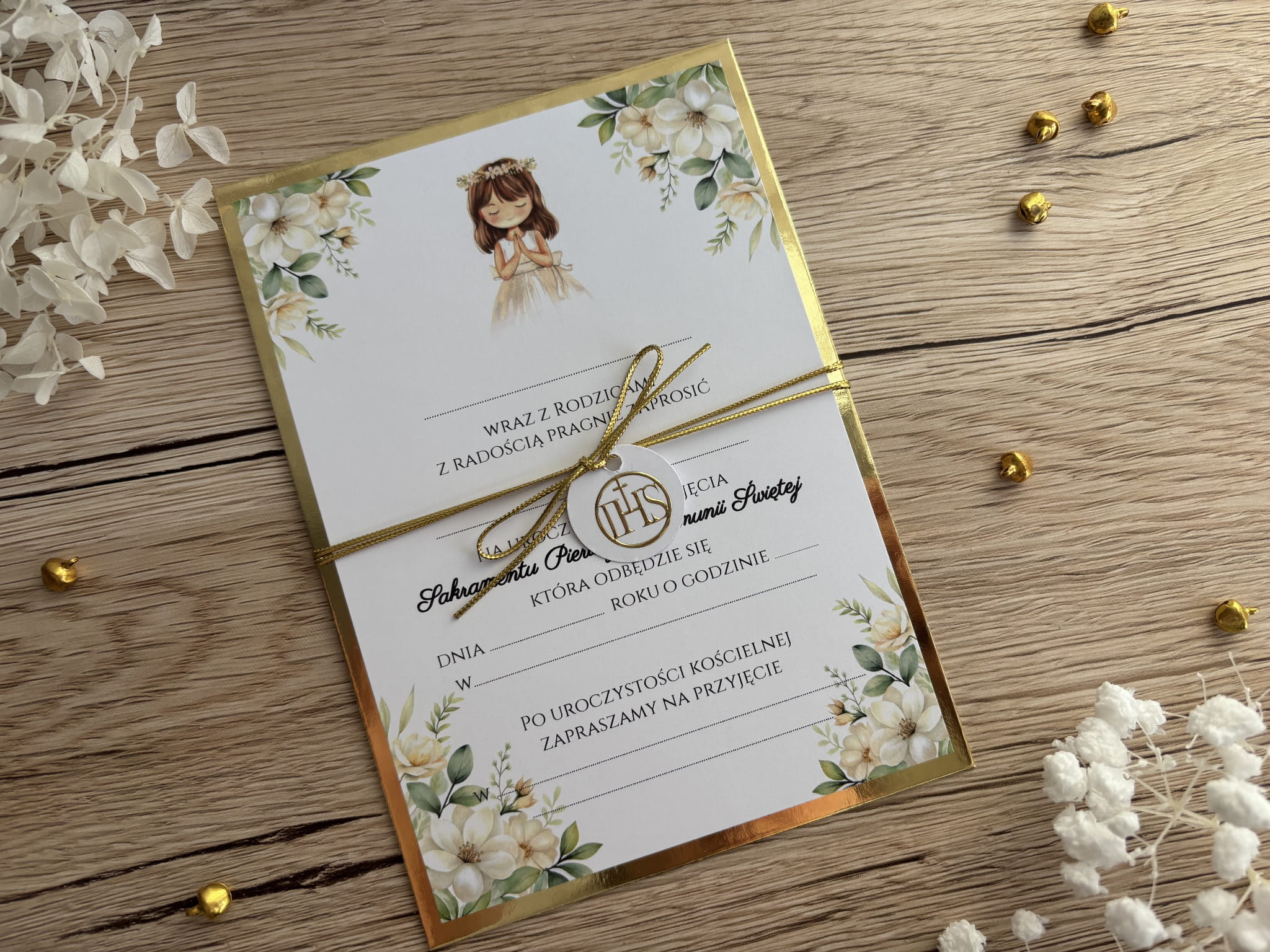 Zaproszenie na Komunię Świętą dla dziewczynki ze złotymi dodatkami
