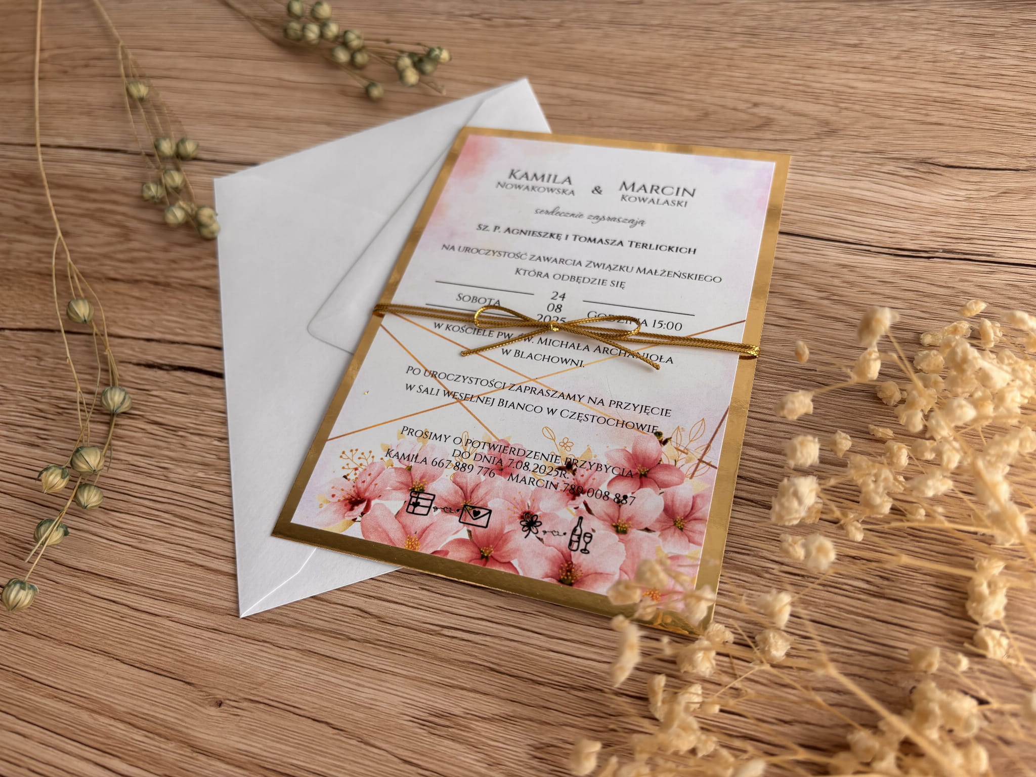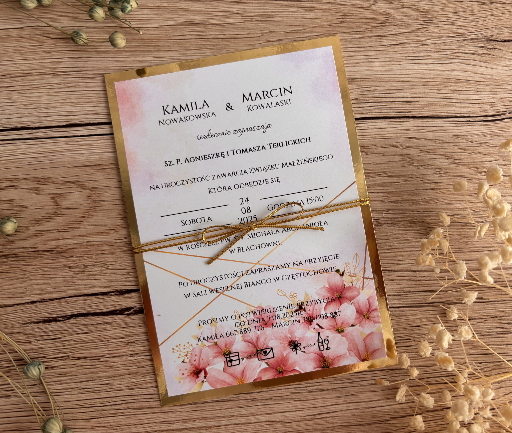 Zaproszenie ślubne z kwiatami różowymi i złotym sznurkiem